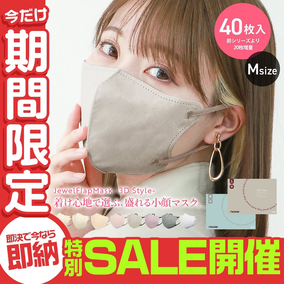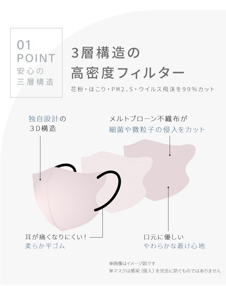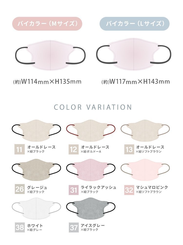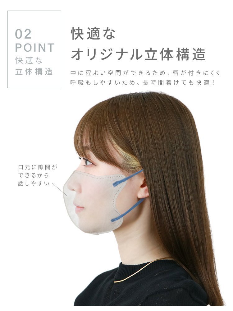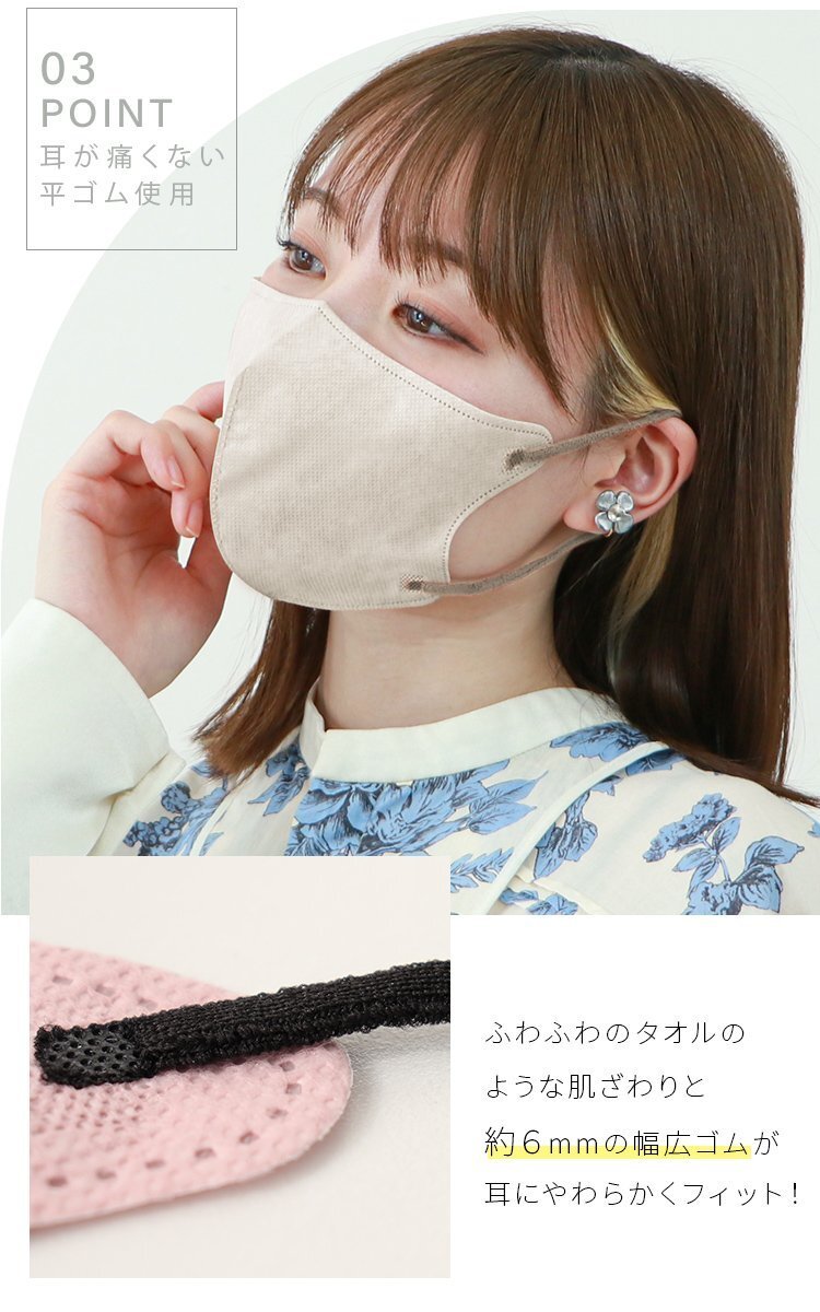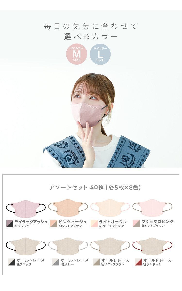 \ 大容量40枚タイプが新登場 / フェイスラインの美シルエットでおしゃれに可愛く、スマートに! 普段使いできる「盛れる小顔不織布マスク」。 【商品詳細】 ◆内容:立体マスク40枚入 ◆カラー:アソートセット(各色単体での販売は未定です) ◆サイズ(約)※折りたたみ時 Mサイズ:幅114mm×高さ135mm 【注意事項】 ※衛生用品のため、返品・交換はできません ※ヤマト運輸・日本郵便・佐川急便で配送します ※配送業者はお選びいただけません ※2点まではネコポスorゆうパケットでの発送となります ※3点以上の場合、一部地域に中継料が発生します ※置き配サービスはご利用いただけません (不織布マスク 使い捨てマスク 使い捨て 冷感マスク 3Dマスク 3D 5D 立体 立体構造 99%カットフィルター 肌に優しい 耳が痛くない バイカラーマスク 両面同色 血色マスク 血色カラーマスク 血色カラー くすみカラー 新色 グレージュ カラーマスク 冷感 接触冷感 ひんやり 女性 男性 おしゃれ 人気) |