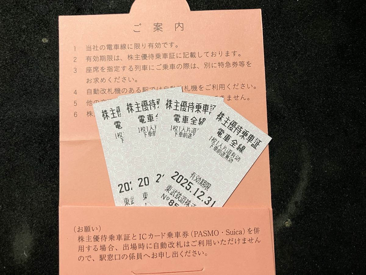 東武鉄道全線有効の株主優待乗車証4枚の出品です。有効期限2025年12月31日までの東武線片道の乗車券が無料となります。ビジネスに観光に利用して下さい。送料は普通郵便にて当方負担にてお送りします。合計4枚の落札金額を入力して下さい。
