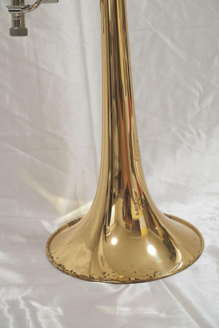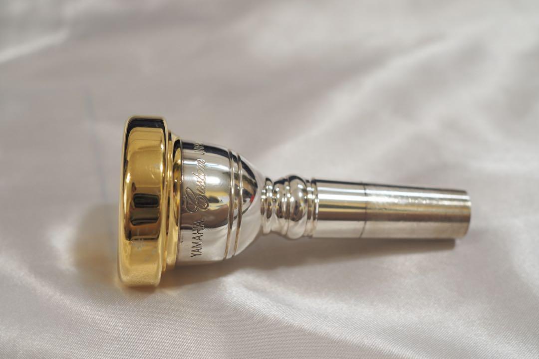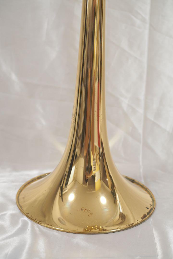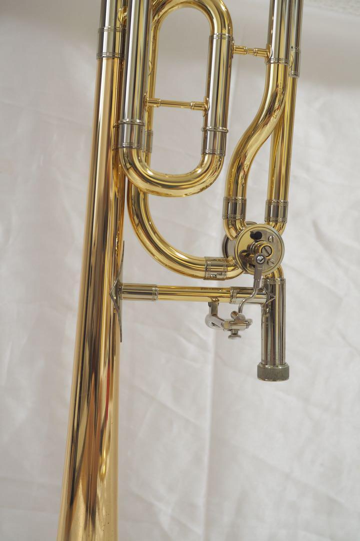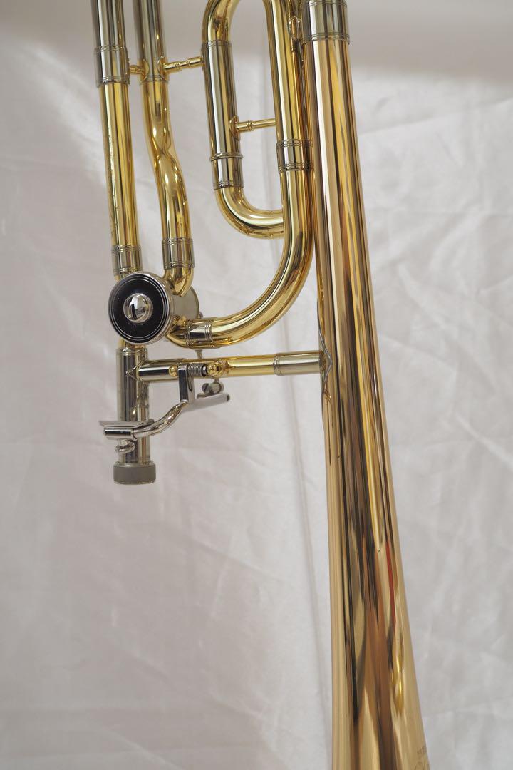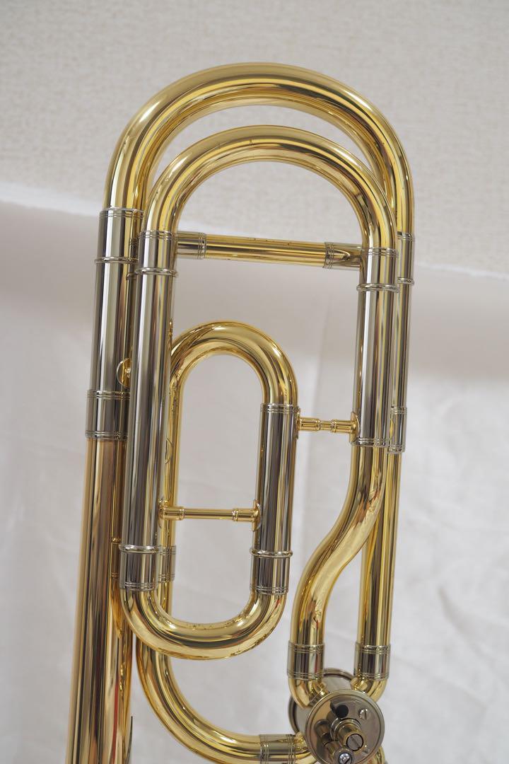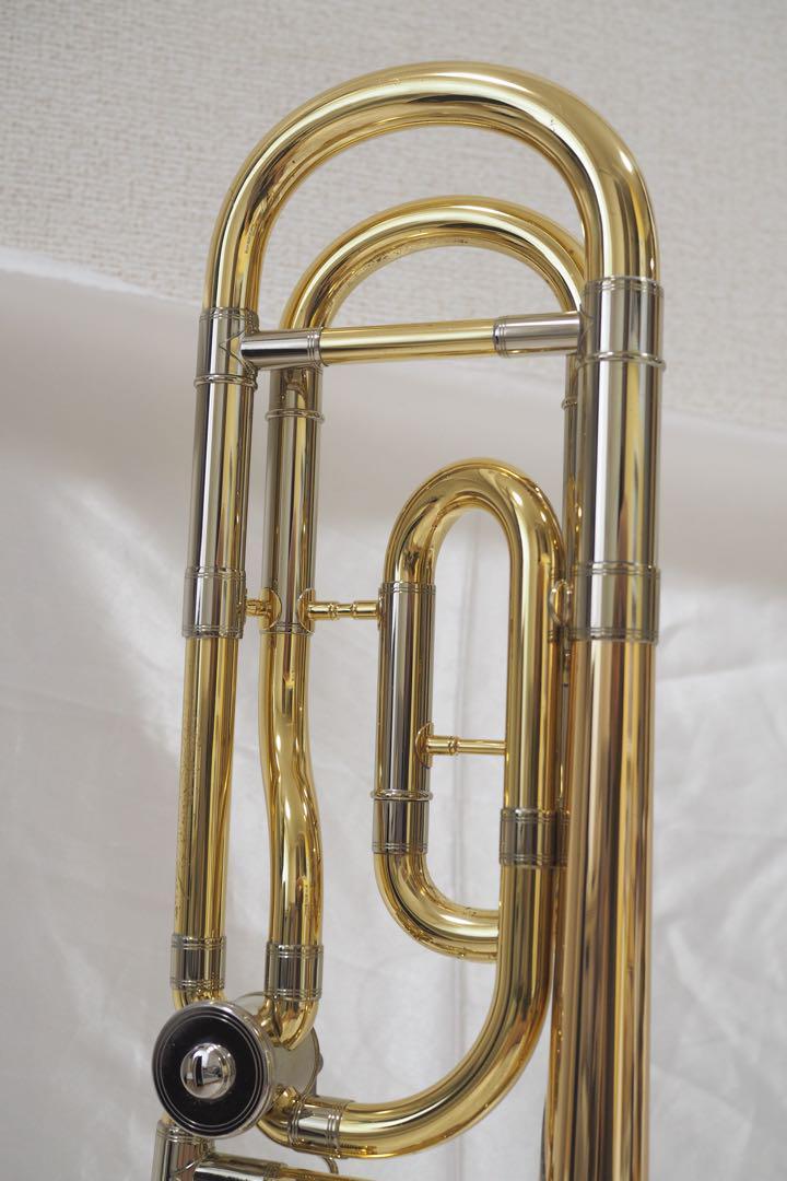 ベルはゴールドブラス一枚取り直径216mm、スライド外管はイエローブラス、スライド内管は洋白、ボアサイズは太管13.89mm、クリアラッカー仕上げ。