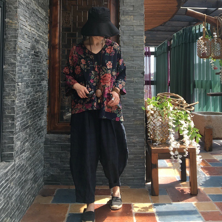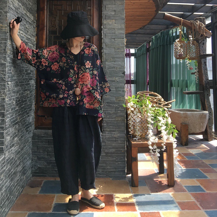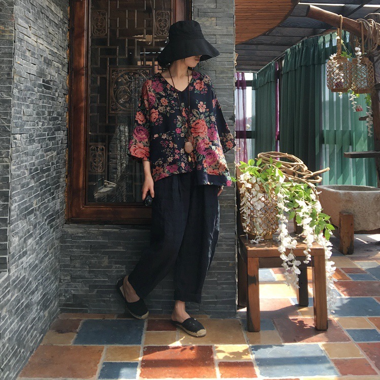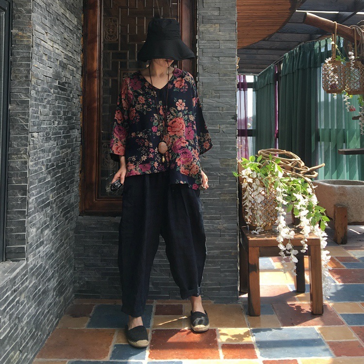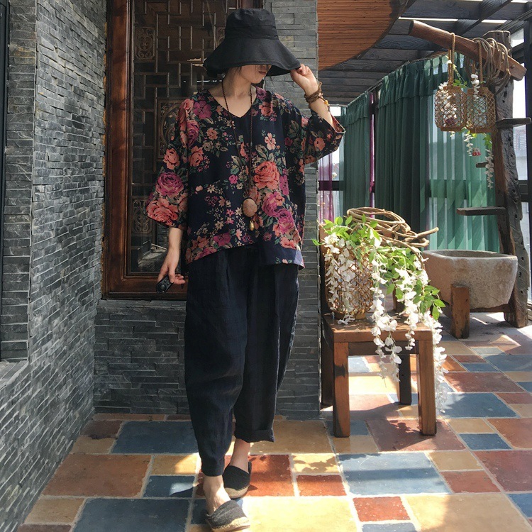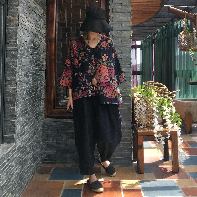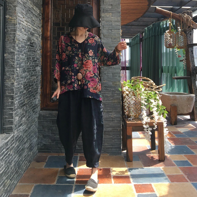人気品花柄 Vネック ネイビー チュニック 襤褸 アンティーク風 洋服ミックス ロマンファッション ポップ ゆったり 綿100%コットン