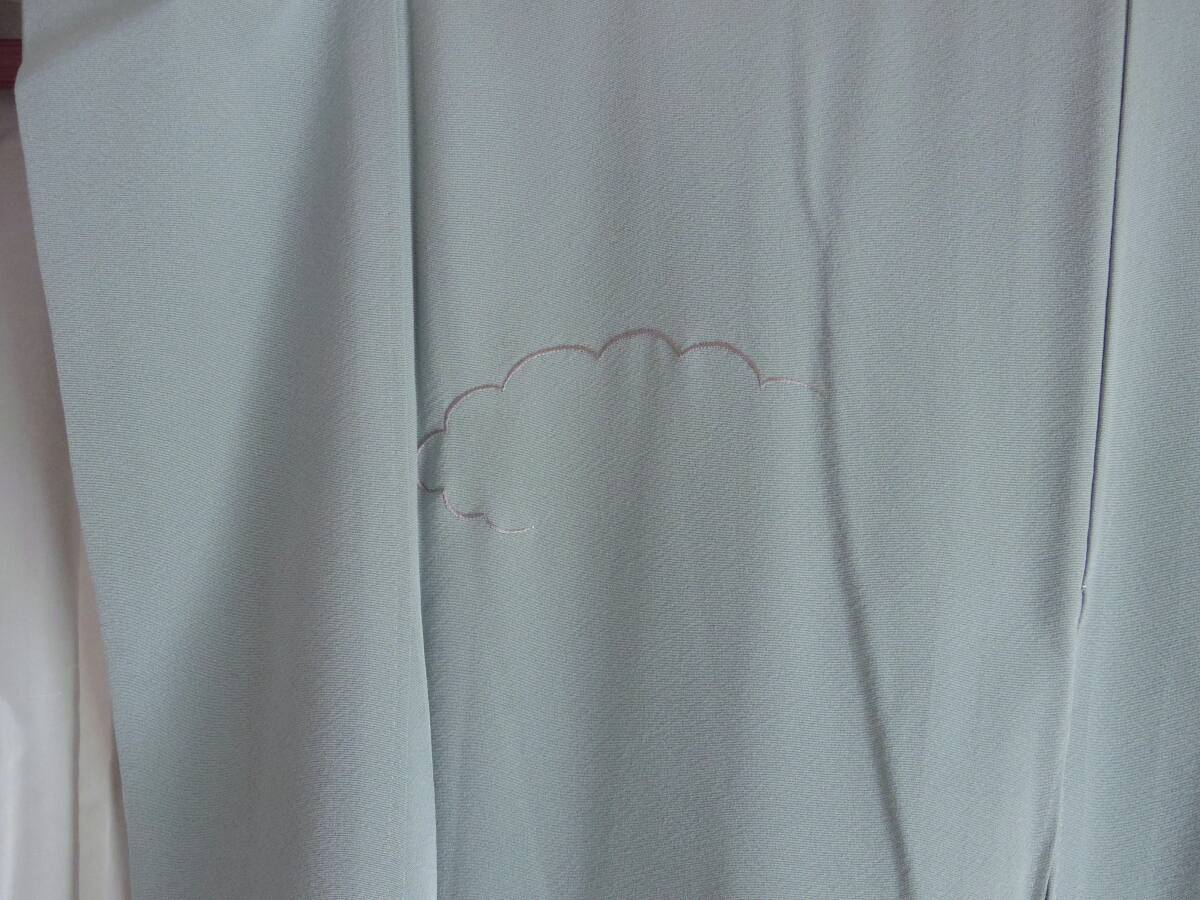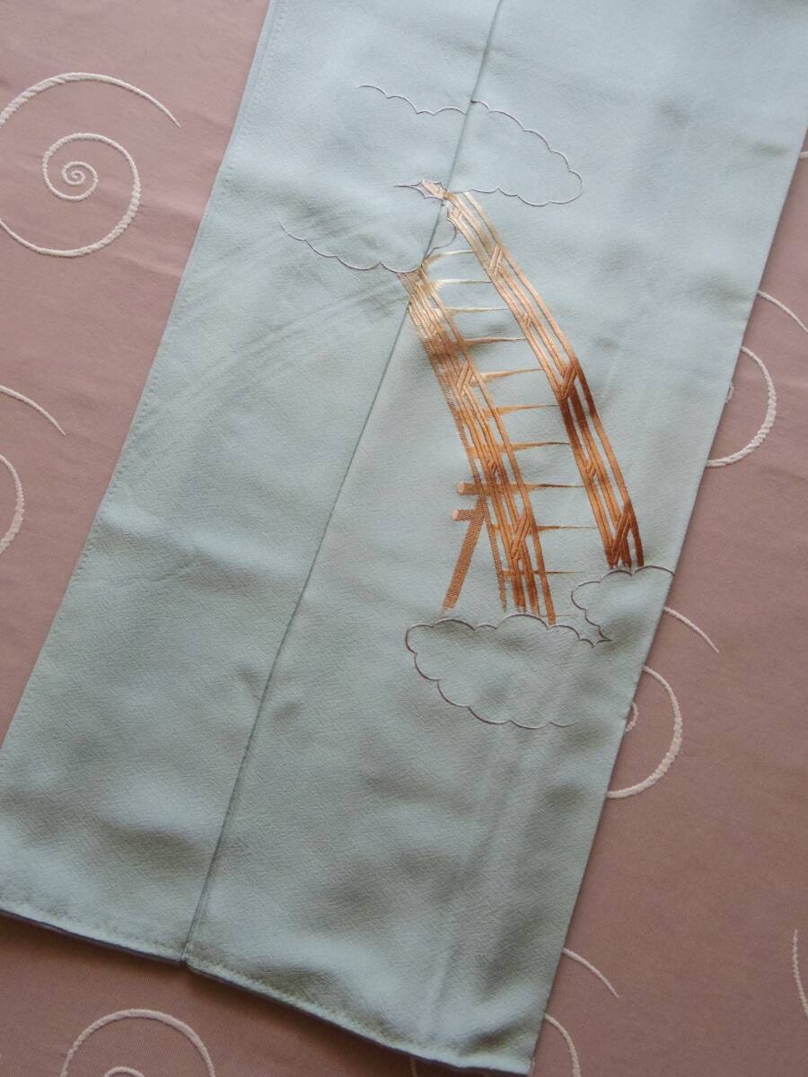 少しグレーががかったような薄い青緑色の地に、雲と橋が刺繍されています。