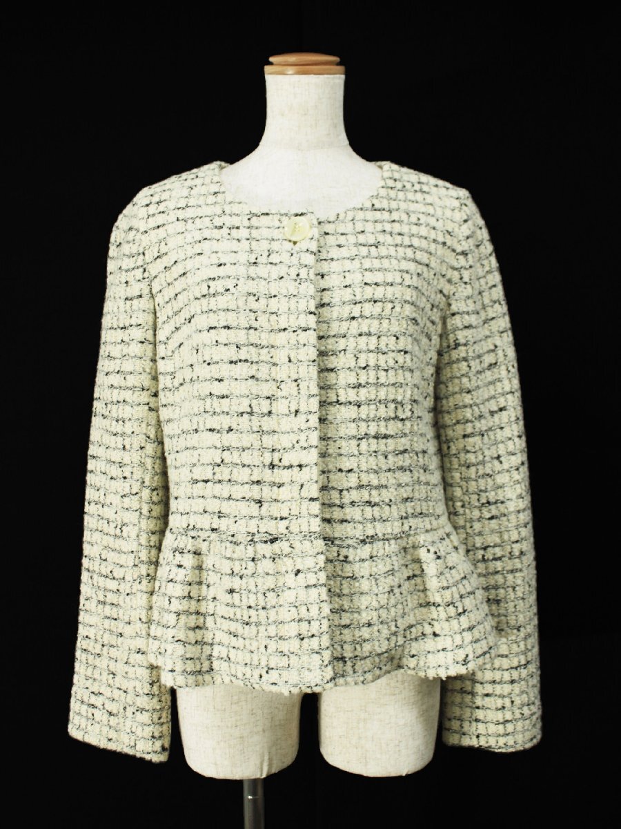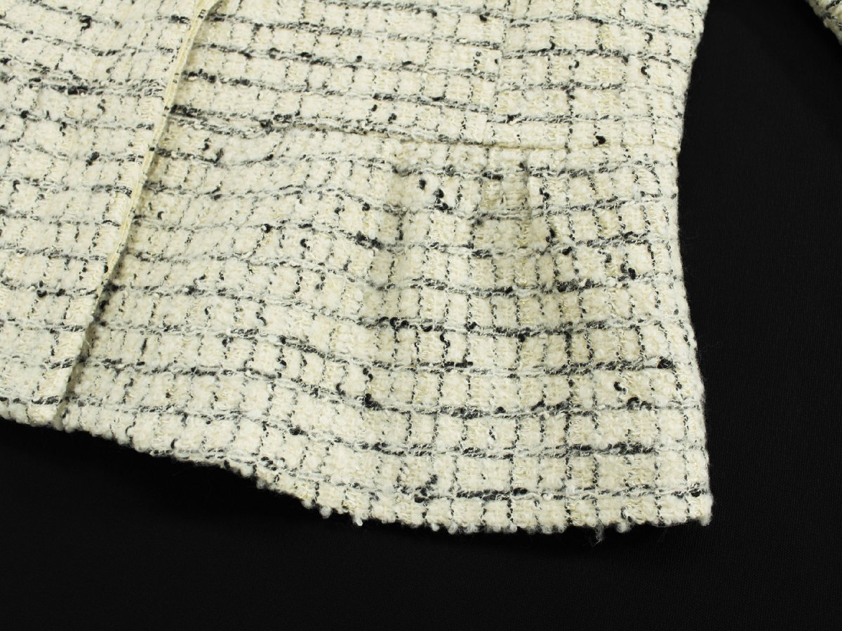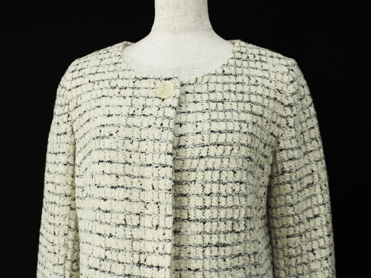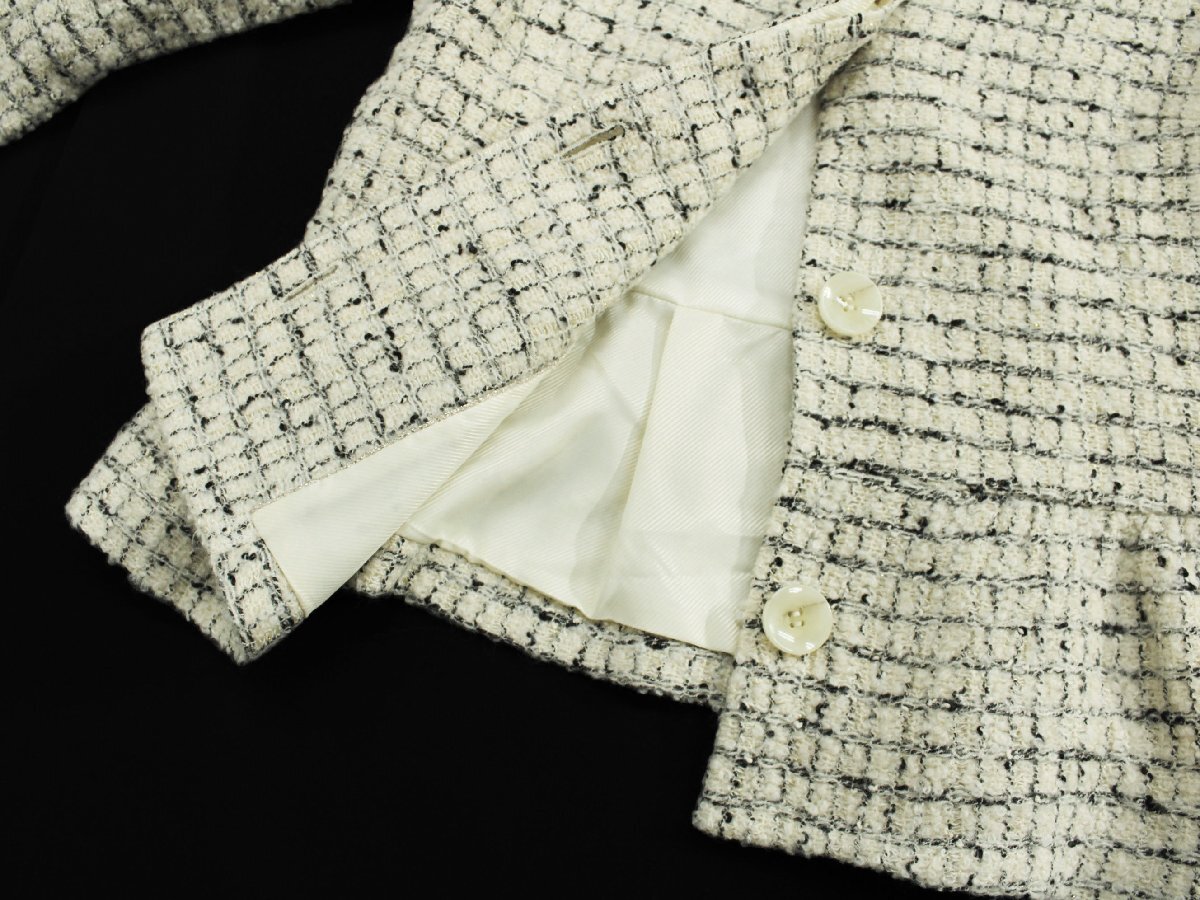 美品 MKミッシェルクラン ウール混長袖ノーカラーツイードジャケット オフホワイト黒40 an171
