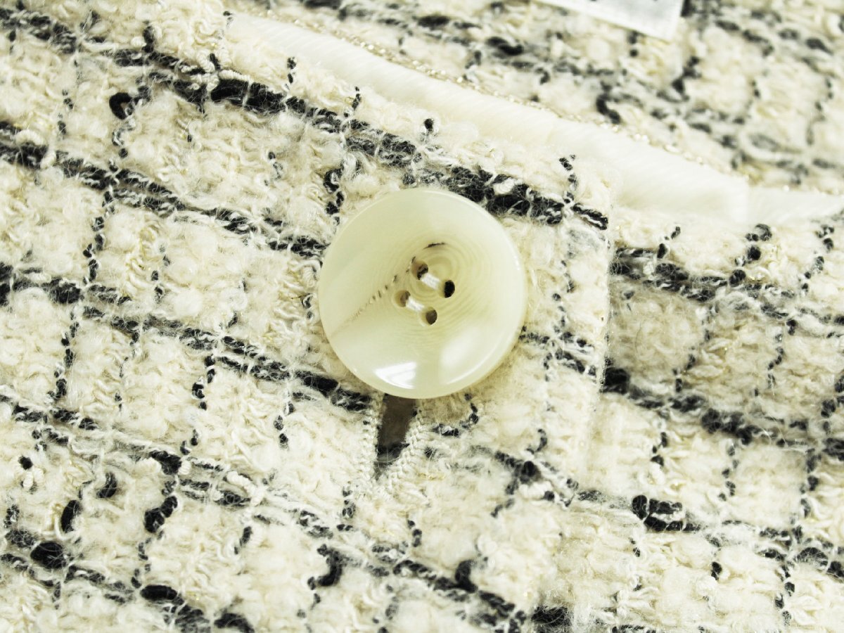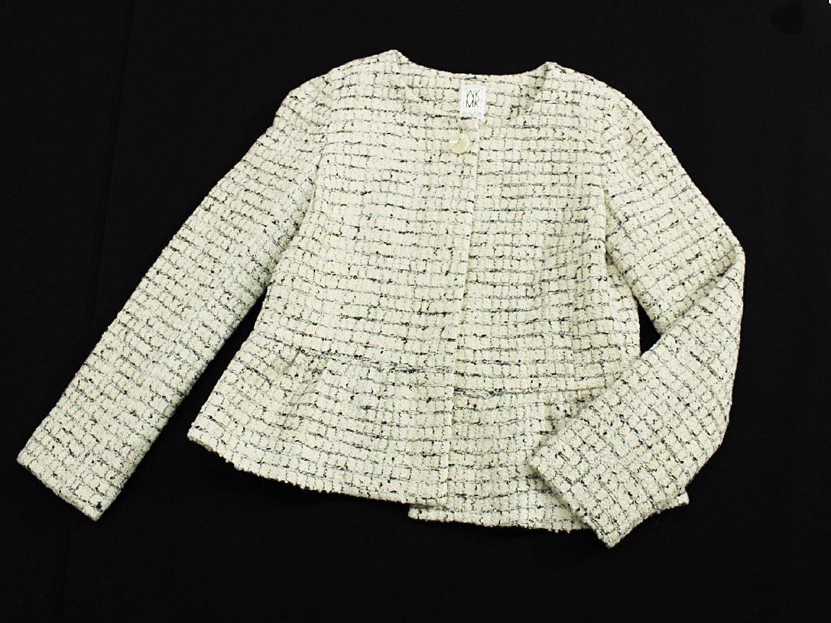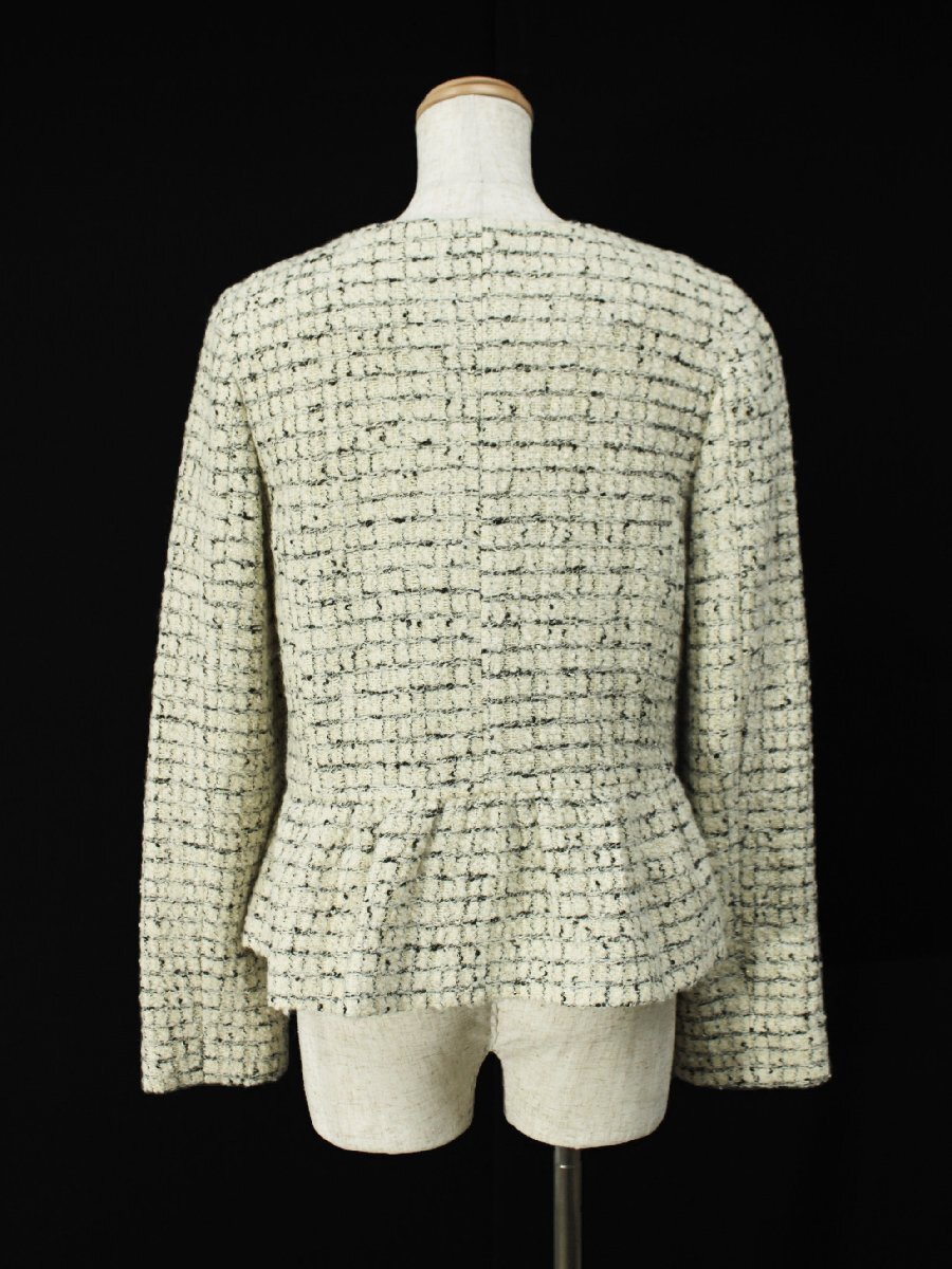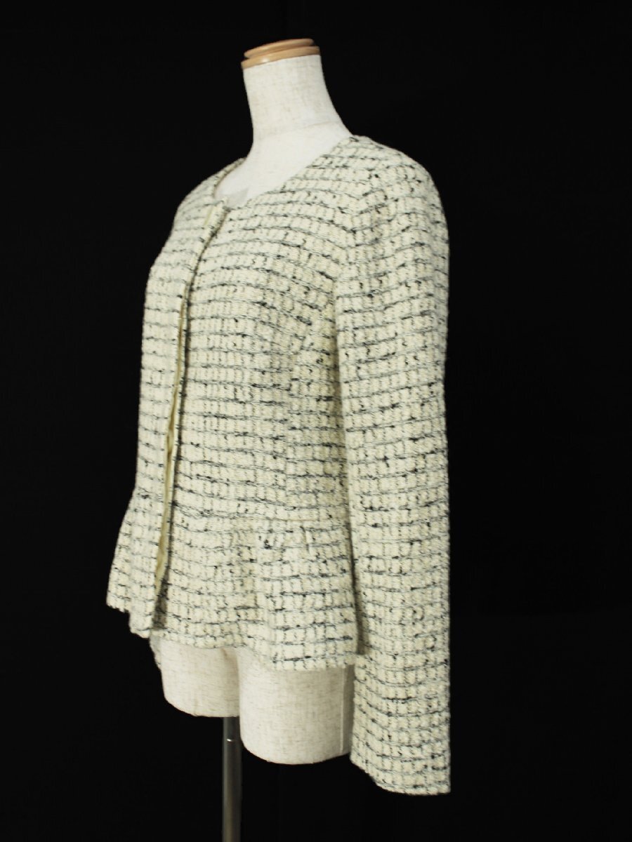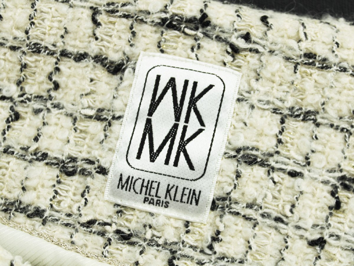 美品 MKミッシェルクラン ウール混長袖ノーカラーツイードジャケット オフホワイト黒40 an171