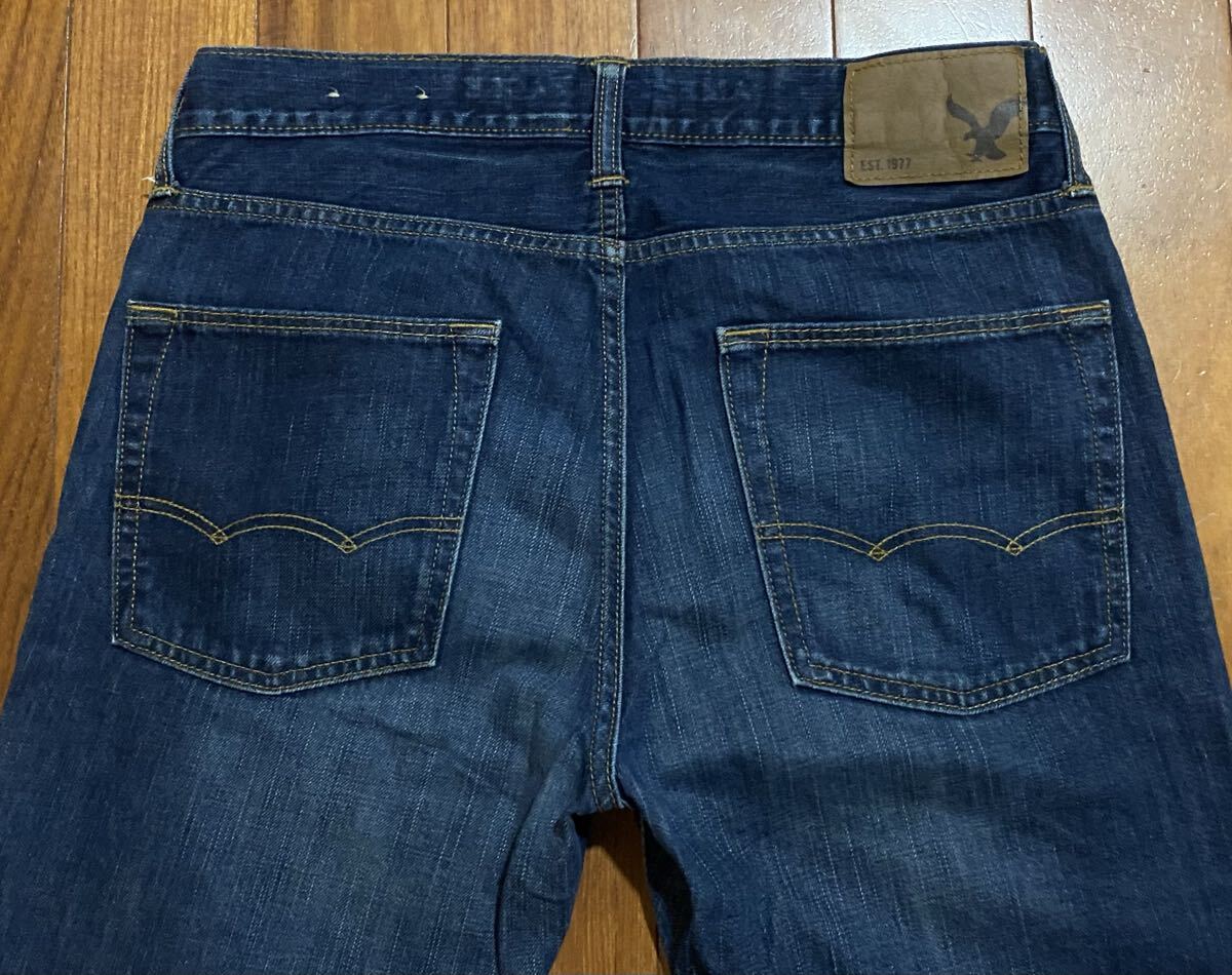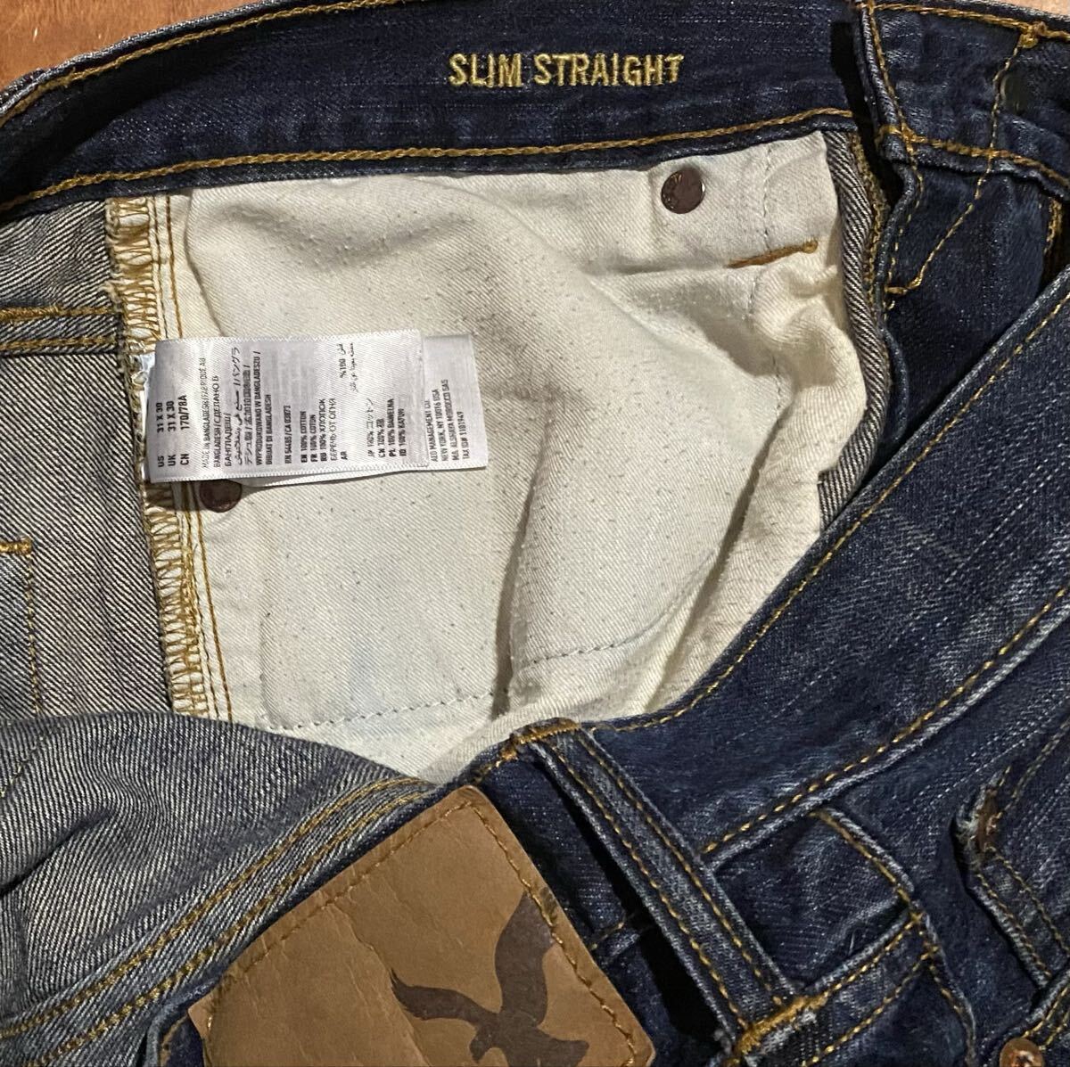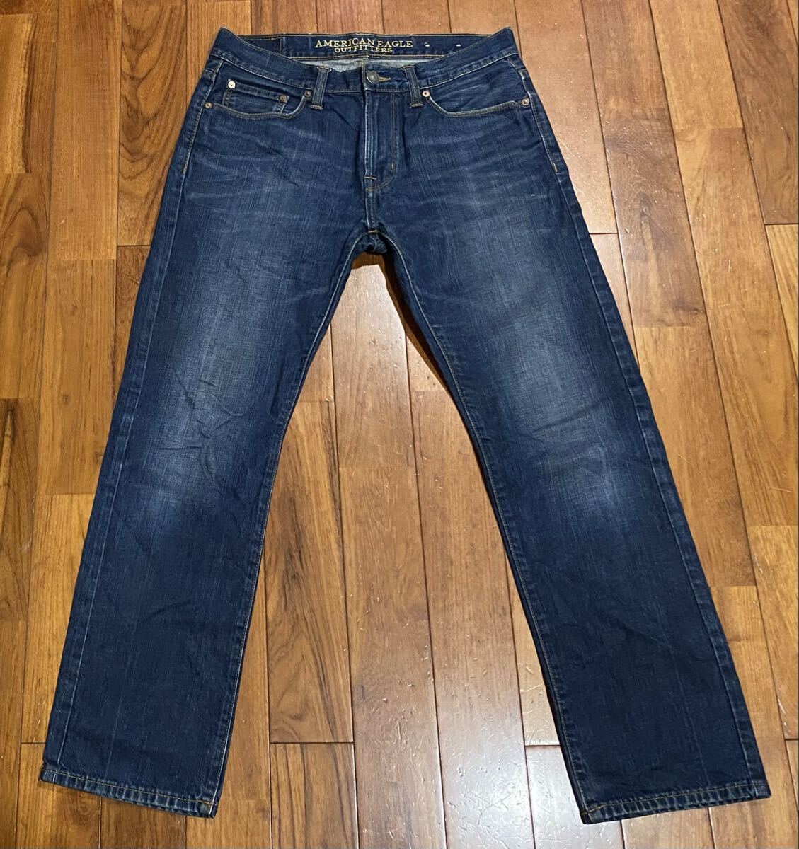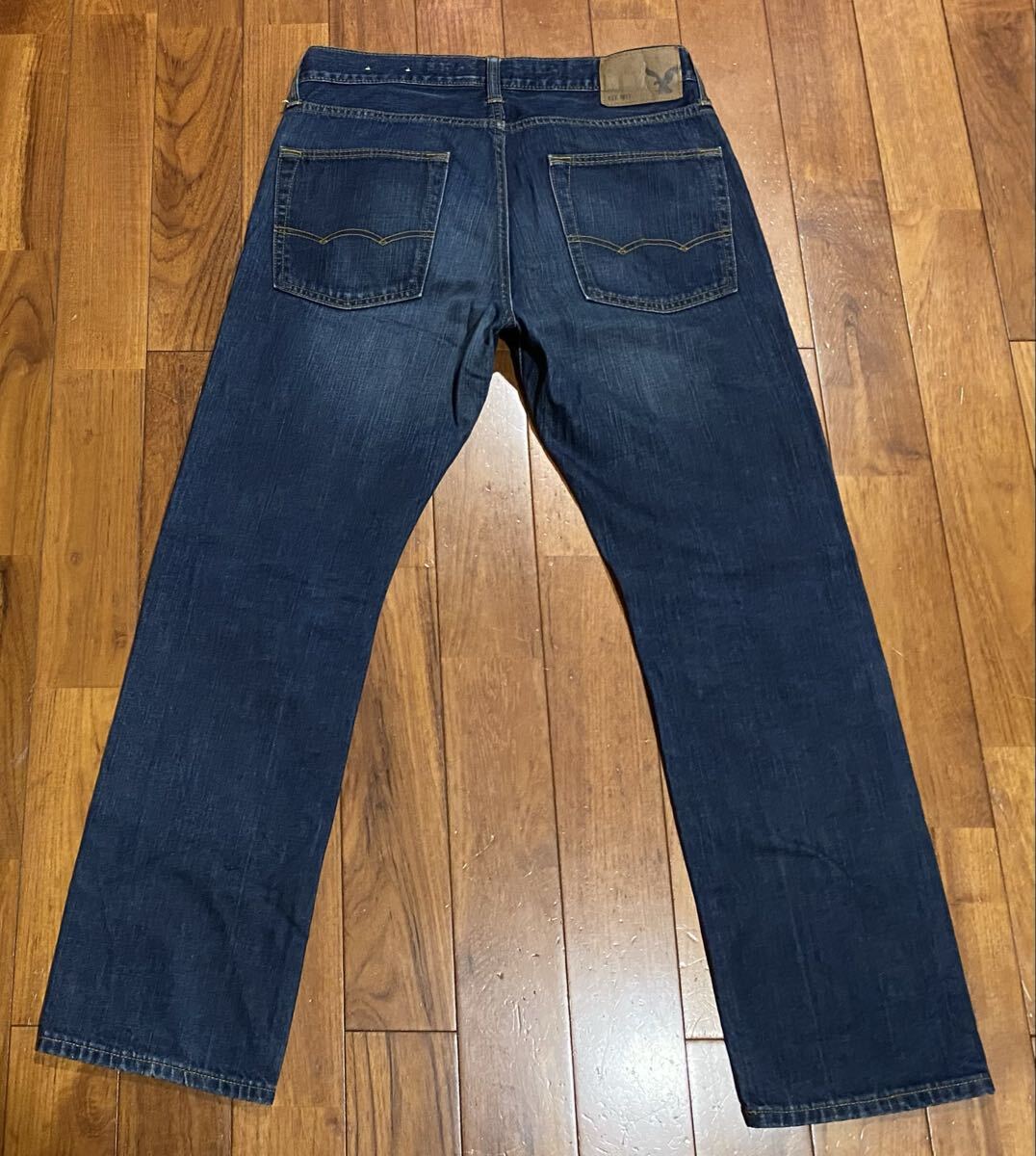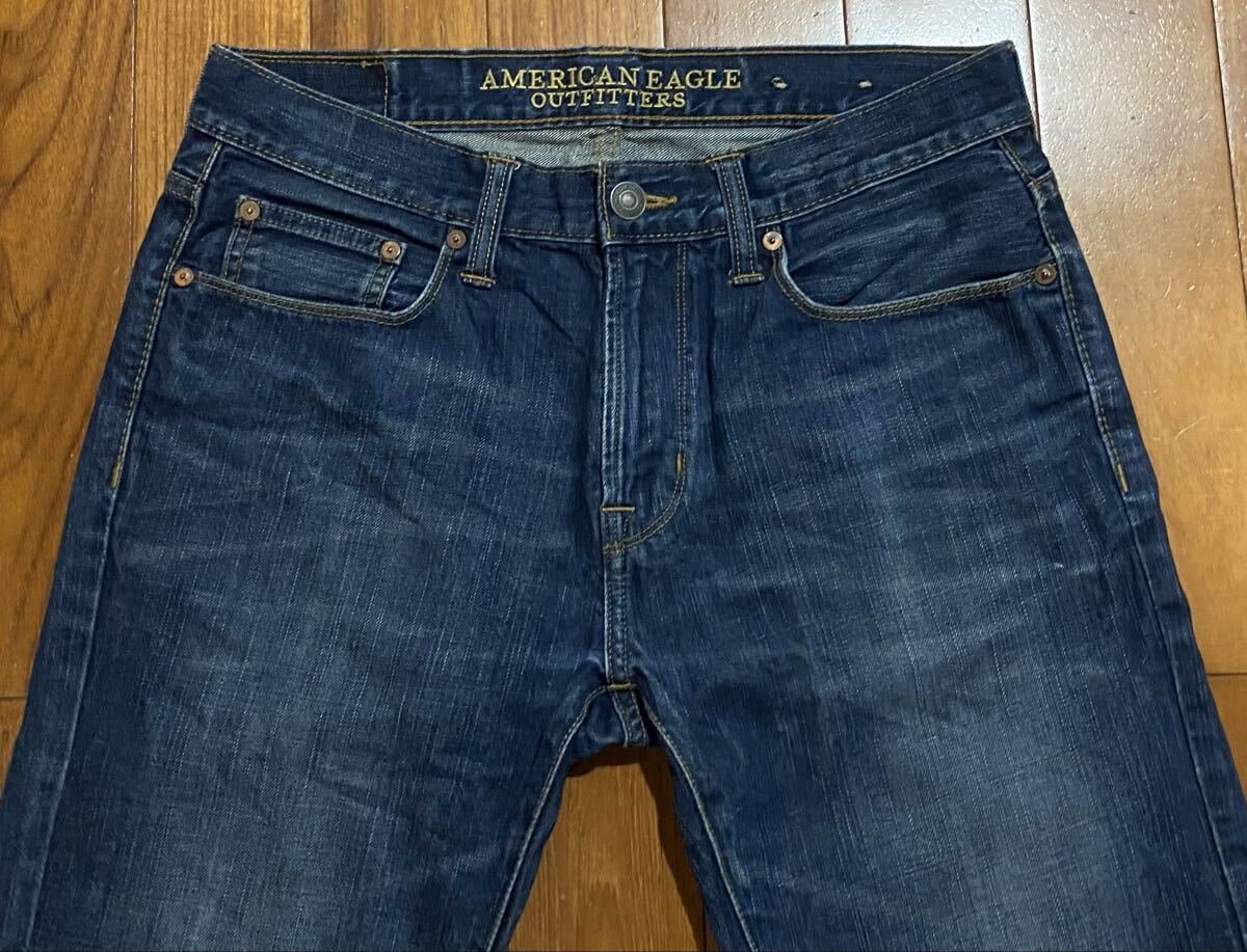 アメリカンイーグルのデニム(ジーンズ)、SLIM STRAIGHTです。色はインディゴブルーです。USEDですが状態は良いです(10段階中8程度)。生地はコットン100%です。紙パッチ、ジッパーフライ、裾はチェーンステッチです。正規品です((株)イーグルリテイリング、バングラデシュ製)。サイズはW31×L30でウエストは重ねずに平置きで約80cm、ヒップ約100cm、股上約25cm、股下約73cm、股下15cmのふともも部分約50cm、裾まわり約38cm、重量約570gです。発送はゆうパケットポストになります。