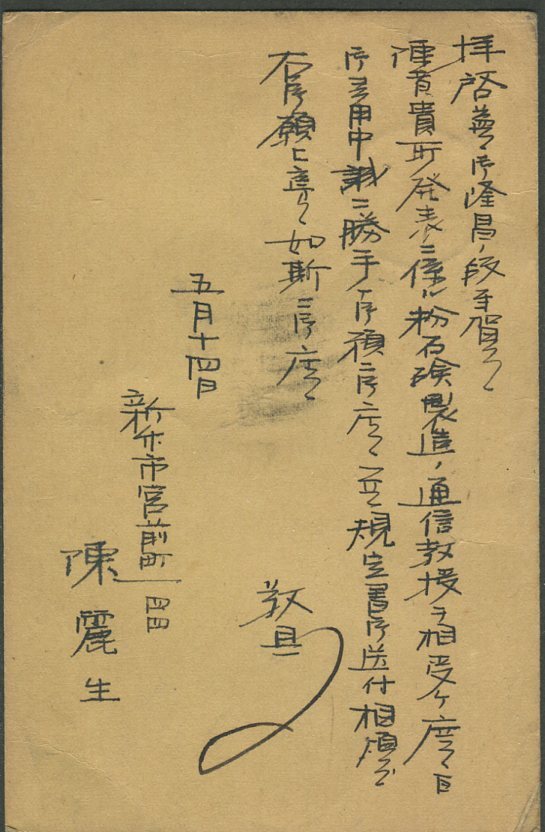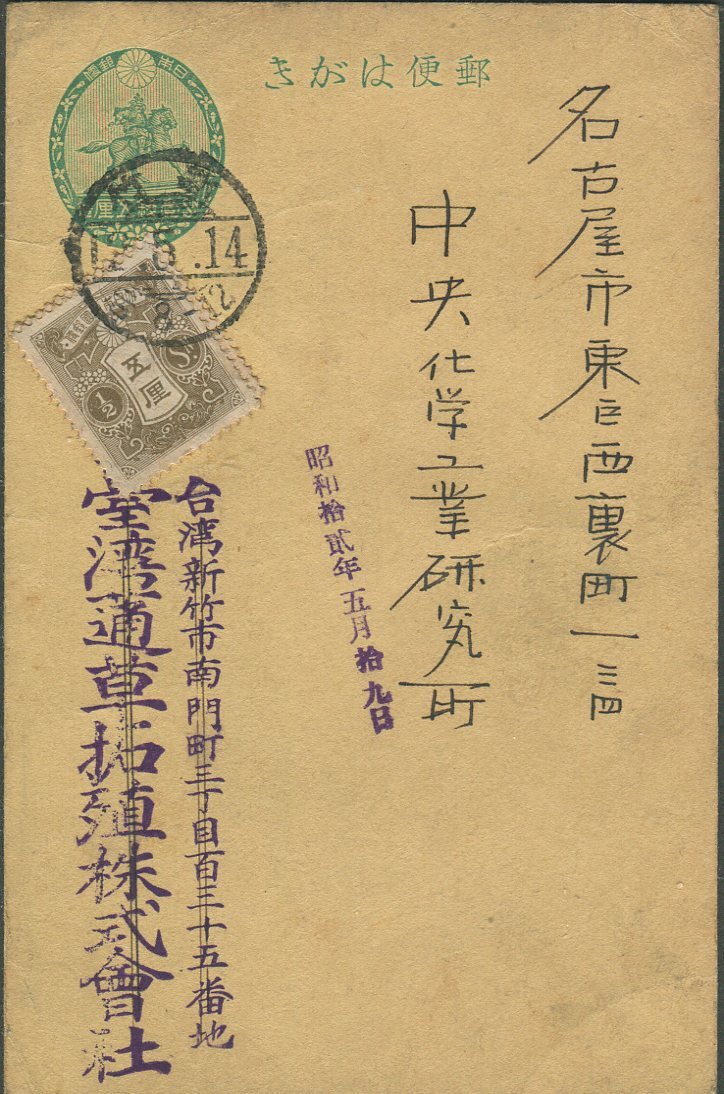 〇台湾印 新竹 12.5.14→名古屋 新毛1/2銭貼