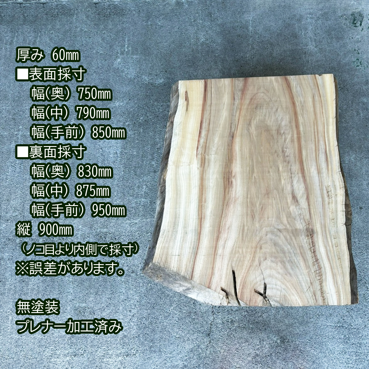 | 【サイズ】 | 厚み 60㎜ ■表面採寸 幅(奥) 750㎜ 幅(中) 790㎜ 幅(手前) 850㎜ ■裏面採寸 幅(奥) 830㎜ 幅(中) 875㎜ 幅(手前) 950㎜ 縦 900㎜ ノコ目より内側で採寸しています。 1枚 ※若干誤差がある場合があります。 |
