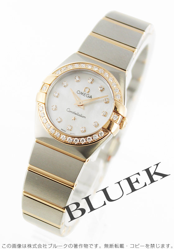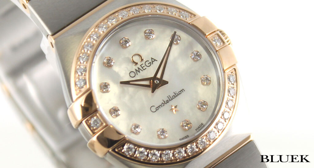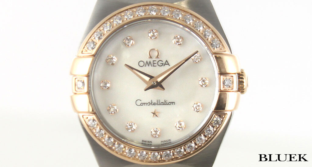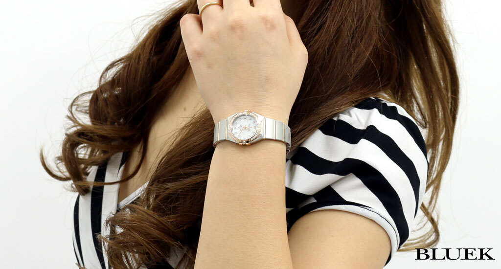 | 18Kレッドゴールド製ベゼルに28粒(0.34ct)、ホワイトシェルダイヤルにも12粒(0.03ct)のダイヤモンド煌めく厚さ8ミリの24ミリ100m防水ケース&ブレス小ぶりなサイズも女性らしいコンステレーションは、“4つの爪”が掴んだベゼルの佇まいにも気品溢れるコンビデザインが女性を手元からラグジュアリーに彩るオメガ人気のタイムピース。レッドゴールド指針には蛍光塗料が塗布されて暗所でも視認性を発揮します。中でもつくりもタフな100m防水ケースも使い勝手に優れるこのモデルは、プッシュ式の両開きバックルも魅力。高い実用性と洗練されたコンビデザインが幅広い装いにマッチしてオンオフ活躍します。 |