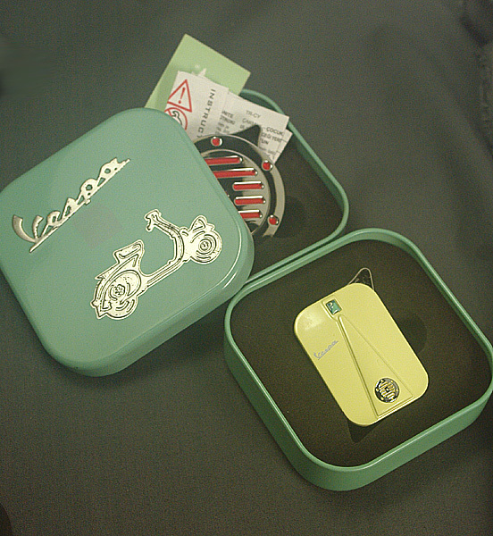 説明書付きVespa缶ケース(上蓋、小シール剥がし跡あり)。