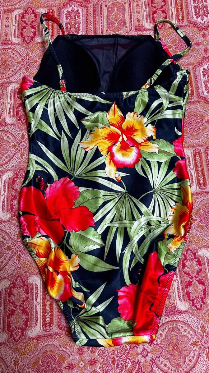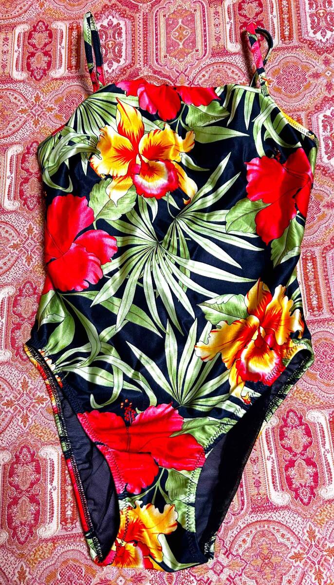 水着は黒字に赤と緑と黄色で大きな南国的な花が描かれています。ポリエステルとポリウレタンの混合素材。