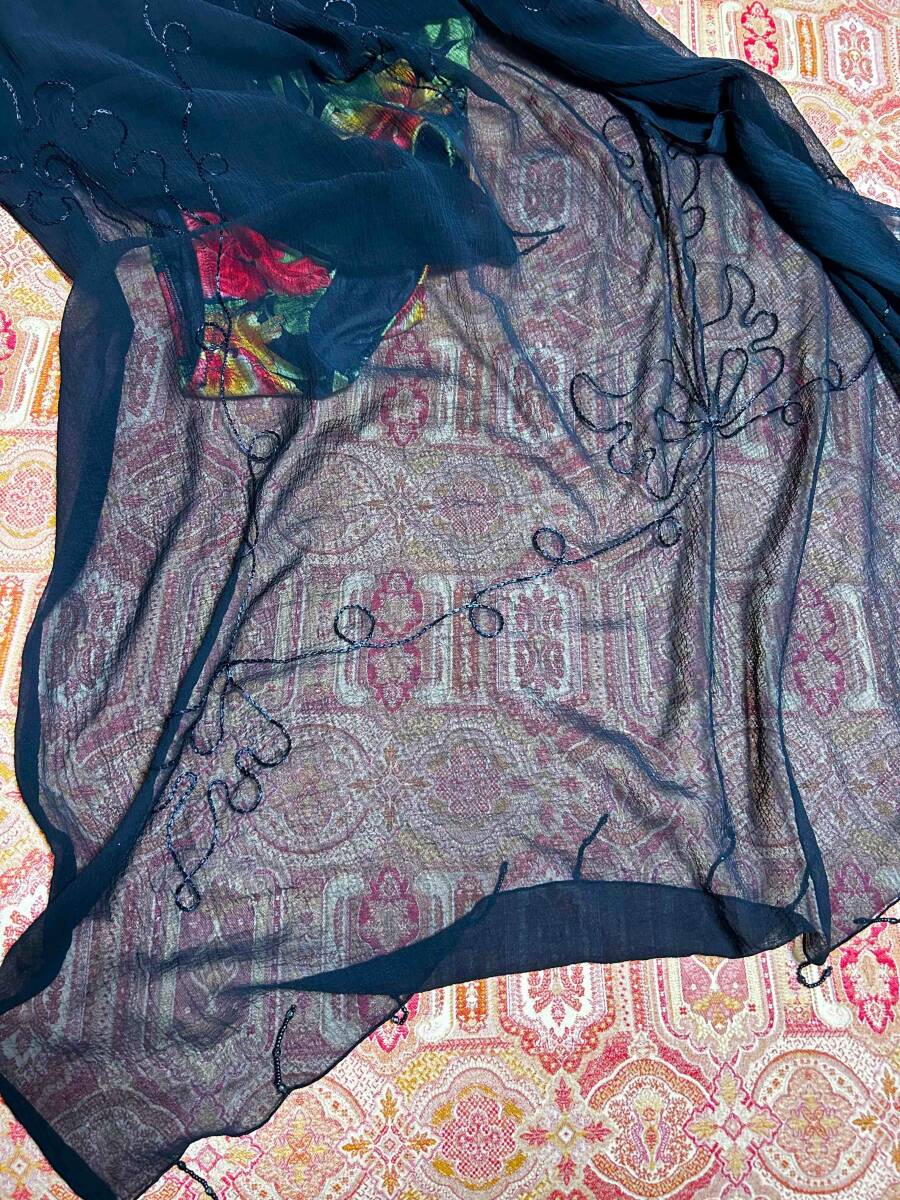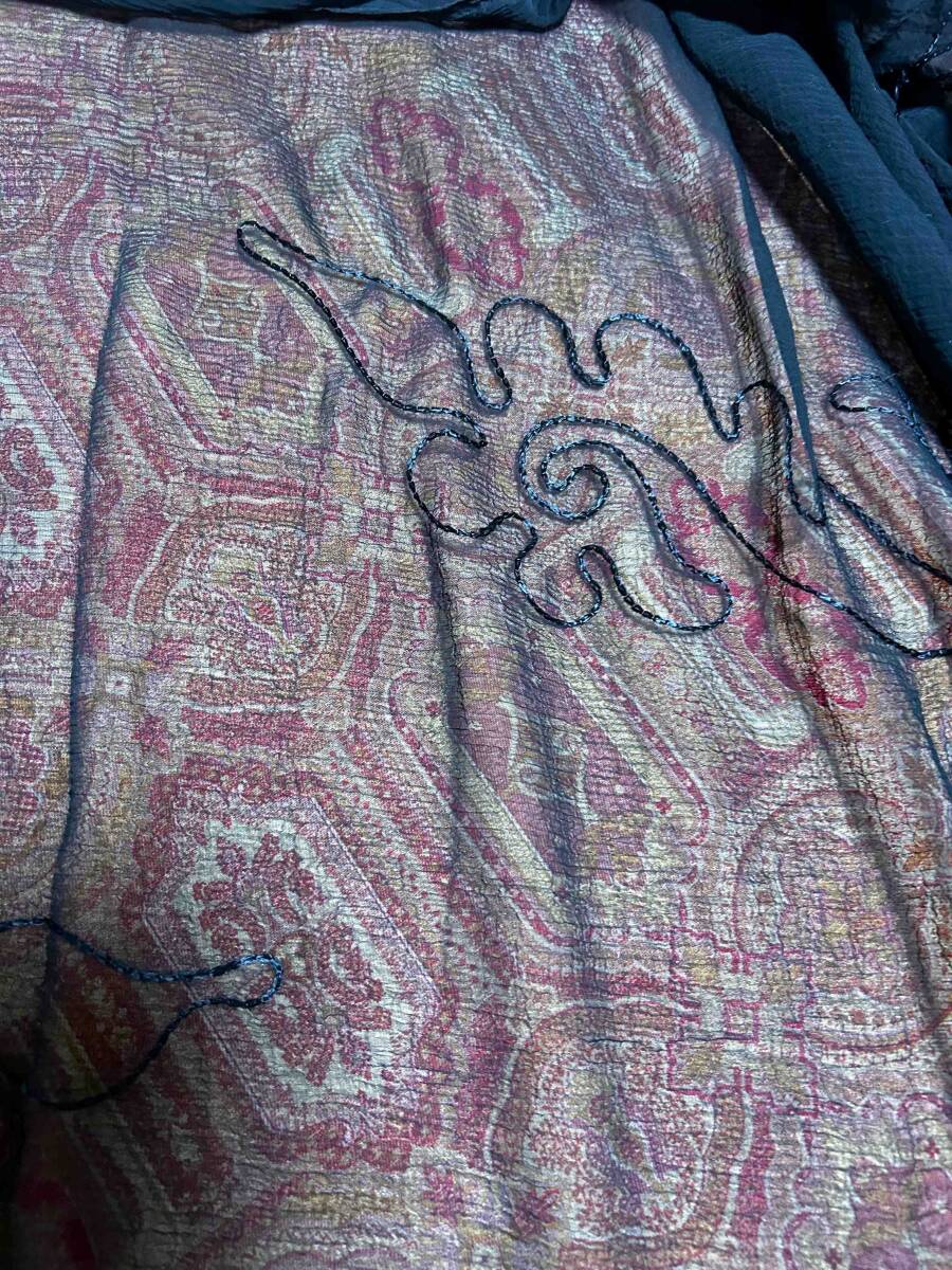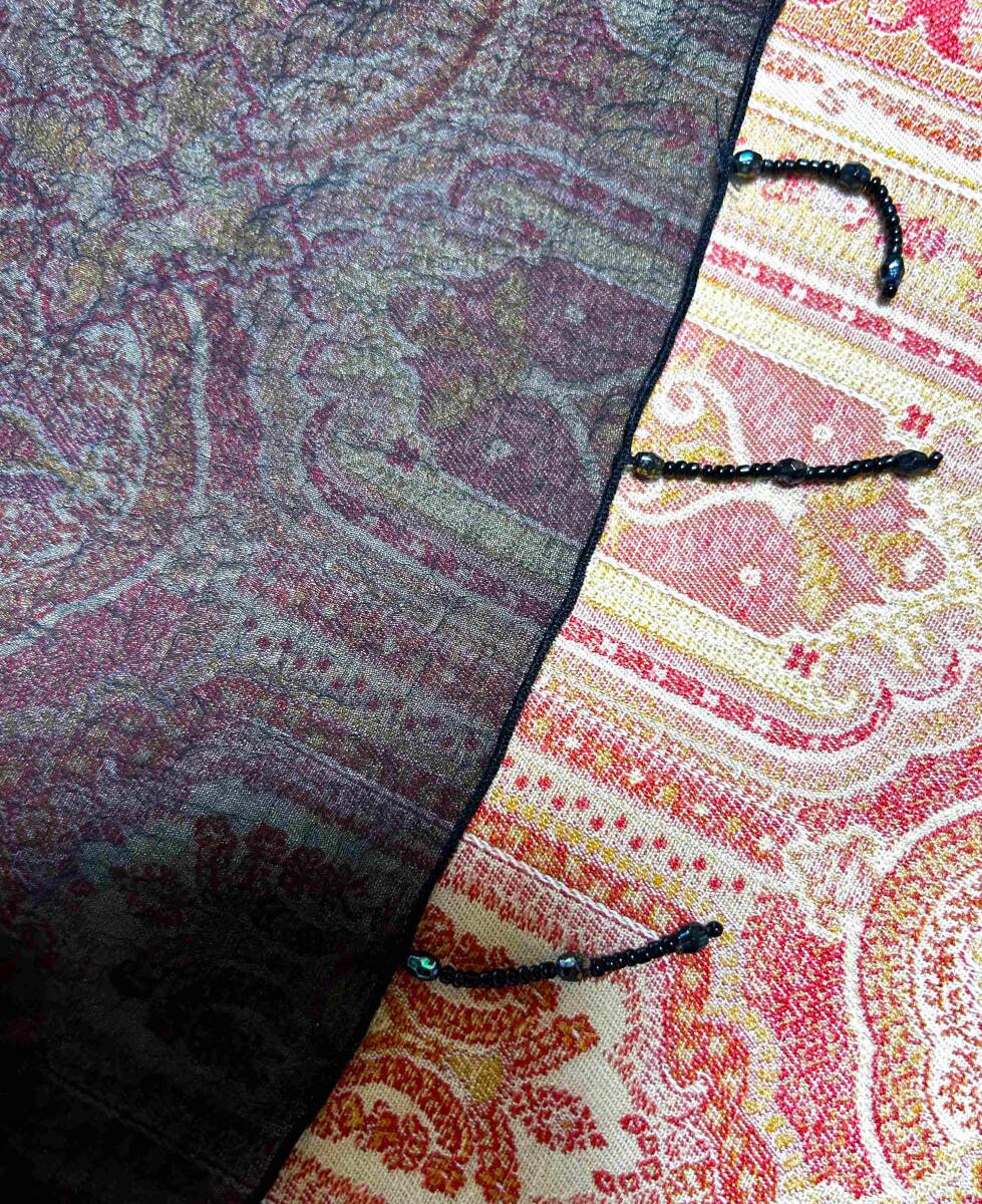 ストールは透ける素材で端にビーズが施されており、線で刺繍が描かれています。180×105センチほど。レーヨン100%。