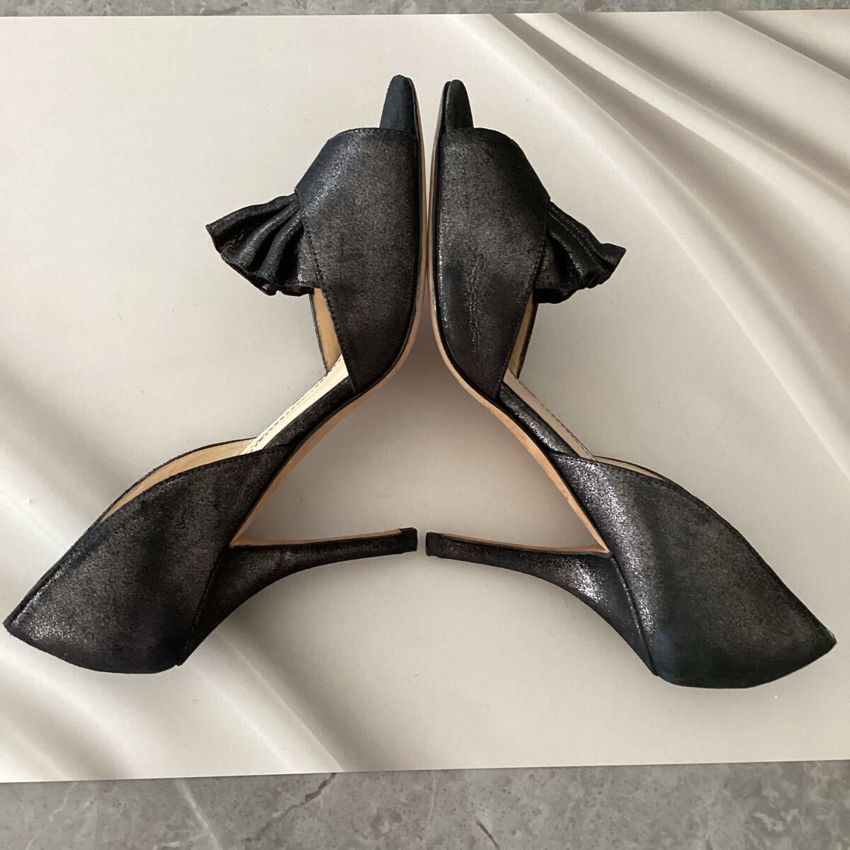 オープントゥデザインの黒いハイヒール、リボン付きでエレガントな印象。