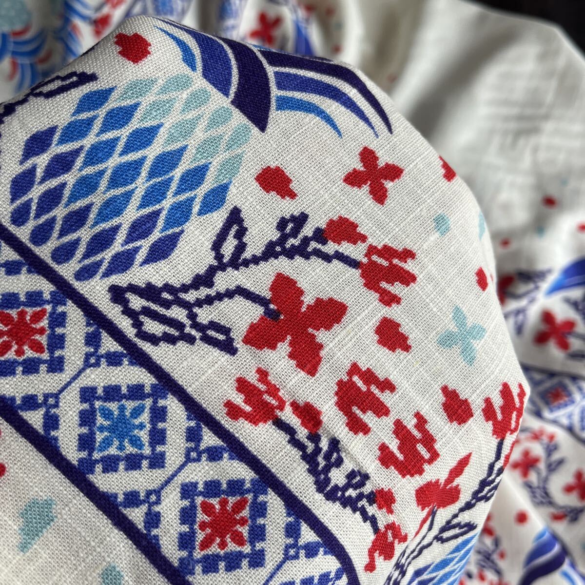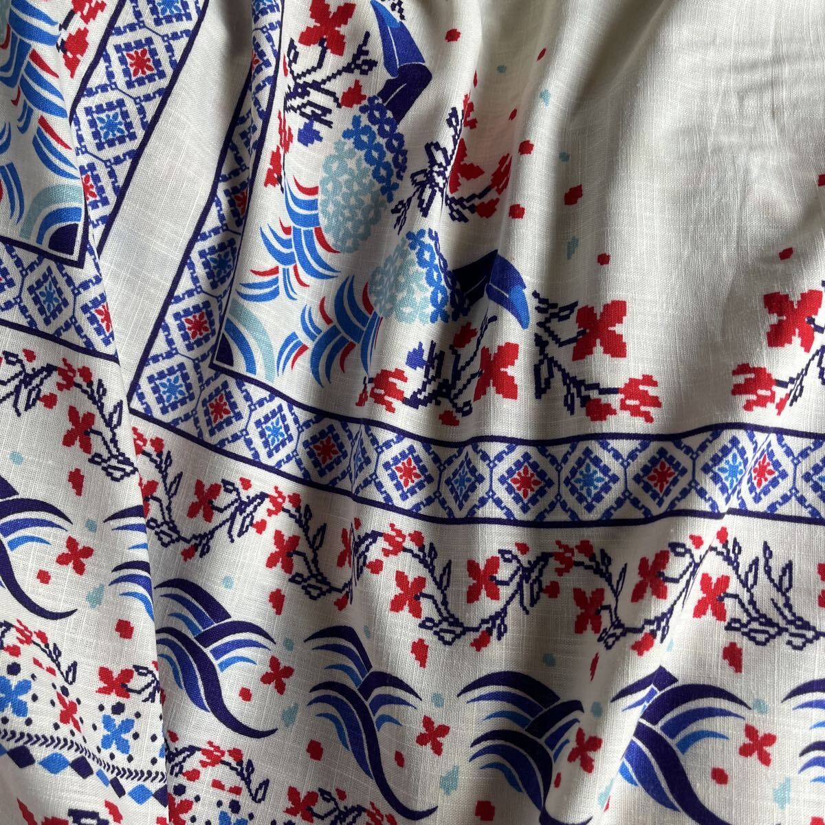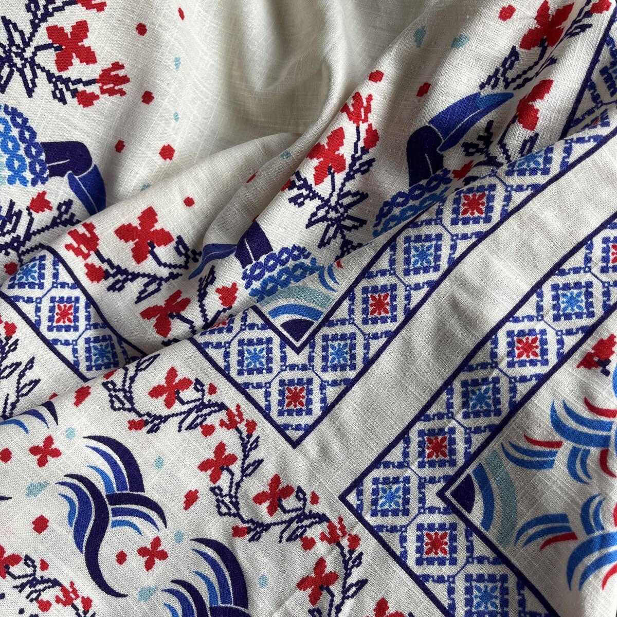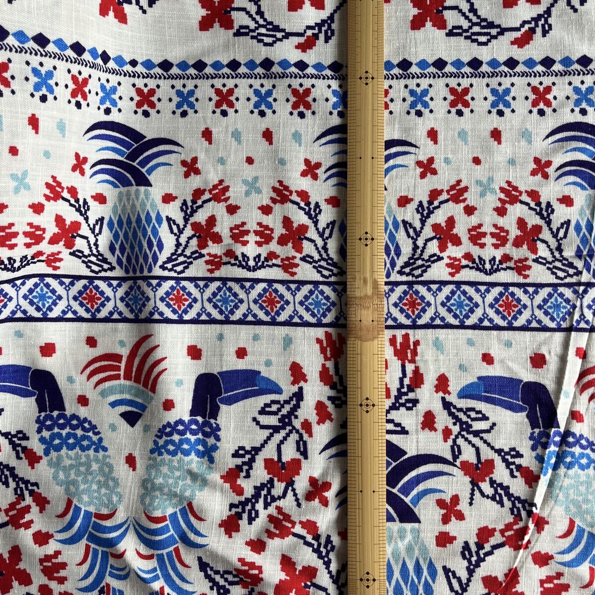 刺繍風のステッチ調デザインが魅力の民族調ファブリック。赤と青のコントラストが華やかで、テーブルクロスやインテリア、ワンピースや小物作りにも映える一枚。