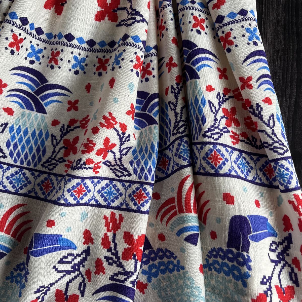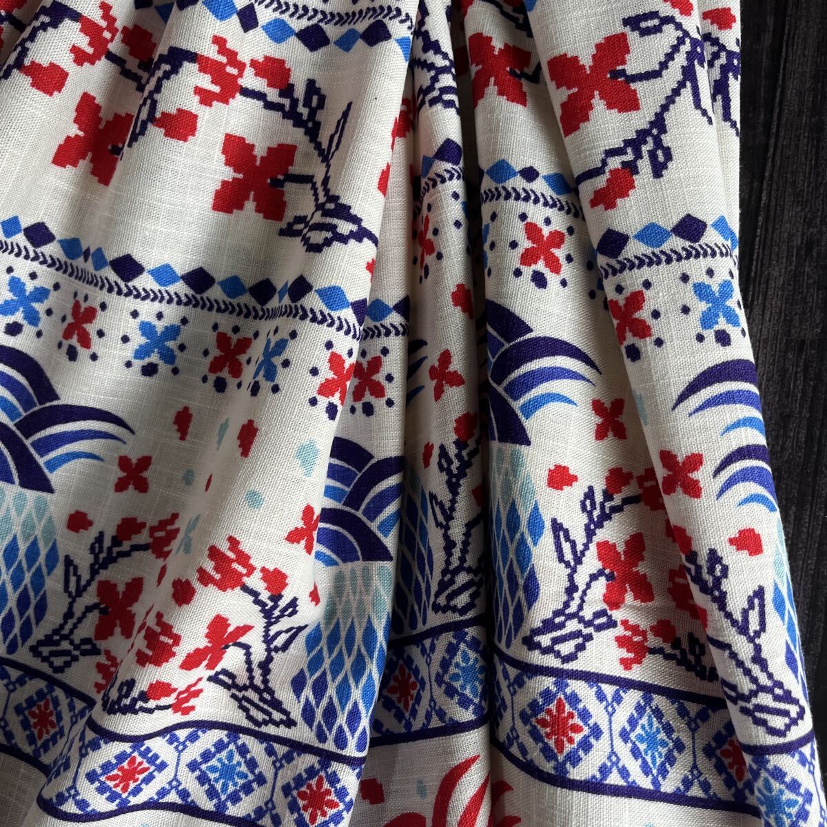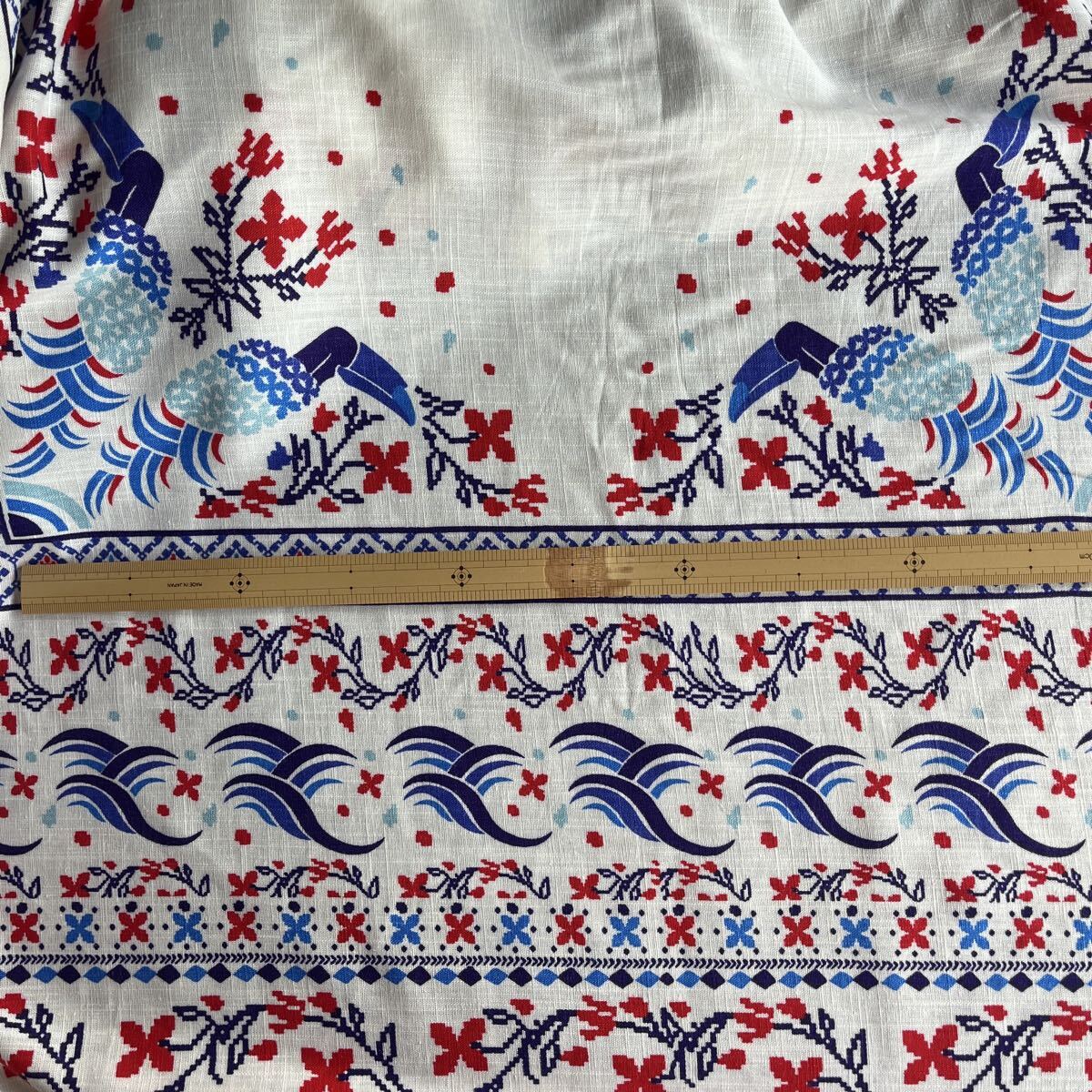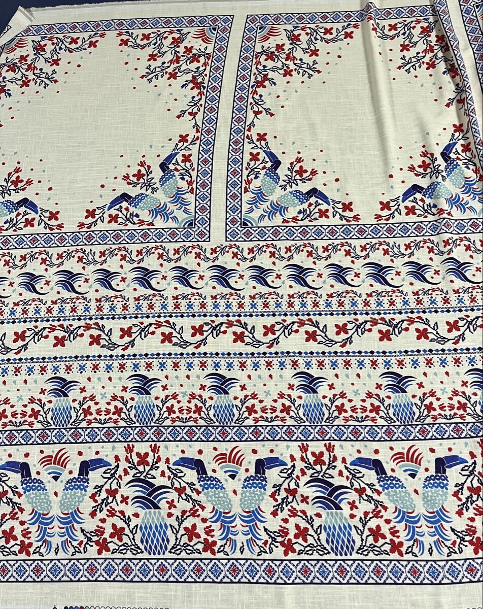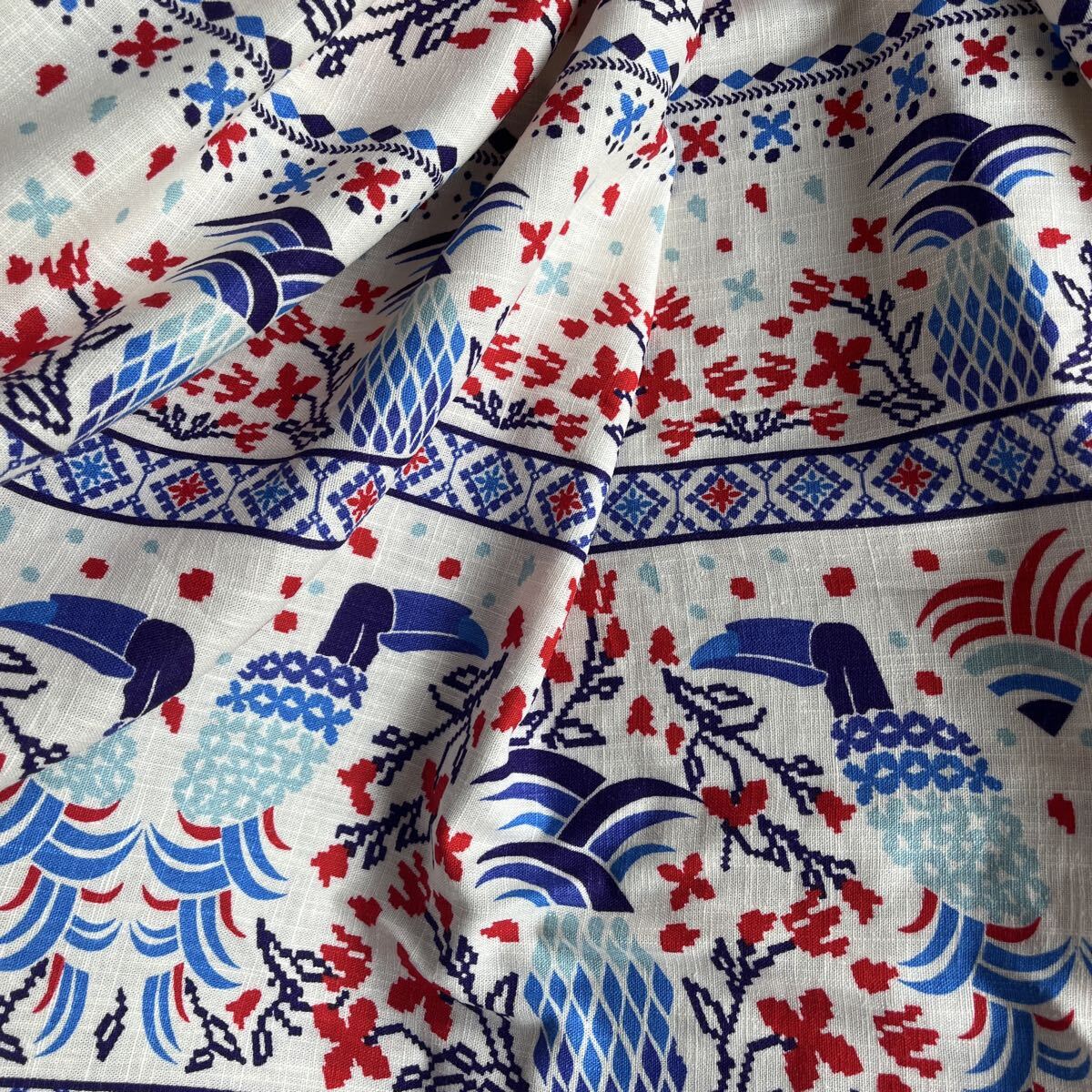 刺繍風のステッチ調デザインが魅力の民族調ファブリック。赤と青のコントラストが華やかで、テーブルクロスやインテリア、ワンピースや小物作りにも映える一枚。