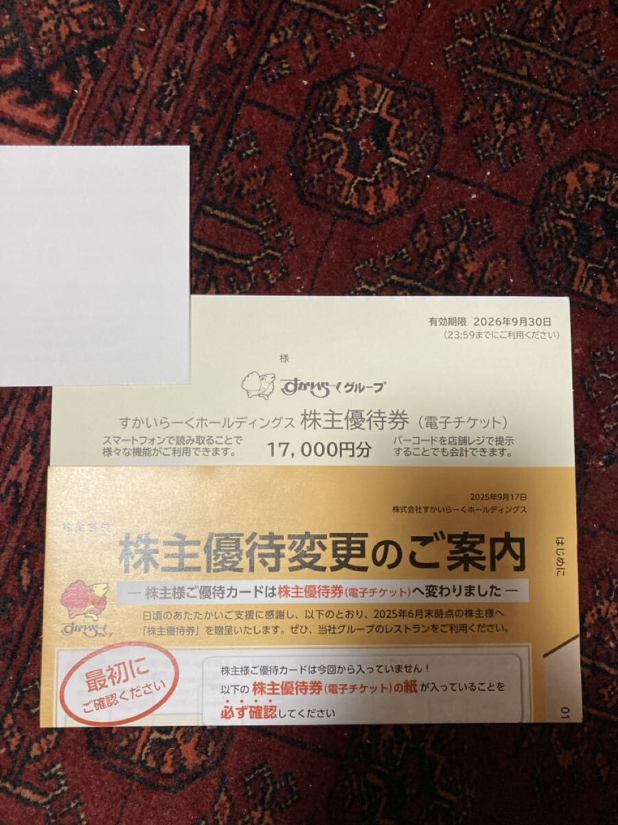すかいらーくホールディングス株主優待券(電子チケット)、17000円分です。