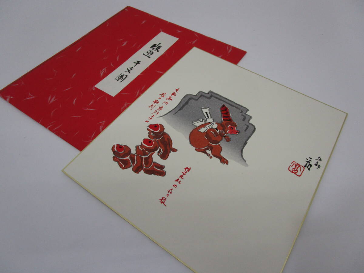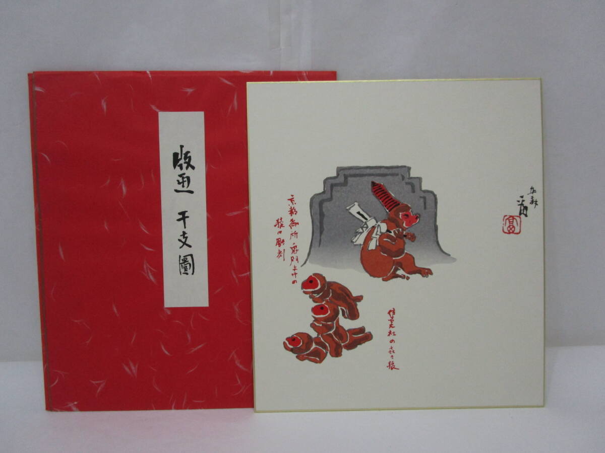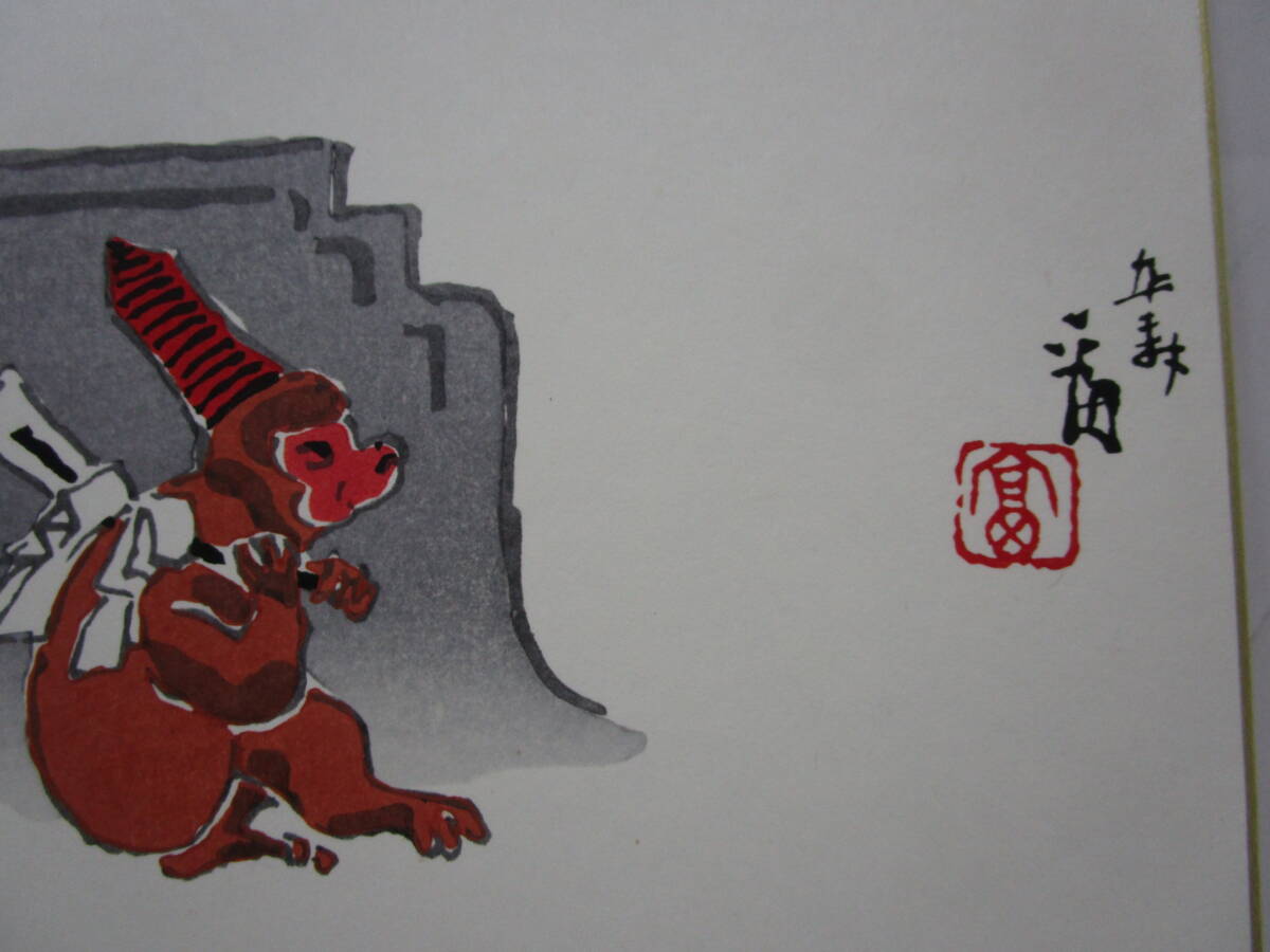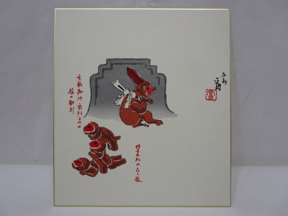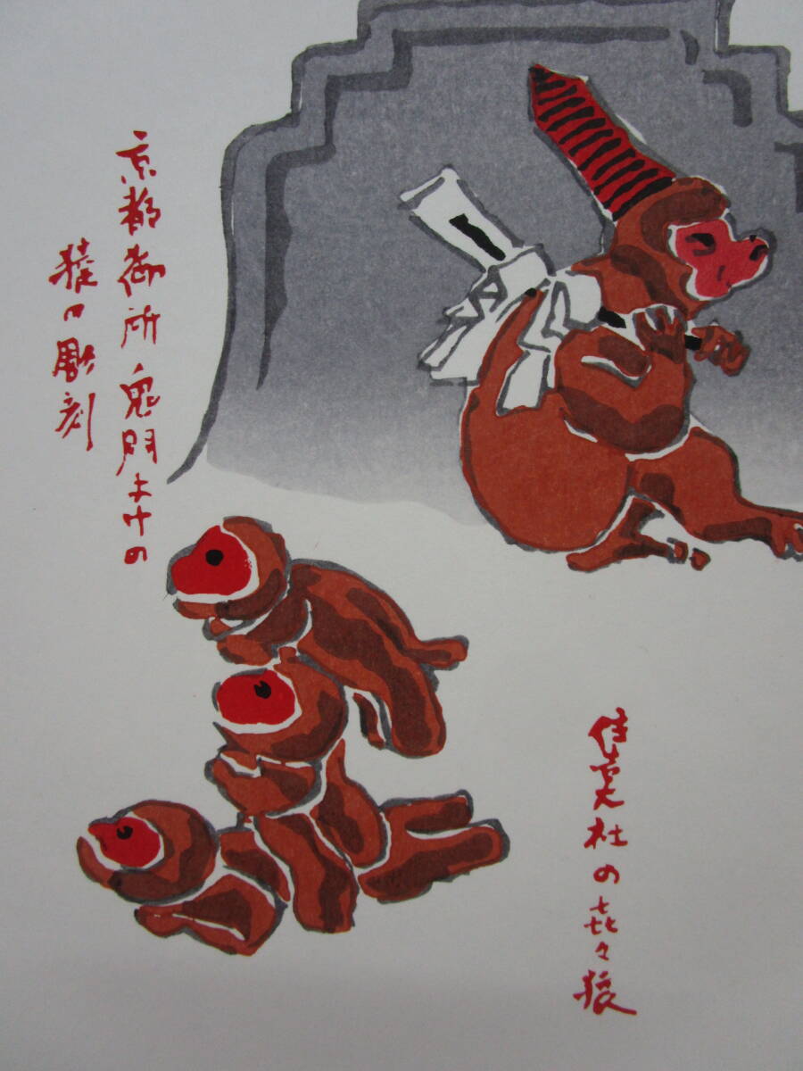 【工芸版画色紙】 十二代 徳力富吉郎作『京都御所鬼門よけの猿の彫刻』と『住吉大社の喜々猿』の 版画 色紙です。 幅 24cm×高さ 27cm  平成四年の 経年品です。タトウ紙入。 どうぞ宜しく。