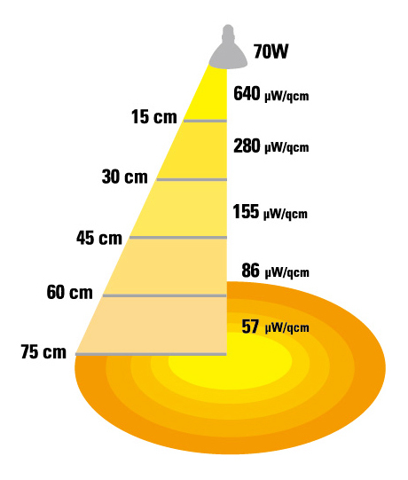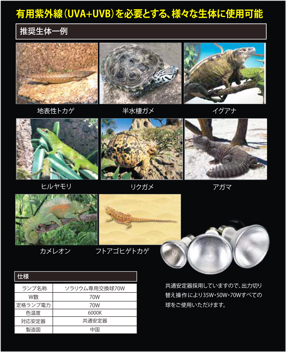この商品を点灯することができるソラリウムセットは安定器に切り替えスイッチがあり、ソラリウムの交換球35W/50W/70Wに対応していますので、違うワット数のセットをお持ちのお客様でも専用交換球ならば交換することが可能です。暑い夏又は照射距離を短くしたいときは35W、寒い冬又は照射距離を長くしたいときは70W、などといった球の交換が可能になります。