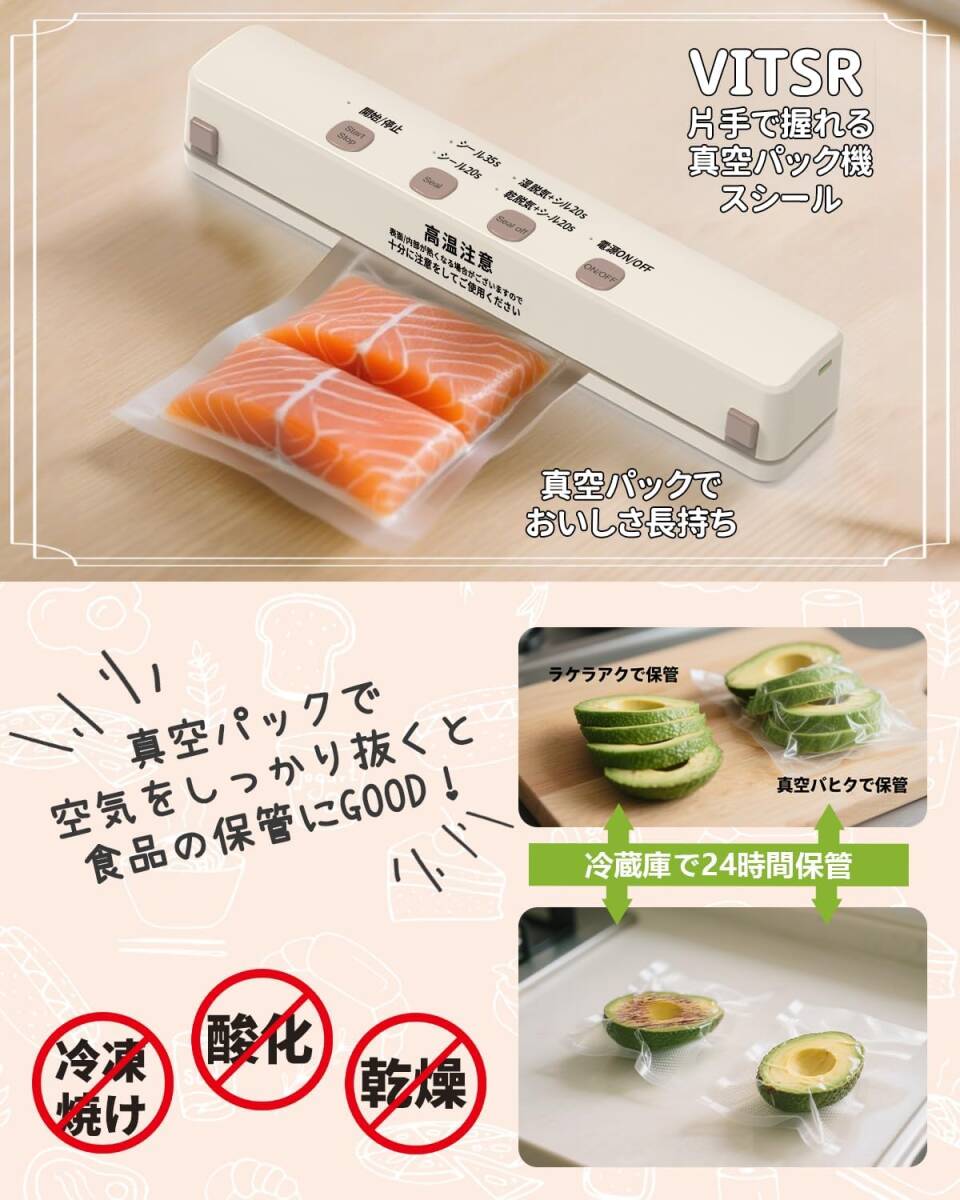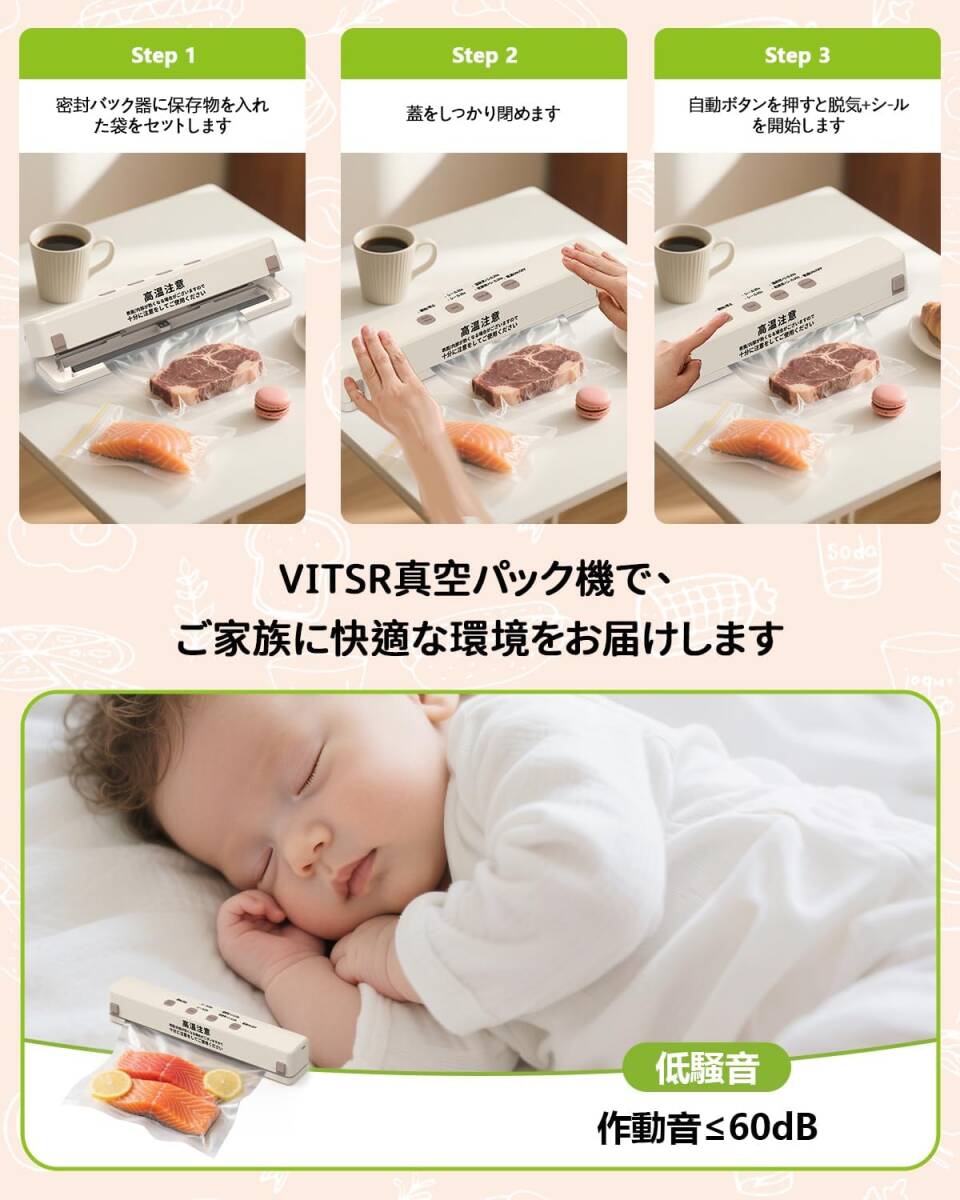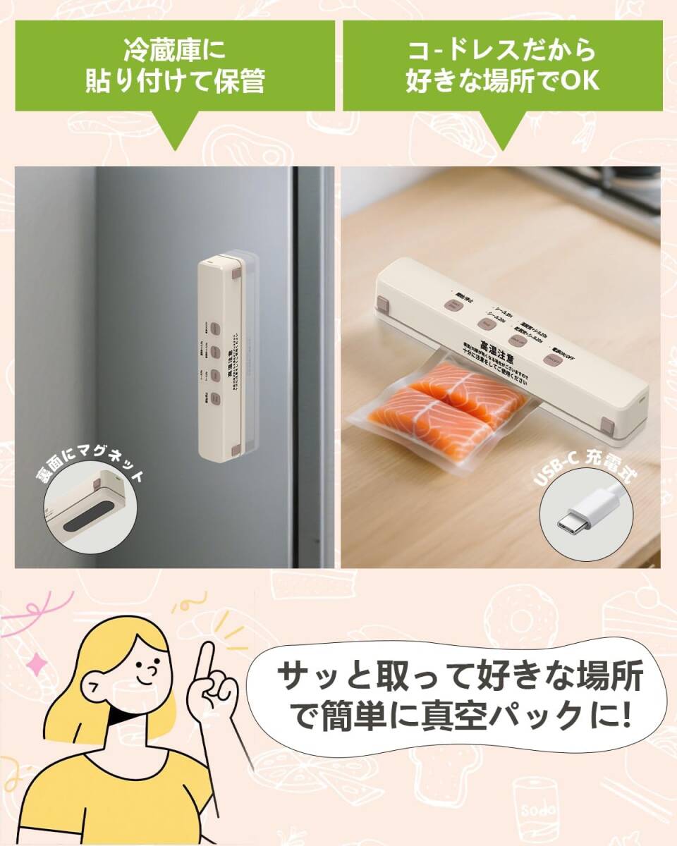 手軽さMAX!:「キッチンカウンターに置く必要なく、料理中でも片手で持ち運べる超コンパクト設計。」ユーザーフレンドリーな操作: ワンクリックで始動、ワンクリックで停止。真空包装機には「開始/停止」のボタンと「シール」のボタンと「脱気+シール」のボタンがあるんだ。ユーザーは適切なモードを選択し、開始できます。使う側が手動で停めたり。袋を用意して、袋の口を機械にうまく差し込んで、ボタンをポチッと押せば、25秒以内に素早く包装ができるんだ。簡単で使いやすいから、ストレスなく楽しめるよ! 収納便利で高効率なシール:コンパクトかつ携帯に便利なデザインで、静音性能も高い60dB以下の低騒音を実現し、夜間でも家族の安眠を妨げません。食品用真空パッキングマシンは包括的な真空シールを実現し、コンパクトな構造で使いやすく、さらに幅広シール構造を採用した改良モデルとなっており、迅速かつ効率的な密封を実現しながらエラー発生を低減しています。同時に、真空パック器は収納物の体積を小さくし、整理整頓を容易にします。背面はマグネットで冷蔵庫に貼り付け、充電式なのでケーブルは不要です。3000mAhのバッテリーは1回満充電で20~30回使用でき、キャンプに最適です!」また、コンパクトなデザインと軽量モデルにより、持ち運びも便利です。 多様性と便利性を楽しむ:下ごしらえ:切りおき保存で調理がスムーズに。下味を付ける際も味がしっかり染み込む。 真空調理:加熱ムラを防いで中までふっくらジューシー。旨味や栄養も逃がさない。低温調理器を使えば本格低温調理も。 レンジ調理:洗い物を増やさず、効率的に時短調理。 真空パック機は肉、魚、野菜、果物など、幅広い食材に対応しています。これにより、様々な料理や食材を新鮮なまま保存でき、特定の食材は長期保存も可能。L42 |