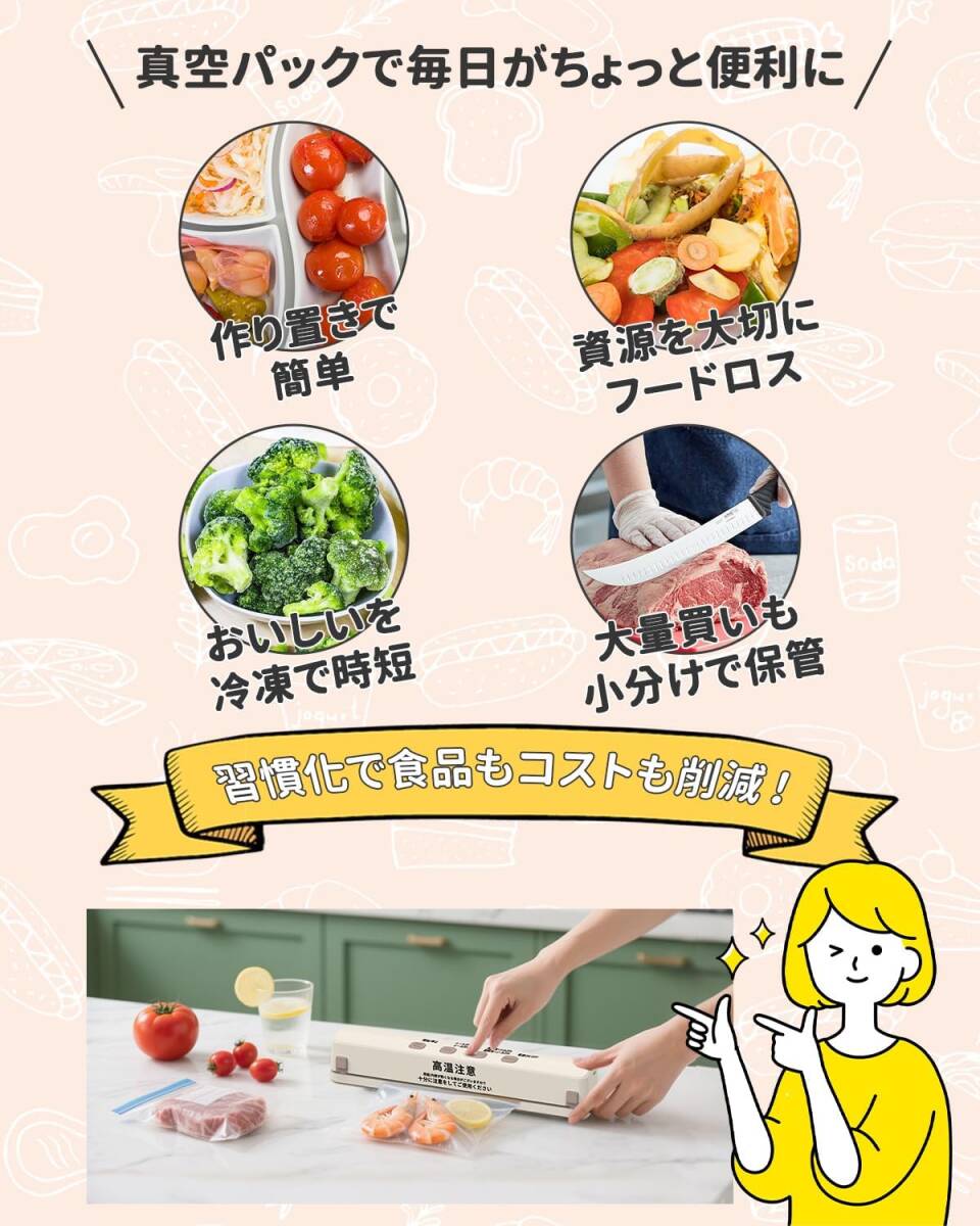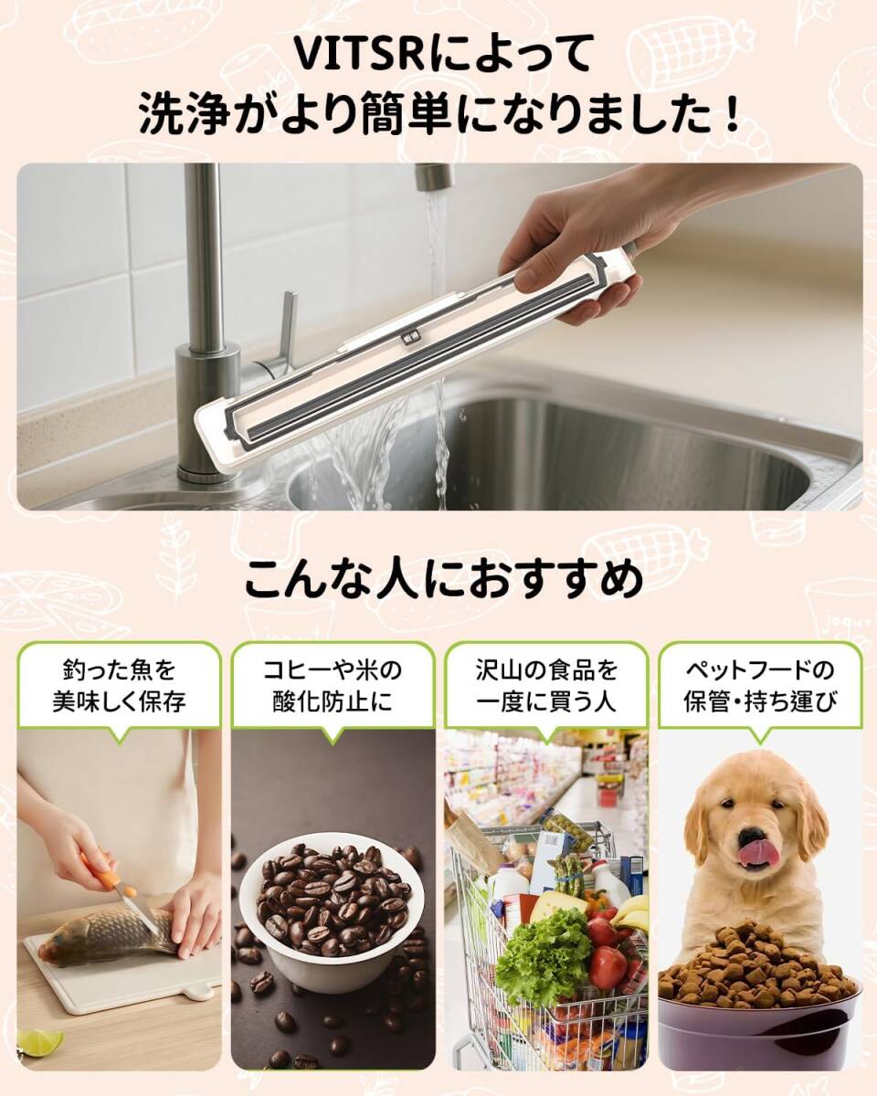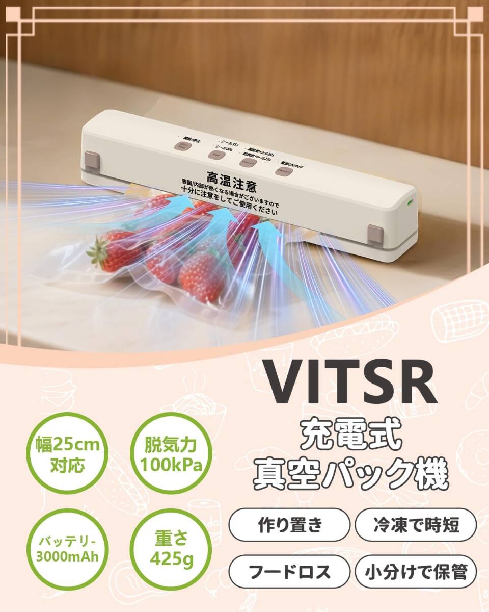 手軽さMAX!:「キッチンカウンターに置く必要なく、料理中でも片手で持ち運べる超コンパクト設計。」ユーザーフレンドリーな操作: ワンクリックで始動、ワンクリックで停止。真空包装機には「開始/停止」のボタンと「シール」のボタンと「脱気+シール」のボタンがあるんだ。ユーザーは適切なモードを選択し、開始できます。使う側が手動で停めたり。袋を用意して、袋の口を機械にうまく差し込んで、ボタンをポチッと押せば、25秒以内に素早く包装ができるんだ。簡単で使いやすいから、ストレスなく楽しめるよ! 収納便利で高効率なシール:コンパクトかつ携帯に便利なデザインで、静音性能も高い60dB以下の低騒音を実現し、夜間でも家族の安眠を妨げません。食品用真空パッキングマシンは包括的な真空シールを実現し、コンパクトな構造で使いやすく、さらに幅広シール構造を採用した改良モデルとなっており、迅速かつ効率的な密封を実現しながらエラー発生を低減しています。同時に、真空パック器は収納物の体積を小さくし、整理整頓を容易にします。背面はマグネットで冷蔵庫に貼り付け、充電式なのでケーブルは不要です。3000mAhのバッテリーは1回満充電で20~30回使用でき、キャンプに最適です!」また、コンパクトなデザインと軽量モデルにより、持ち運びも便利です。 多様性と便利性を楽しむ:下ごしらえ:切りおき保存で調理がスムーズに。下味を付ける際も味がしっかり染み込む。 真空調理:加熱ムラを防いで中までふっくらジューシー。旨味や栄養も逃がさない。低温調理器を使えば本格低温調理も。 レンジ調理:洗い物を増やさず、効率的に時短調理。 真空パック機は肉、魚、野菜、果物など、幅広い食材に対応しています。これにより、様々な料理や食材を新鮮なまま保存でき、特定の食材は長期保存も可能。L42 |
