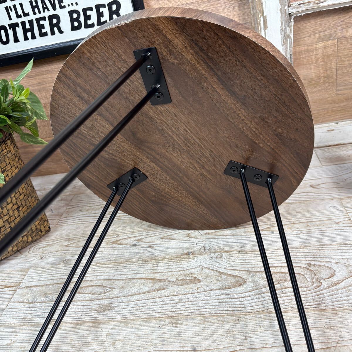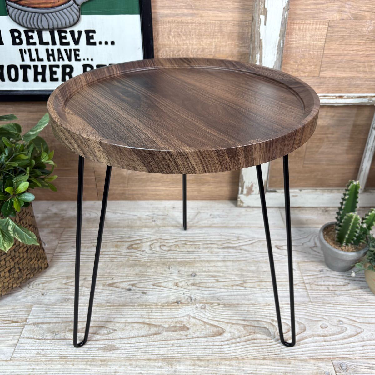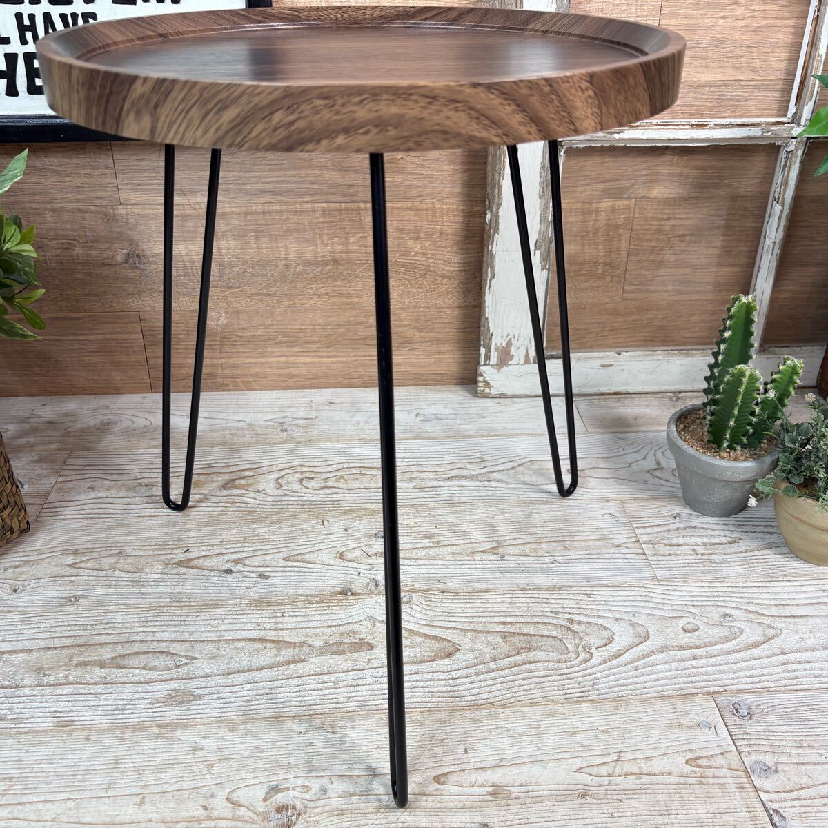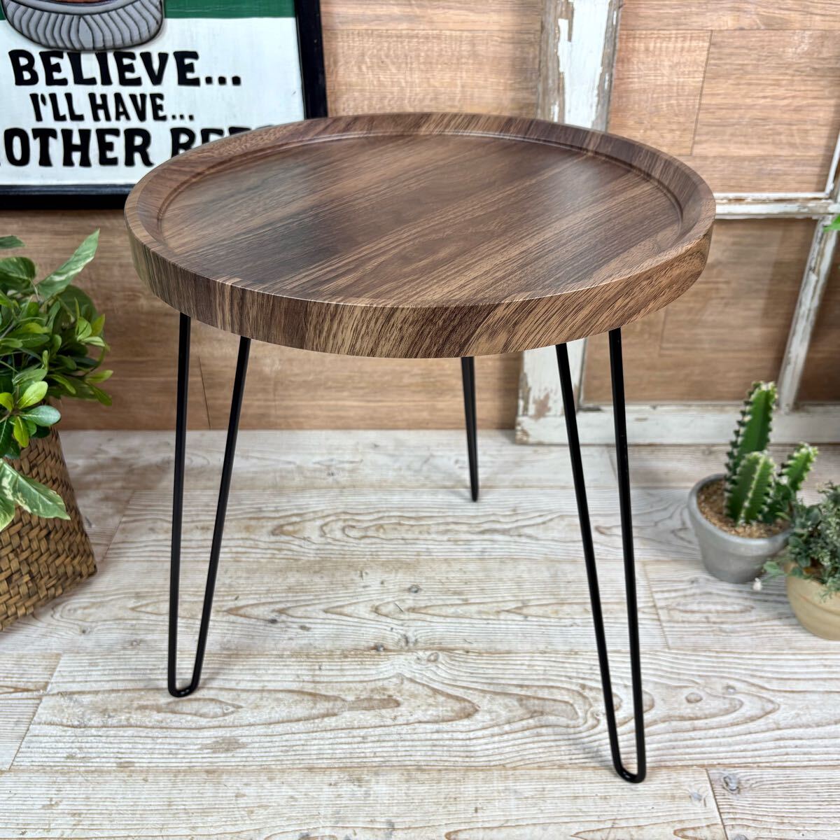 ナチュラルブラウン木目調丸サイドテーブルです。木製天板とスチール脚のシンプルでおしゃれな三つ足丸テーブル!ソファサイドのテーブルやベッド脇のラックに最適なサイズになります!水汚れが染みにくいコーティング仕様でとても使いやすいお品。カフェテーブル、ティーテーブル、花台など様々な場所で大活躍です!リーズナブルなお買い得価格です。