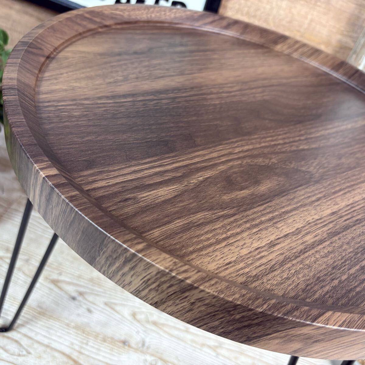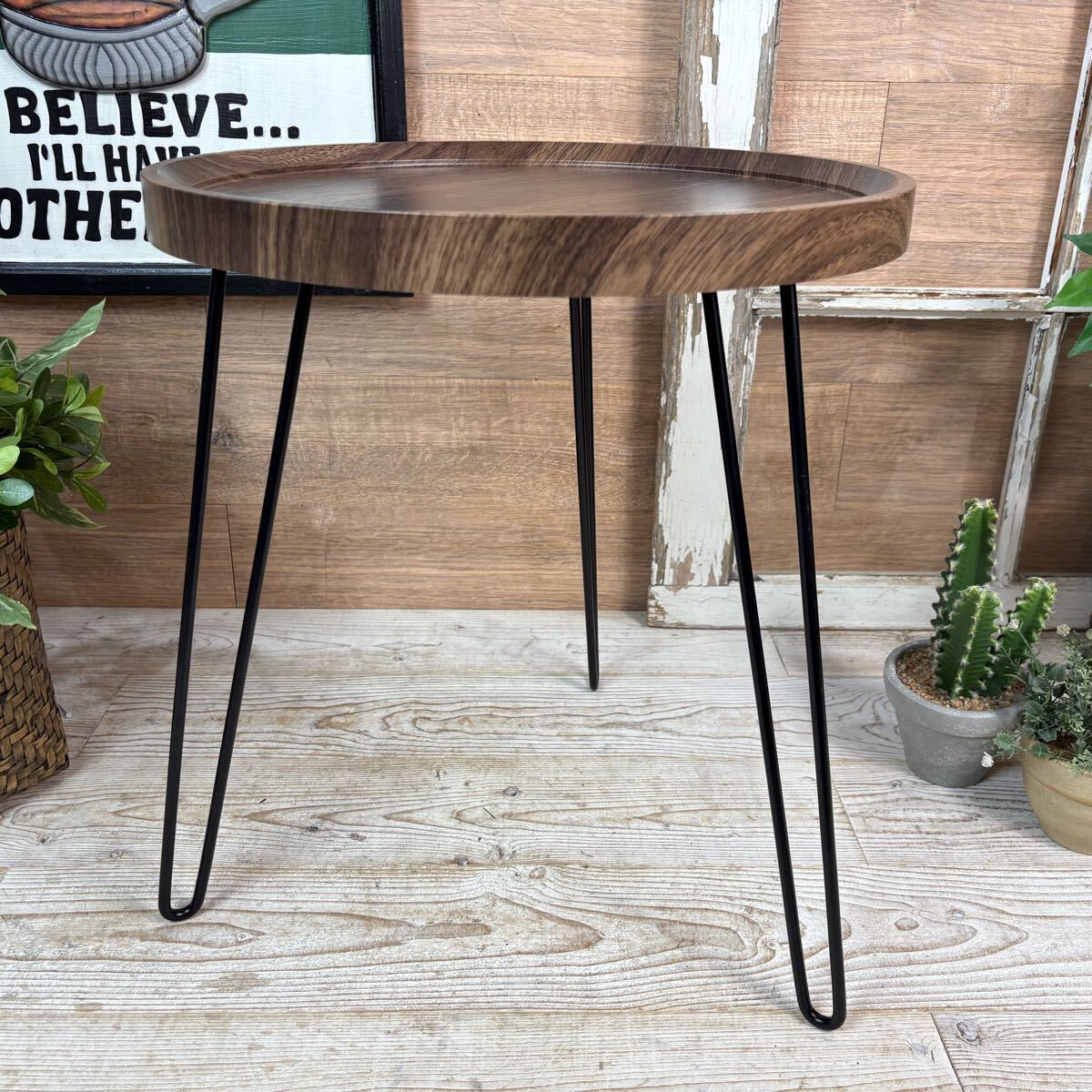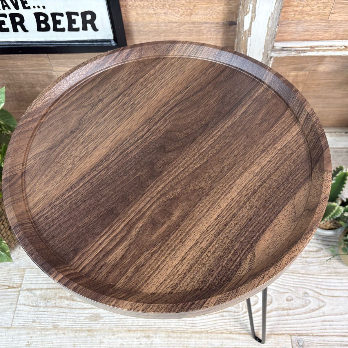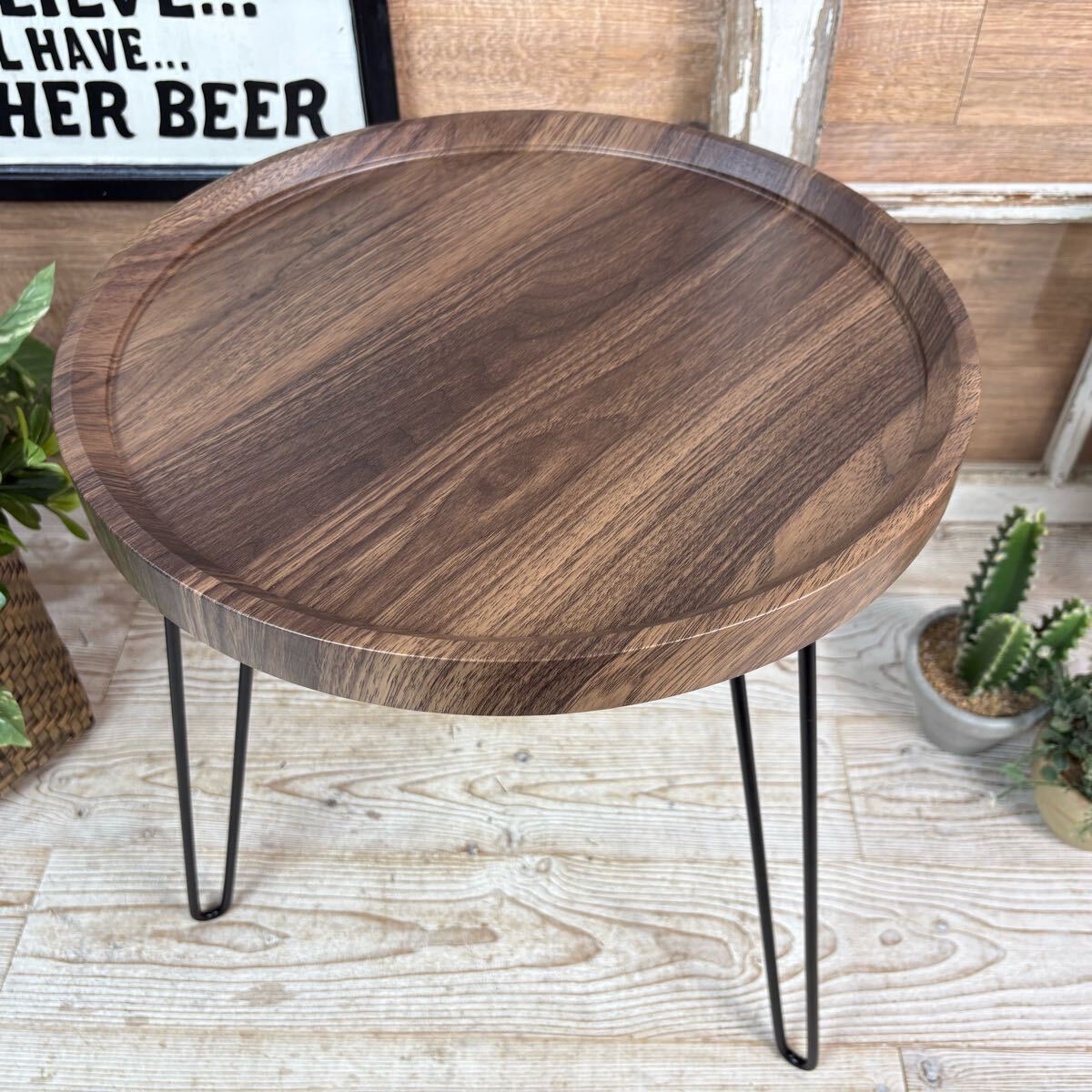 ナチュラルブラウン木目調丸サイドテーブルです。木製天板とスチール脚のシンプルでおしゃれな三つ足丸テーブル!ソファサイドのテーブルやベッド脇のラックに最適なサイズになります!水汚れが染みにくいコーティング仕様でとても使いやすいお品。カフェテーブル、ティーテーブル、花台など様々な場所で大活躍です!リーズナブルなお買い得価格です。