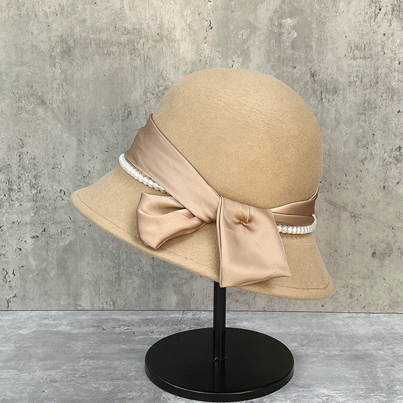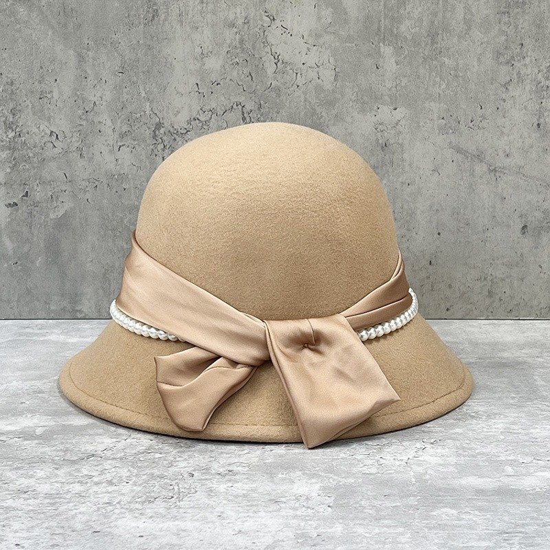 高級感 バケットハット フェルト帽子 シルクのリボン付きハット 秋冬 ウール 帽子 優雅 結婚式 パーティー帽子 ウェディング カーキ