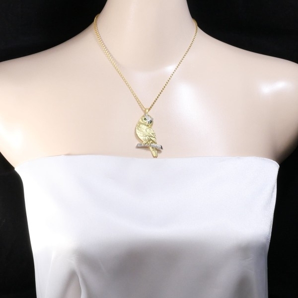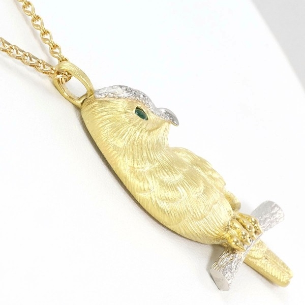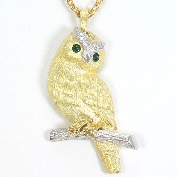【素材】 PT900/プラチナ K18/イエローゴールド 【石目】 天然エメラルド 0.20ct 天然ダイアモンド 0.05ct 【総重量】 約21.8g 【サイズ】 トップ:全長 約50×25mm(トップとチェーン取り外し可) チェーン:全長 約41cm(アジャスターなし) 【付属品】 カード式鑑別書(ジェムグレーディングシステムジャパン) 【商品の状態】 新品仕上げ済み 【コメント】 金色の梟がそっと枝にとまり、知恵と静けさを象徴するかのような存在感を放つネックレスです。瞳にはエメラルドがきらめき、見つめるたびに神秘的な魅力が胸を打ちます。繊細な彫金と温もりある造形が美しい逸品です。 | |