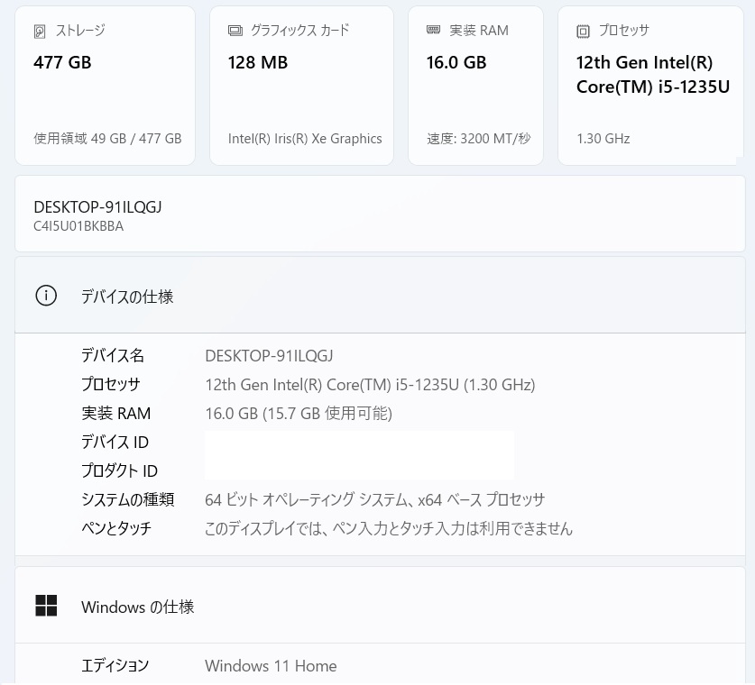 CPU:第12世代 インテル Core i5 1235U(Alder Lake) 10コア