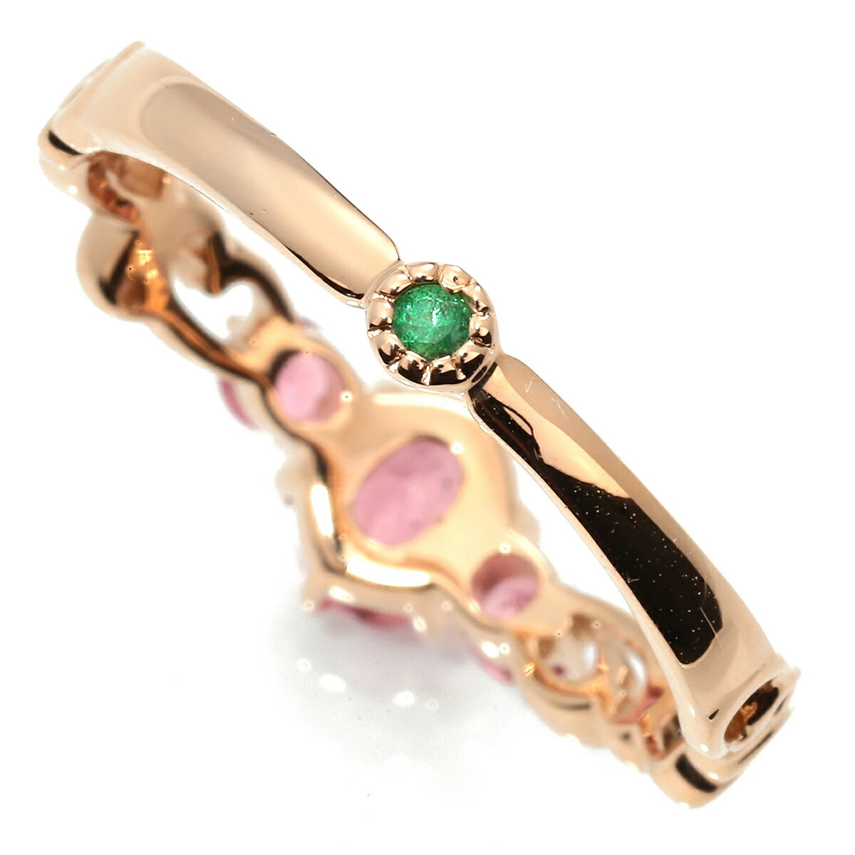 ティアラのような可愛らしいデザインのピンクトルマリンを飾ったリング。リングの後ろ側にはエメラルドを施し、女性らしさ漂う、優雅でアンティークな雰囲気のお品です。