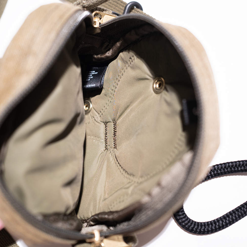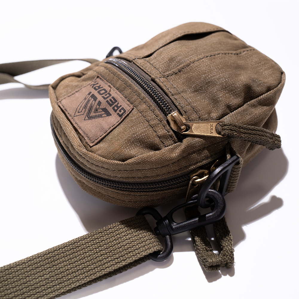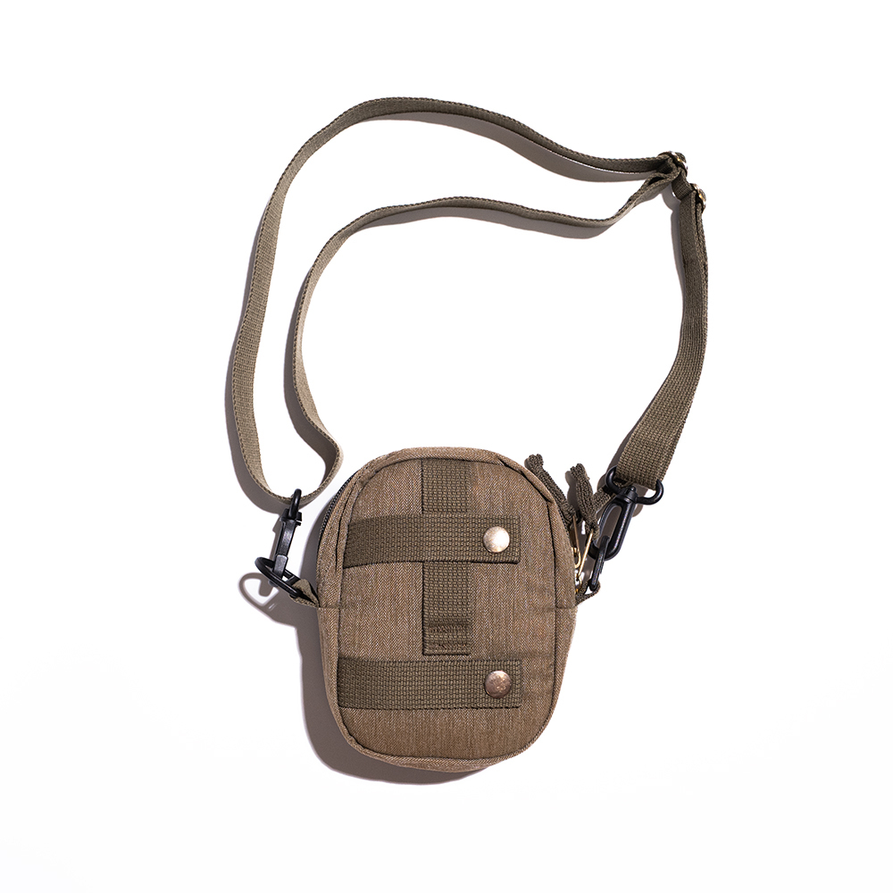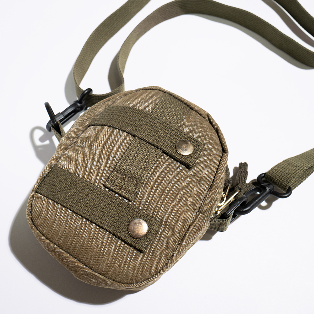 ミリタリーのようなデザインとヴィンテージ感ある素材感の定番クイックポケット、着脱と調整可能なストラップ付きショルダーバッグ。カバンなどにつけれるスナップ付属するなど機能面はバッチリです。