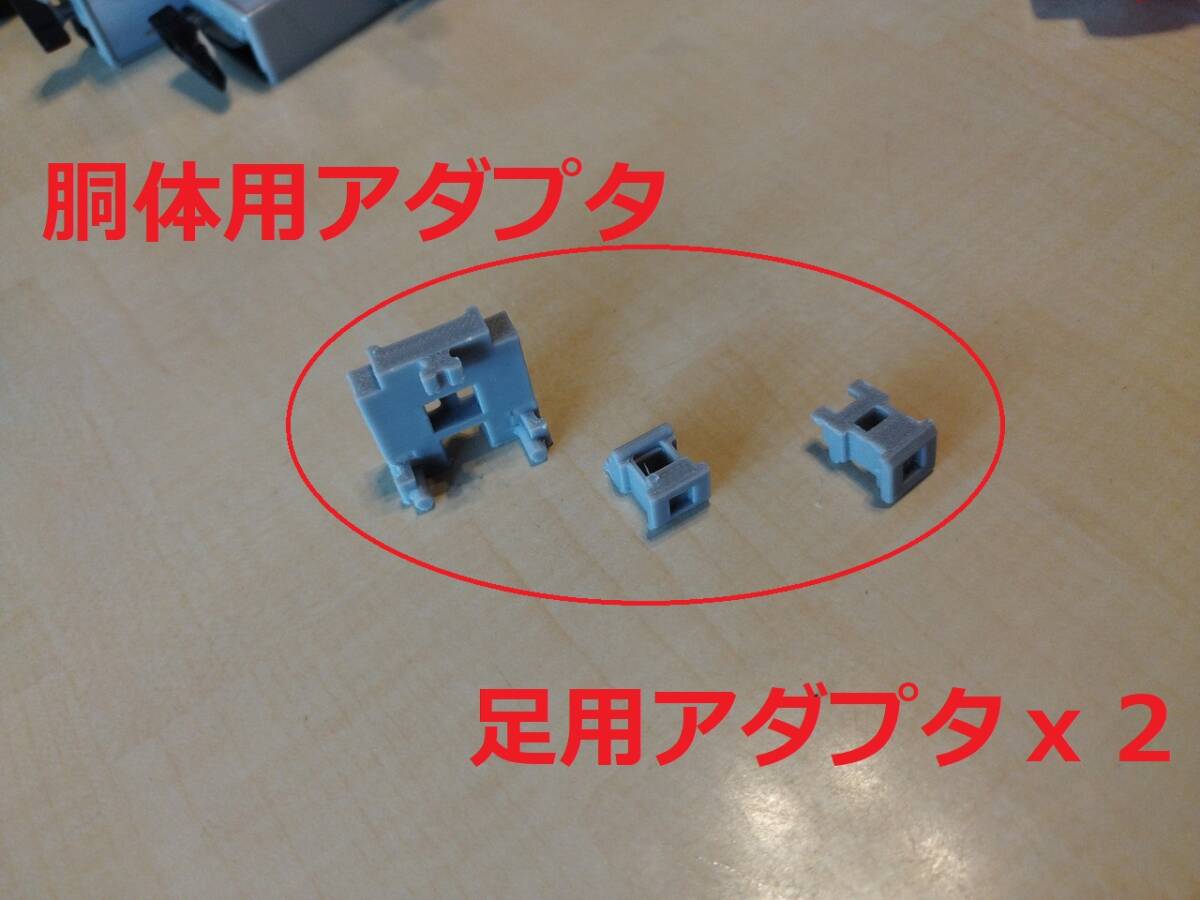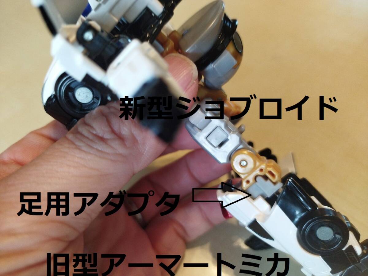 使い方は簡単。新型ジョブロイドの胴体部に胴体用アダプタを、膝部分に足用アダプタを差し込みます。その状態なら旧型アーマートミカの上半身と足が合体可能になります。