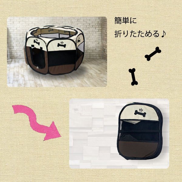 ☆ペットサークル ボーン Sサイズ 【商品名】 ペットサークル ボーン Sサイズ 【カラー】 ◆ホワイトxブラウン 【サイズ】 約75×42cm Sサイズ 【素材】 オックスフォードクロス 【特徴】 ◆小型犬にぴったりなサイズ感のペットサークルです。 ◆オックスフォード素材なのでワンちゃんの健康も安心! ◆天井は開閉式。天井がなくオープンな雰囲気でワンちゃんと一緒に楽しめます♪ ◆折りたたみが簡単にできてコンパクト!旅行先にも、ちょっとした公園へのお出かけでも使えます。 | ||||