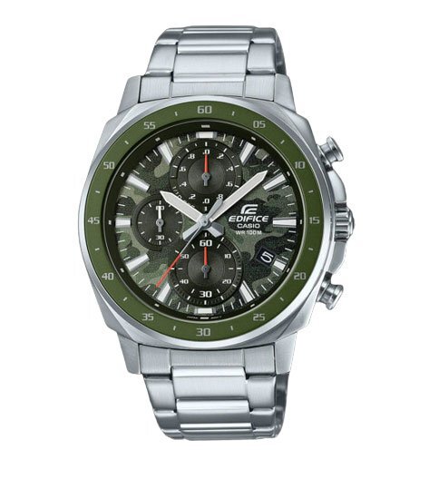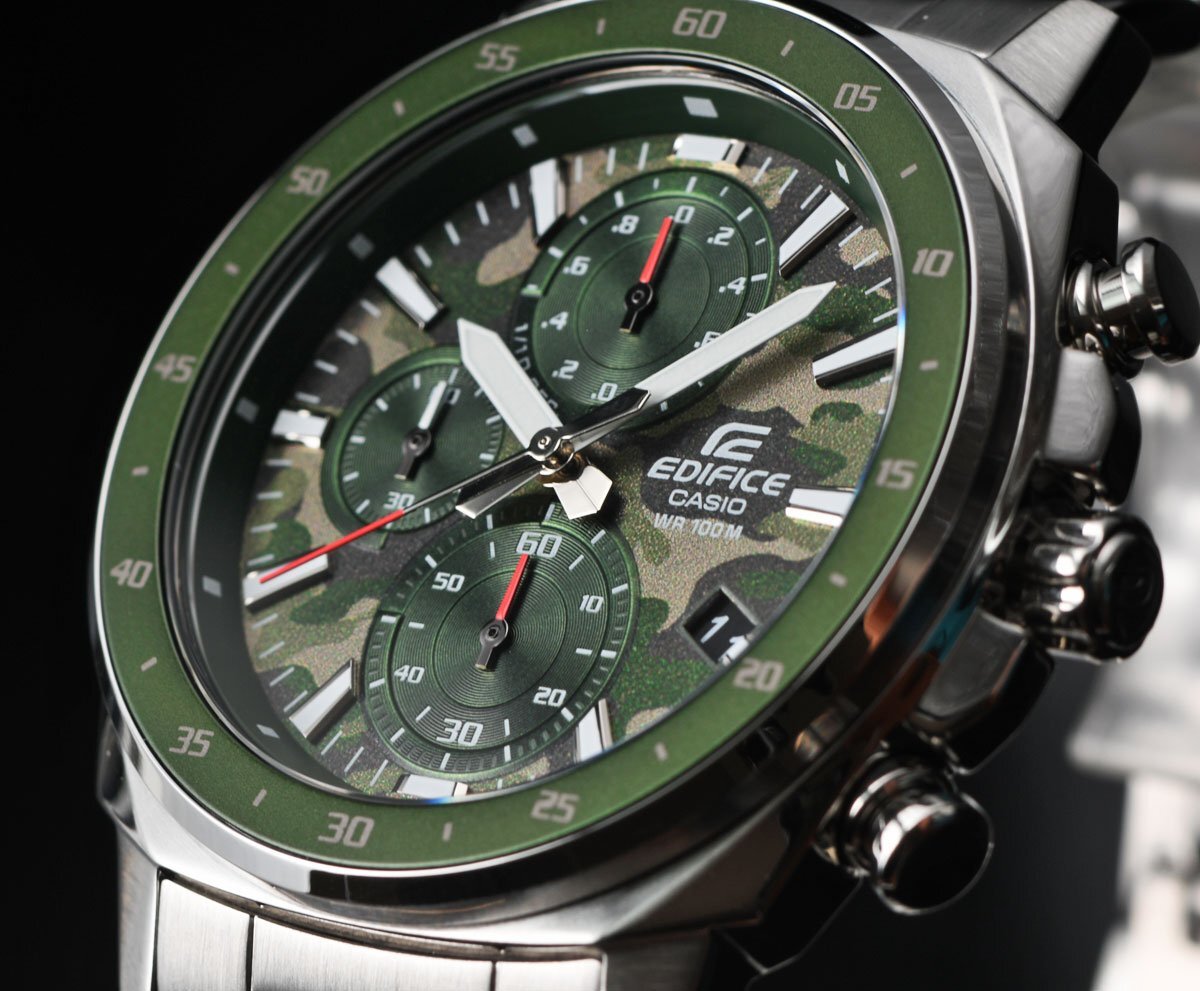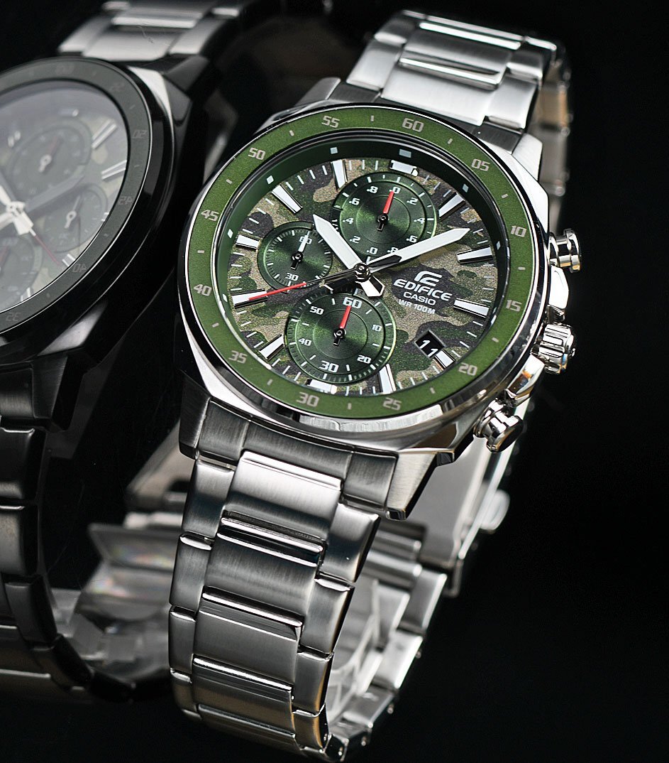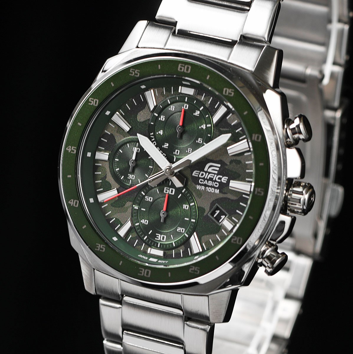 カシオEDIFICE 新品1円 グリーン迷彩柄カモフラージュ 逆輸入エディフィス欧米モデル 100m防水 クロノグラフ 腕時計 CASIO メンズ