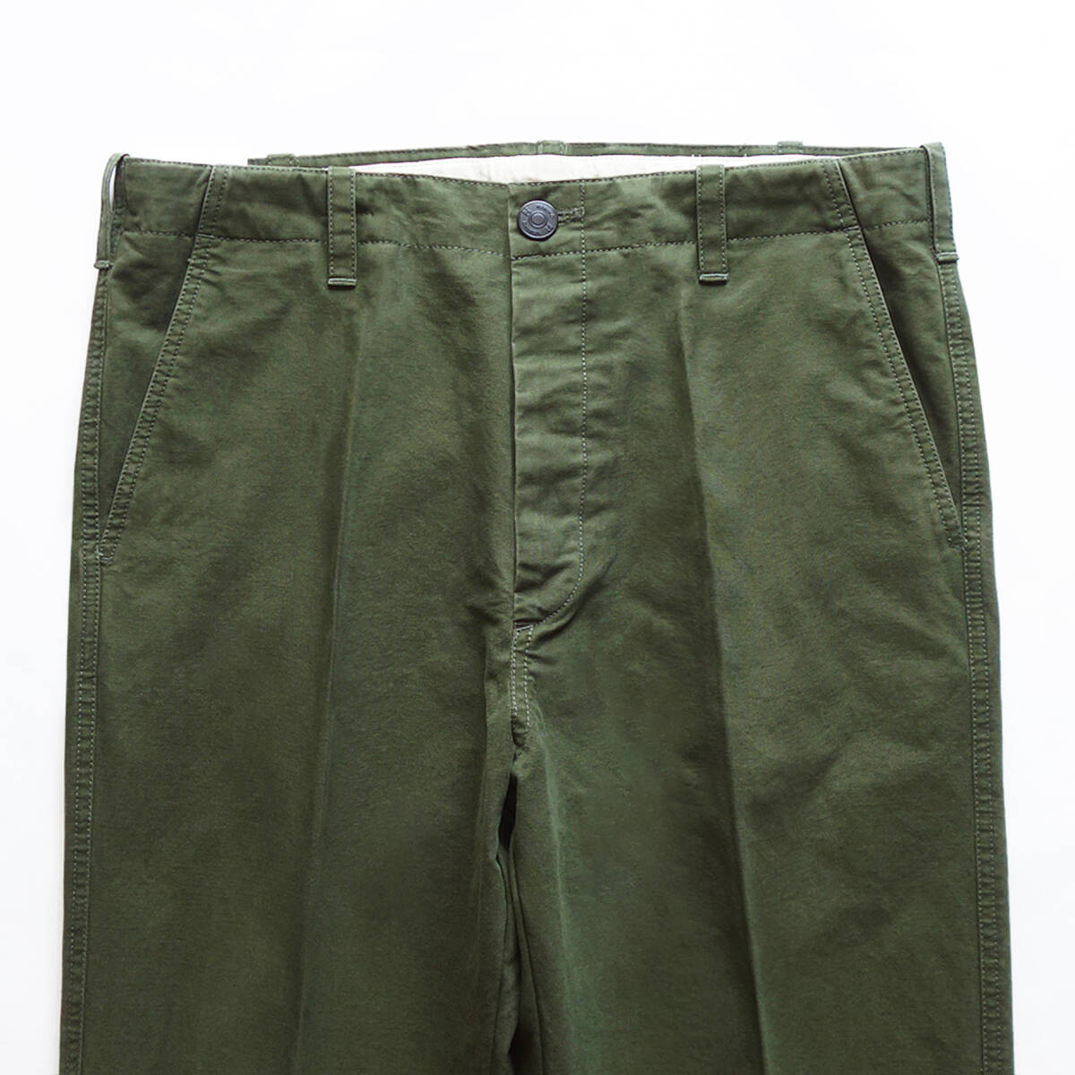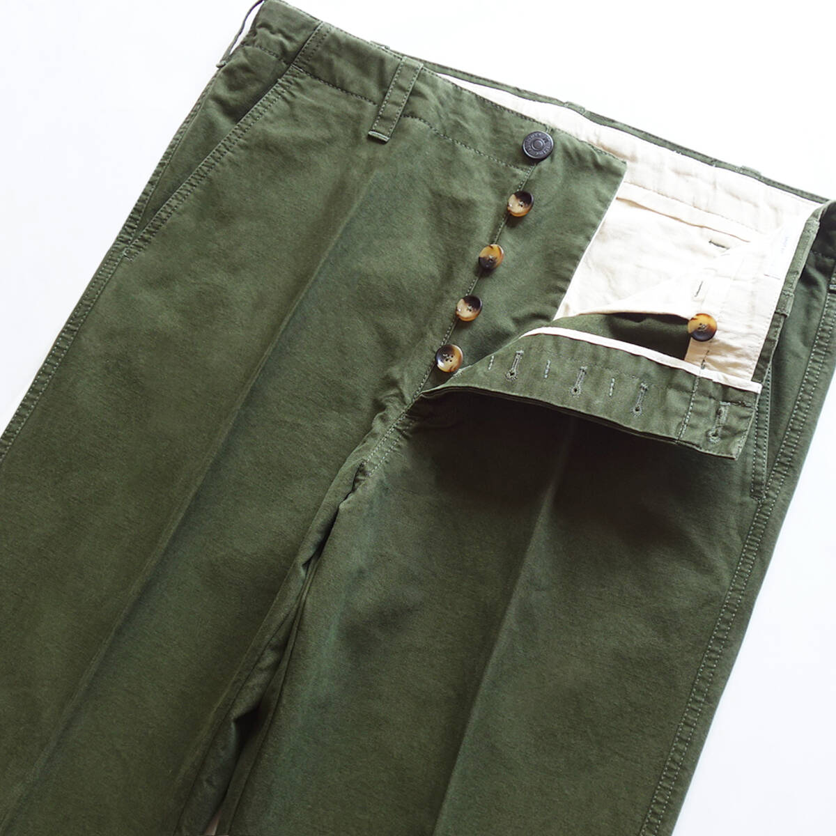今回ご紹介するのは、Worn Outでは定番となるコットントラウザーズ(チノパン)です。一見なんてことのないチノパンですが、イタリアブランドが作る従来のチノパンとは一線を画します。分かり易く言うと、クリーンな印象の“イタリアンチノ”ではなく、チノパンの原点であるミリタリーやワークの要素を取り入れた“アメリカンチノ”になります。ノープリーツのボタンフライ仕様で、サイドはスラントポケット、バックはボタン式の片玉縁ポケット。トップボタンのみジーンズに用いられる金属製のタックボタンを採用しているところが興味深いです。素材には、高密度織りのダブルツイステッドキャンバスを採用。チノパンのオリジンに迫るオーセンティックな佇まいでありながら、やや深めの股上で、ワタリ(太股)に程よい“ゆとり”があり、裾へと緩やかに絞り込んでいくテーパードシルエットによって“今っぽさ”と“美脚”を両立しています。もたつきがなく自然にフィットするヒップラインや少し短めのレングスもいい感じです。従来のイタリアンチノよりもテーパードが緩く、絶妙なさじ加減でアメリカ的な要素を取り入れているところがミソ。イタリアブランドならではの上質な仕立てに裏打ちされた美脚シルエットでありながら、こてこてのイタリアっぽさがないので幅広いコーディネートに合わせられます。脚を通した瞬間に“そうそう、こんなチノパンが欲しかった”となる、従来のチノパンとは一線を画する大人が大満足できる一本です。
