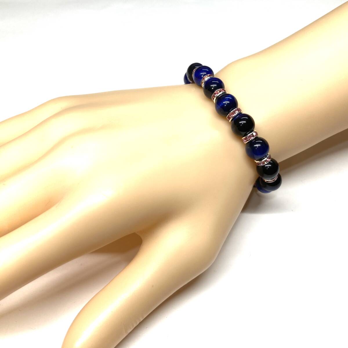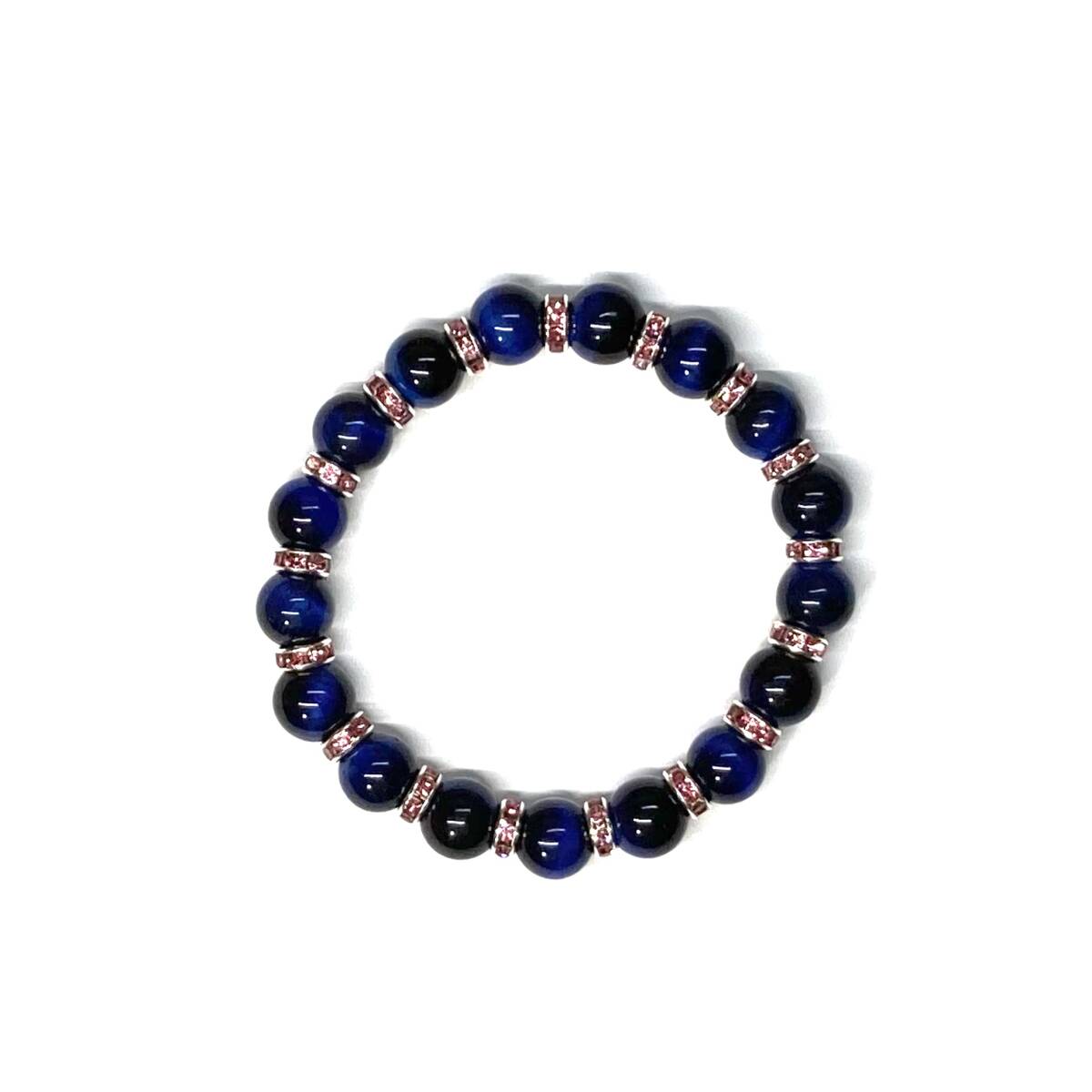 こちらは、ブルータイガーアイ の8mm玉を使用したパワーストーンブレスレットです。石との間にはロンデルを挟み高級感を演出しております。シンプルなデザインは、シーン問わずどんなコーディネートとも合わせ易いブレスレットです。サイズは内径約15cmです。当社の中でも一番人気の実績があるデザインとなっております。気になる方はお早めにどうぞ。