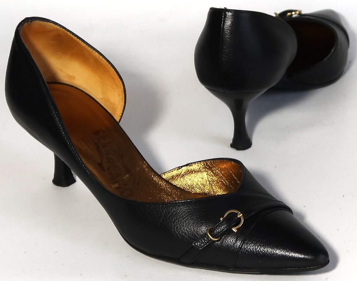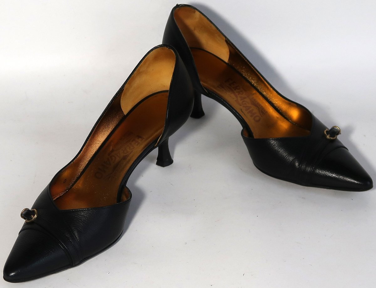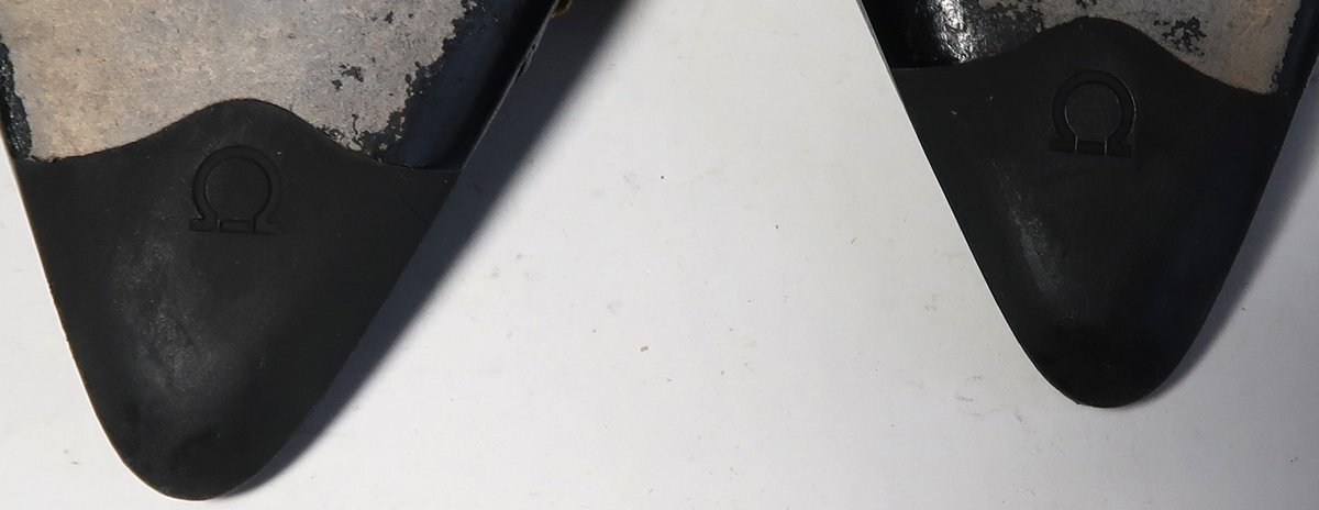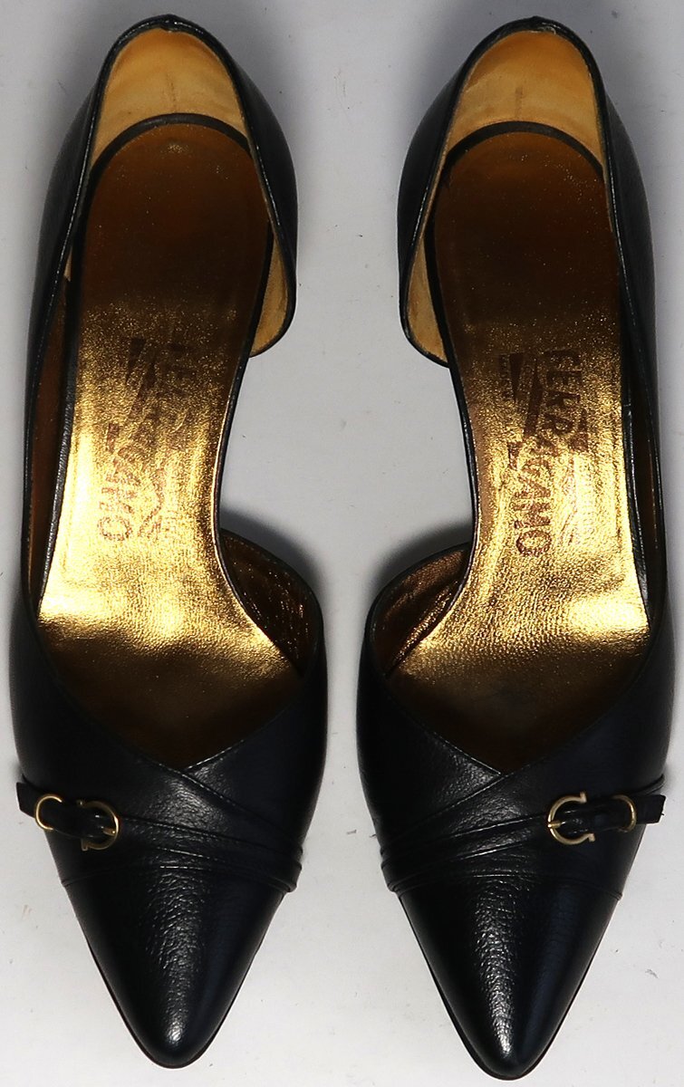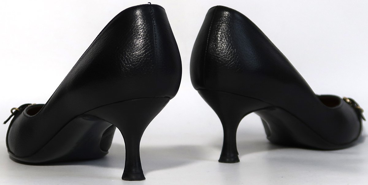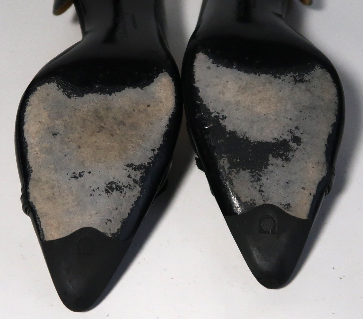 使用品ですので擦れや汚れはあります。色が黒いので特に目立つような汚れは無いです。インナーソール(ゴールドの部分)は擦れによる色落ちがあります。両方の靴の靴底の前部にひび割れがあります。おそらくはがれ落ちると思われます。剥がれた場合は直しが必要です。ヒール高は5cmくらいです。