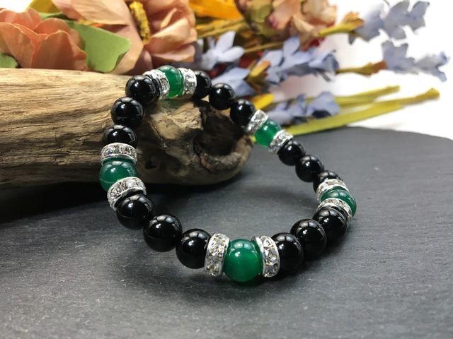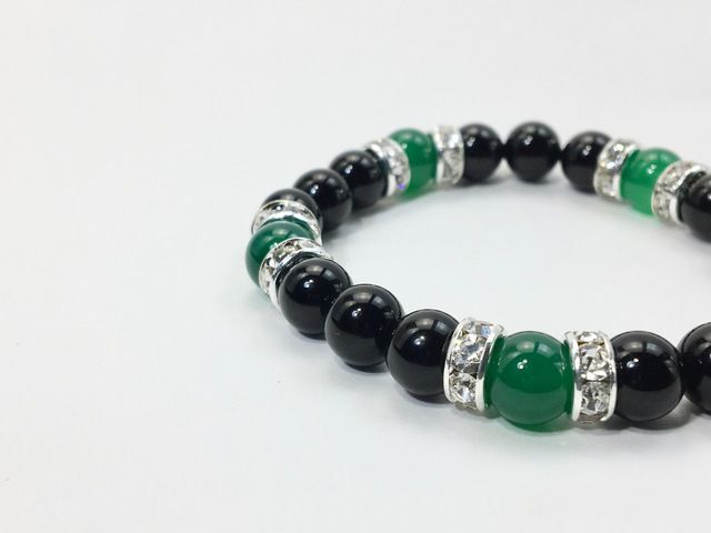 こちらは、8mm玉のオニキスと緑瑪瑙を使ったパワーストーンブレスレットです。シンプルなデザインでどんなコーディネートにも合わせやすいデザインに仕上げています。サイズは内周約15cmです。気になる方は是非この機会にどうぞ。