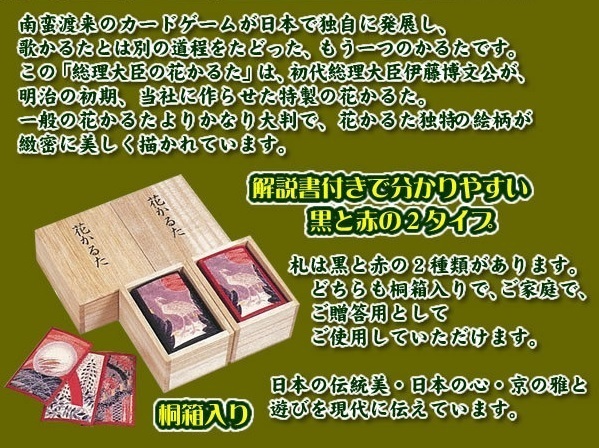 ◆ 総理大臣の花かるた 【黒】裏化粧箱入 ◆ 当該商品は 色:黒 の出品です。 お買い上げの色の変更はできませんのでご注意下さい。 他色は参考写真としてご覧くださいませ。 初代総理大臣伊藤博文公が、明治の初期、当社に作らせた特製の花かるた。 一般の花かるたより大判で、花かるた独特の絵柄が緻密に美しく描かれています。 ご家庭でまたはご贈答用としてどうぞ。 注:写真はイメージです。 【商品仕様】