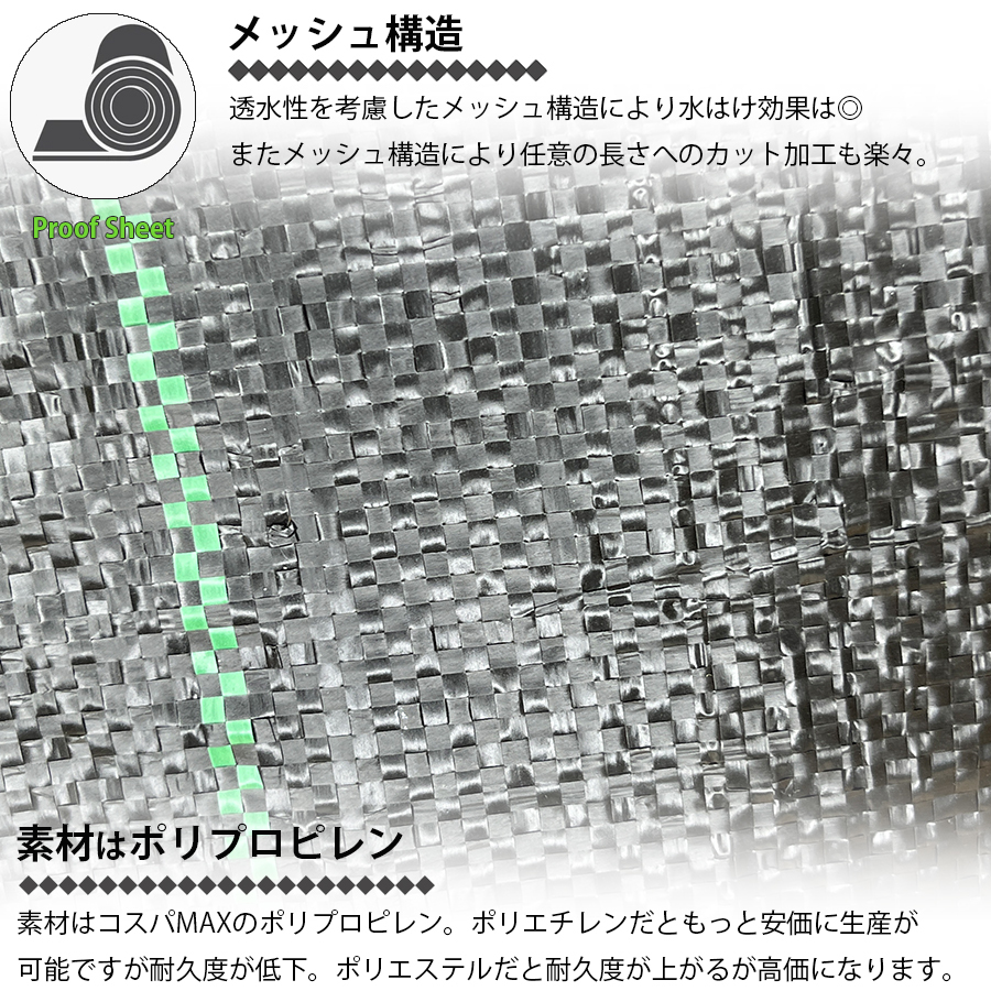 ・100g/m2の高密度防草シートになります。 ・当ストア従来品の比較で1.5倍の密度になります。 ・耐久年数はメーカーアナウンスで4年~6年。※使用環境・地域などによって前後します。 ・国産メーカーさんの品質を追随しながらコスパに優れた防草シートです。 ・除草剤などの化学物質を使用しないので安全・安心の雑草対策と言えます。 ・等間隔にラインが入っておりカットや敷く際に便利。 ・個人使用や建築資材・園芸資材などプロの方もご使用頂けるアイテムです。 ・品質を確保しつつコスパも考慮した防草シートをお探しの方にオススメです。 |
