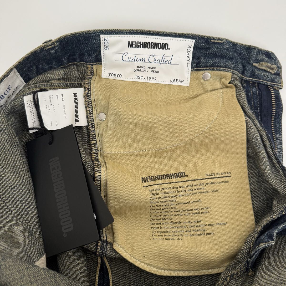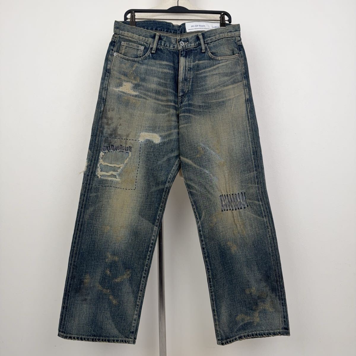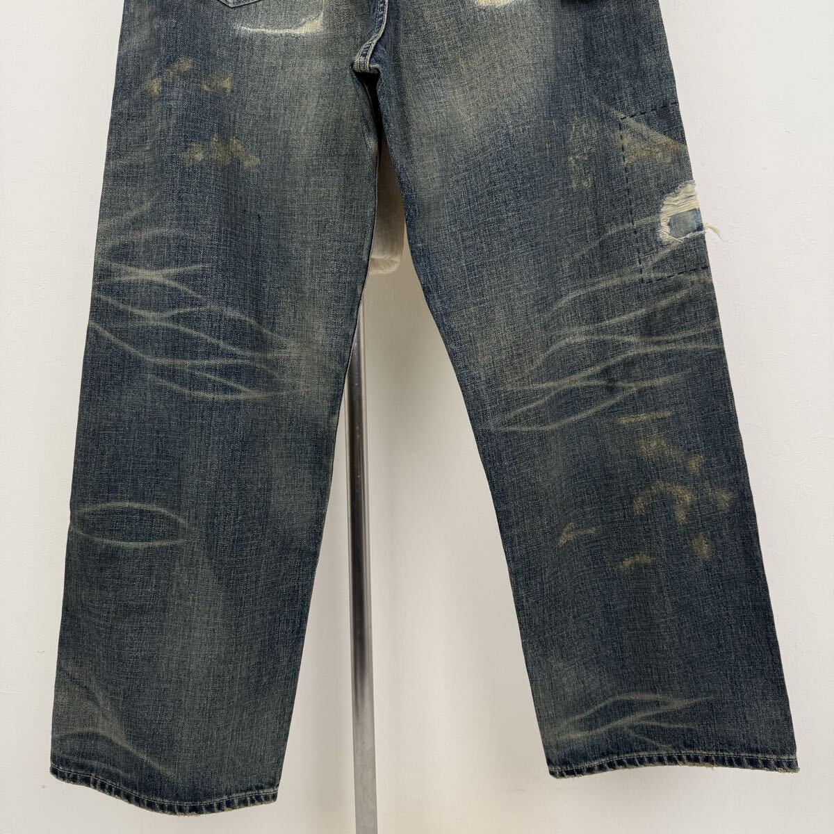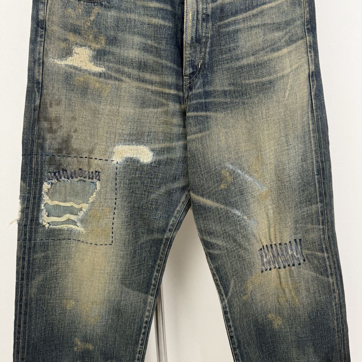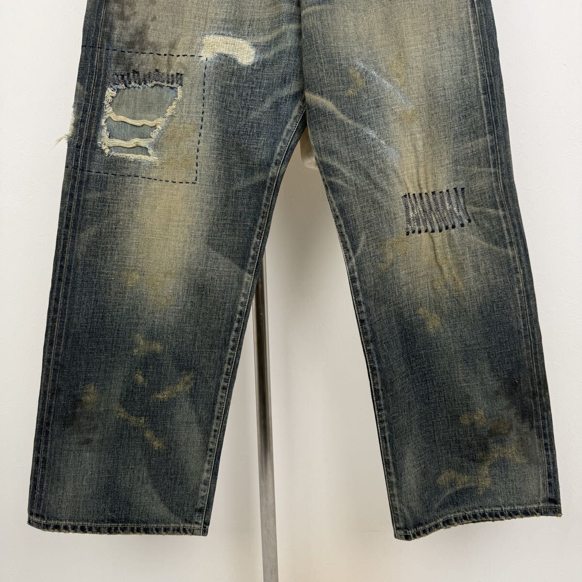 ハードな色落ちや裏当てへのウォッシュド加工、異なるピッチを使い分けたリメイク技法など、生地の脆化をイメージして施したリアルなエイジングが特徴。カスタムクラフテッドアイテム専用のサイズネームを付属。