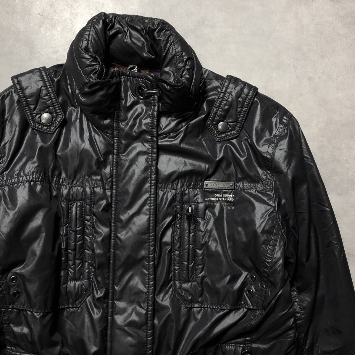 商品名 :WQ756●REPLAY:フード付き中綿ナイロンミリタリージャケット ●M●黒 裏地チェック リプレイ
