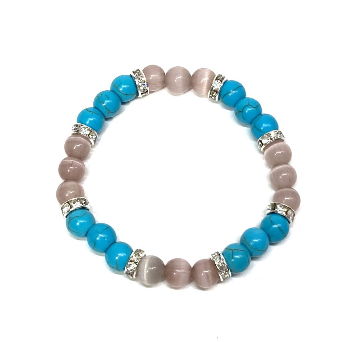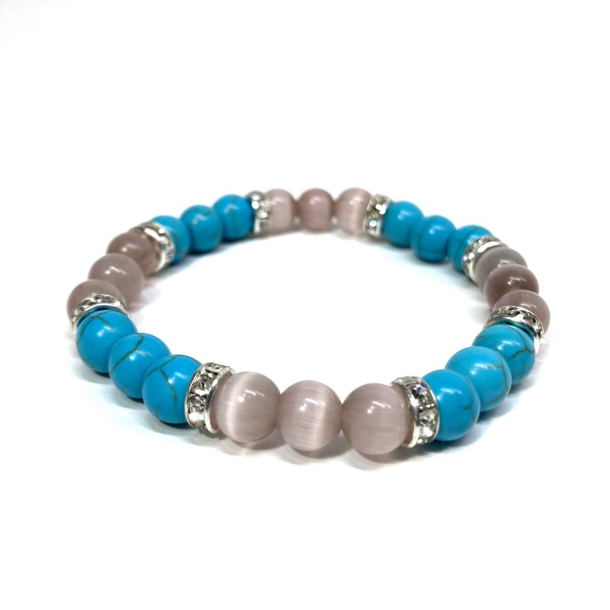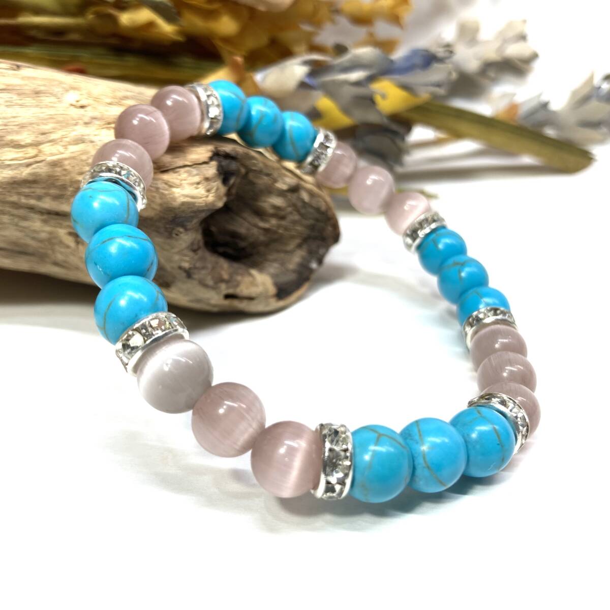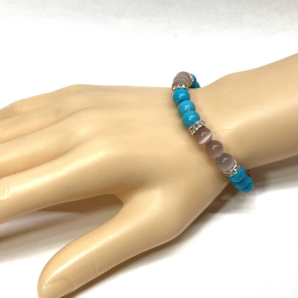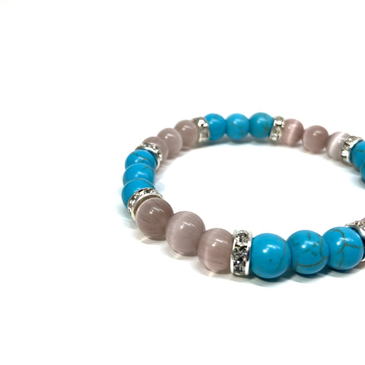こちらは、8mm玉のホワイトキャッツアイとターコイズを使用したパワーストーンブレスレットです。間にはロンデルを挟み高級感ある大人っぽいデザインに仕上がっています。内周約16cmです。気になる方は是非この機会にどうぞ。