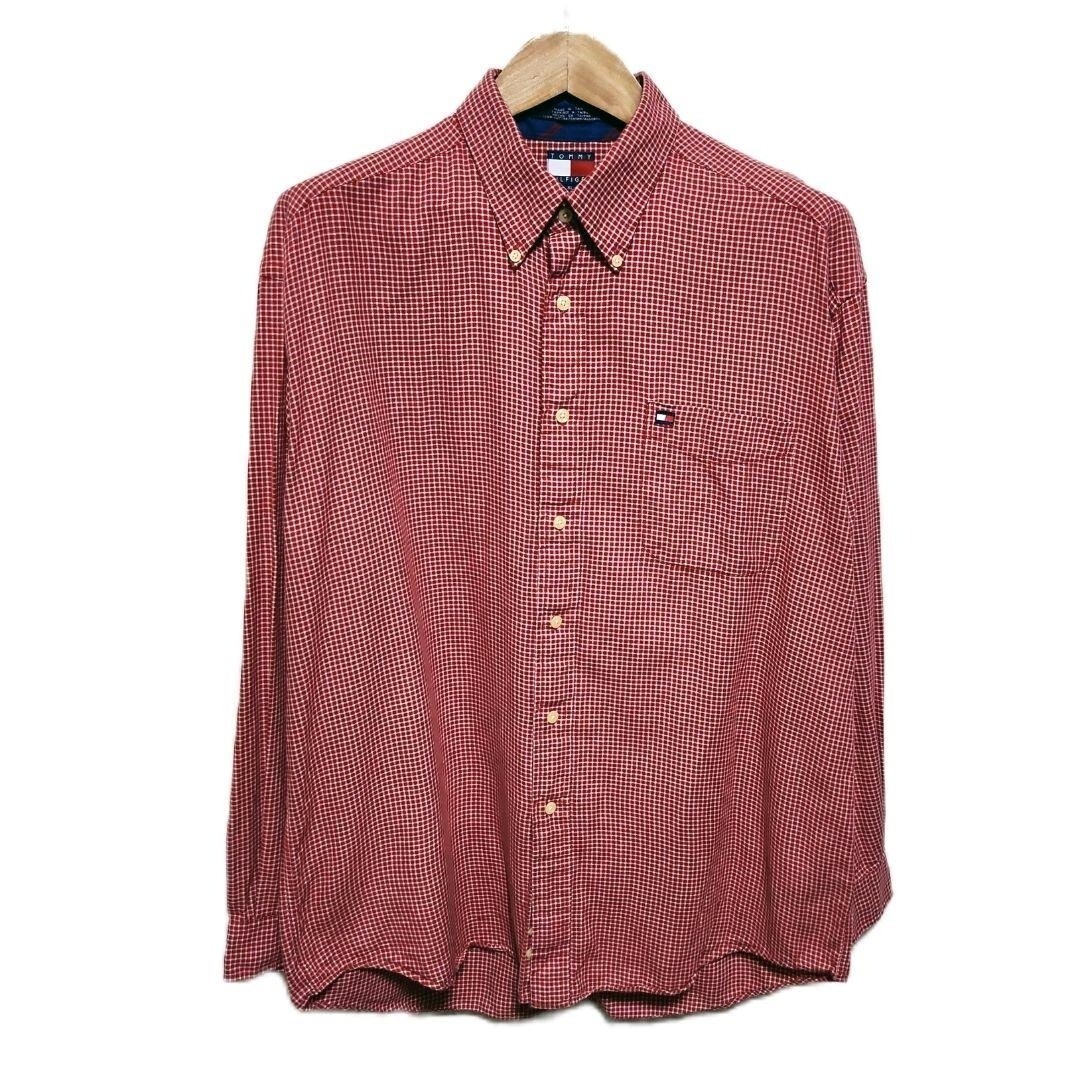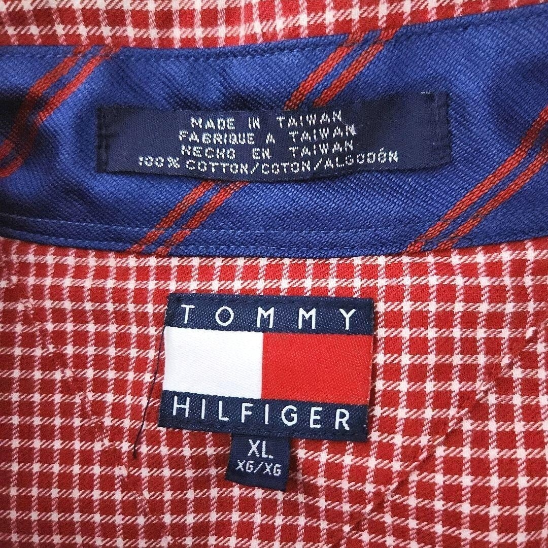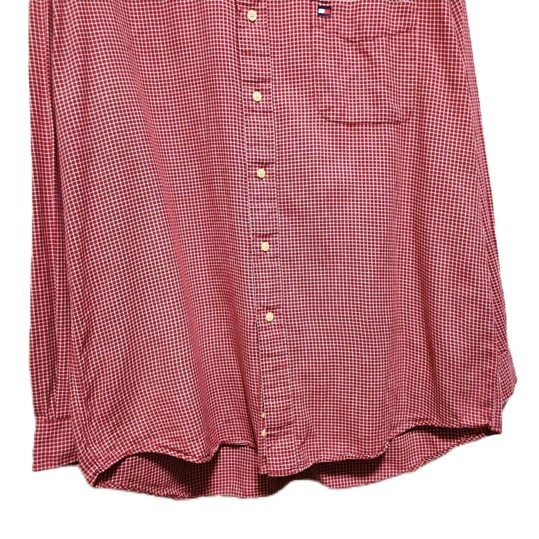 90s TOMMY HILFIGER 赤白チェック 長袖ボタンダウンシャツ XL
