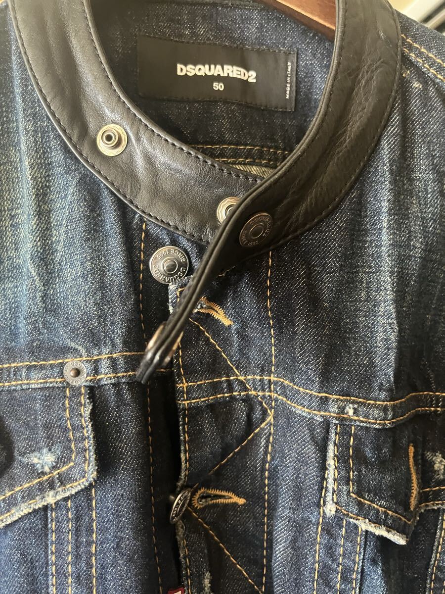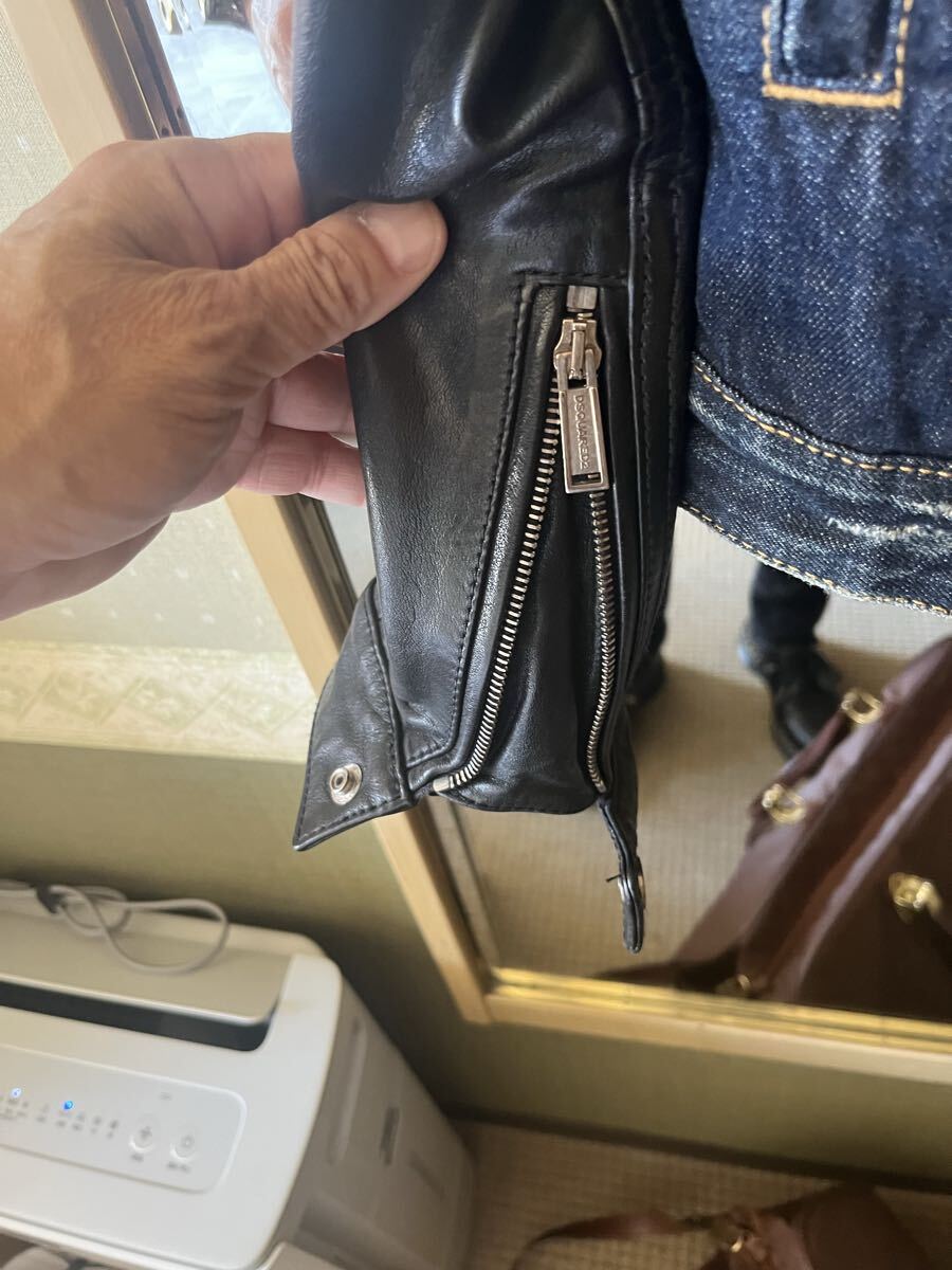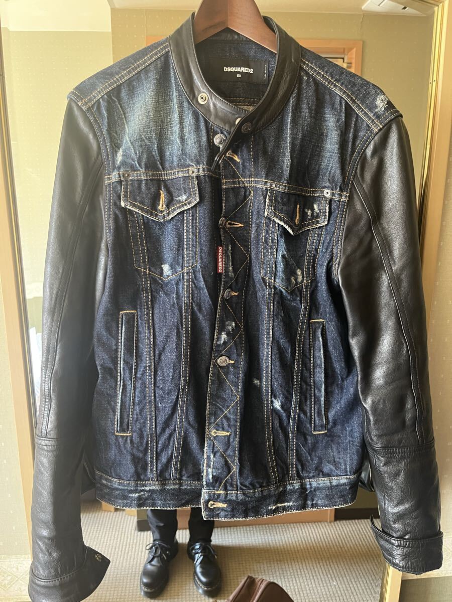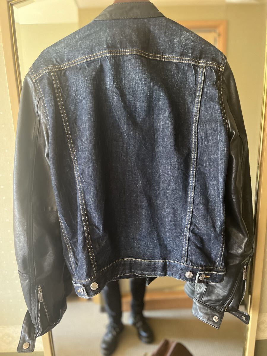 袖レザー、zip、クラッシュ加工のデニムJKです。