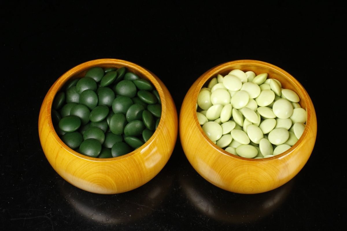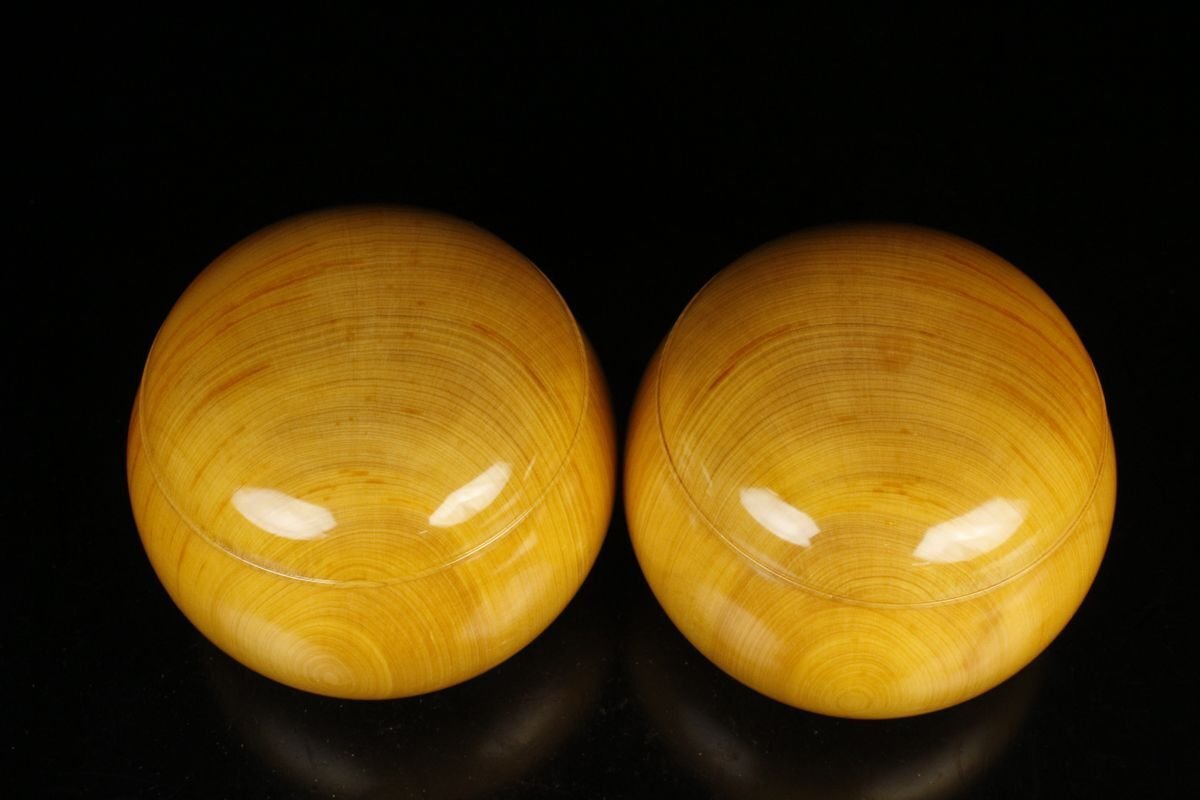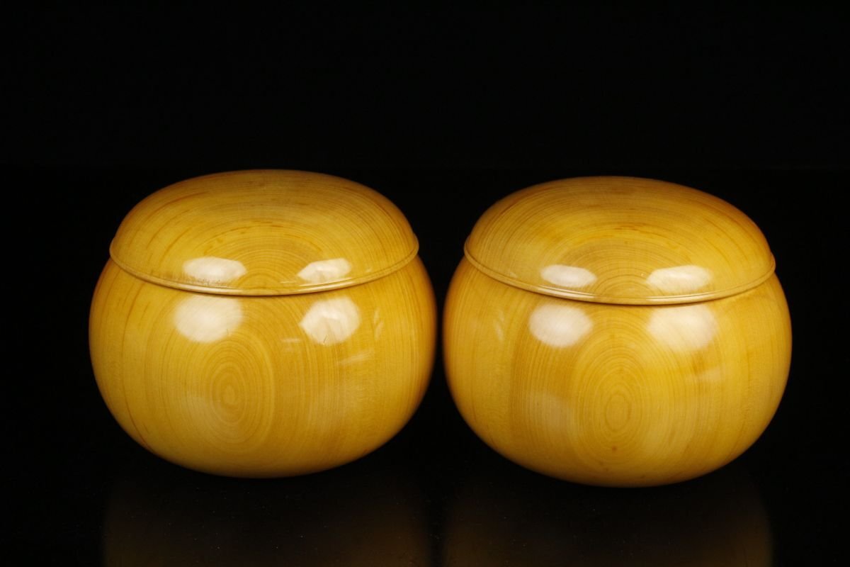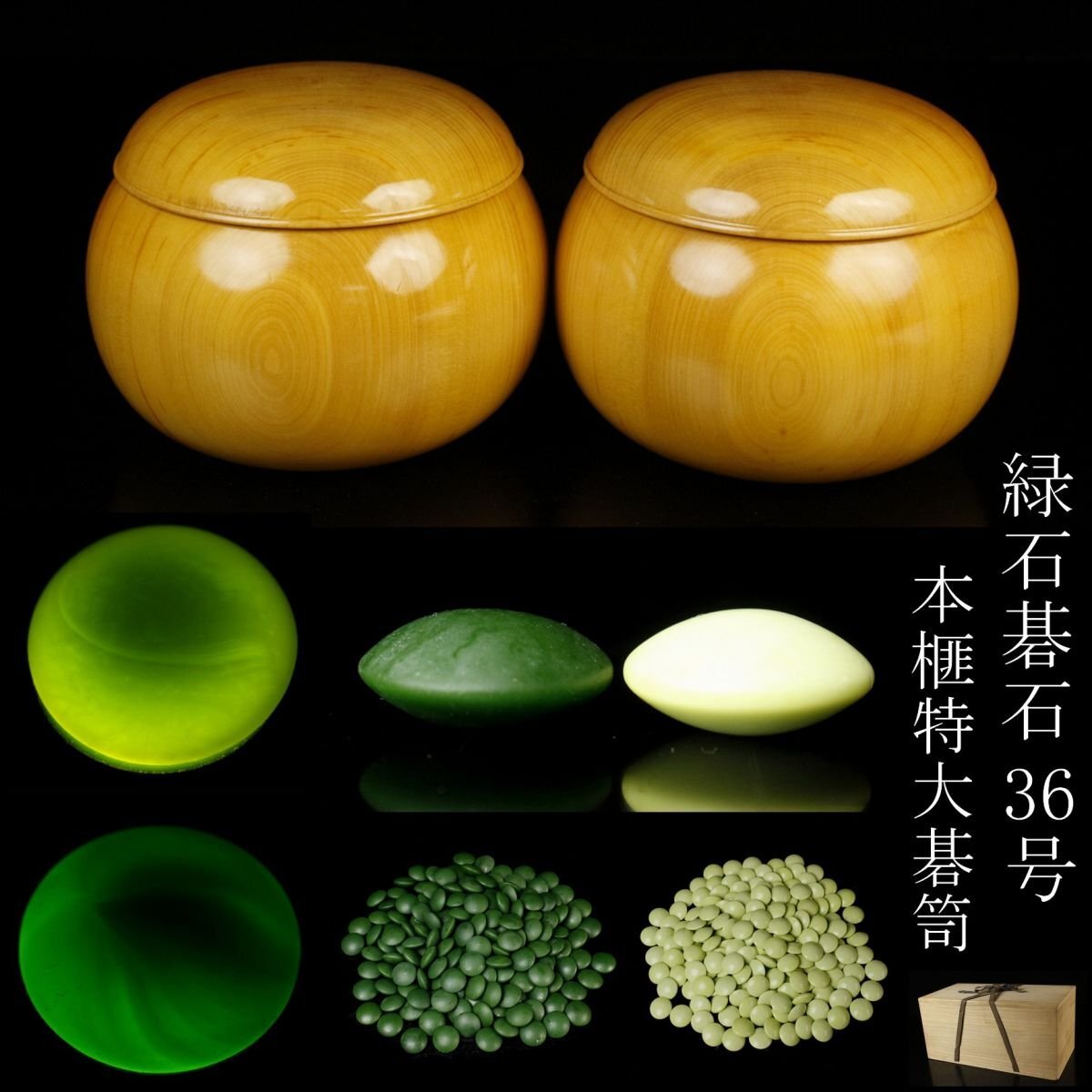 * * * 商品詳細 * * * ここでしか出逢うことのできない唯一の美をご紹介させて頂きます。 優しくも鮮やかな色彩が麗しい碁石のご紹介です。 一般的な白と黒とは異なる神秘的な色彩は特別感があり魅力的です。 眺めているだけでもその美しさに釘付けになりそうです。 本榧の碁笥は濃い香りを纏い、その大きさにも迫力があります。 一風変わった逸品をこの機会に是非お求めください。 ■商品内容/碁石 緑181点、黄緑180点、碁笥、箱 ■サイズ/碁石厚み8.9㎜~10.6㎜ 碁笥:横14㎝×縦10.5㎝ 箱:横37㎝×縦17.5㎝×奥行19㎝ ■状態/スレ、小キズ、箱にスレ、キズ、シミがございます。 ※写真にてご確認、ご了承の上ご入札下さい。