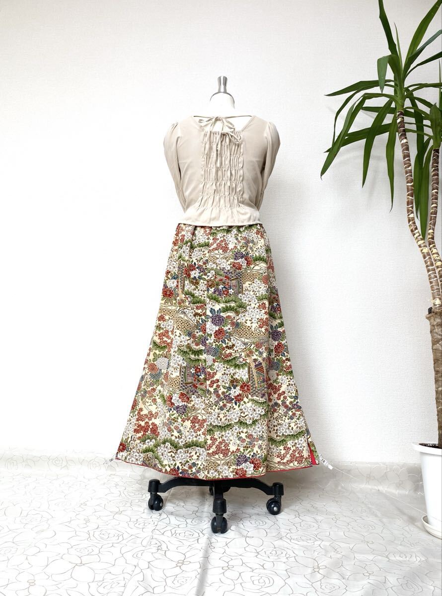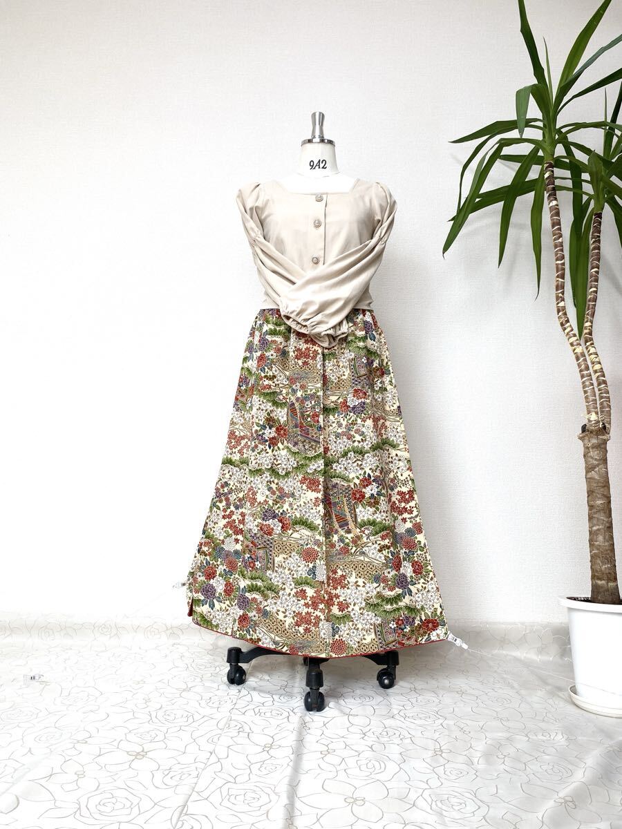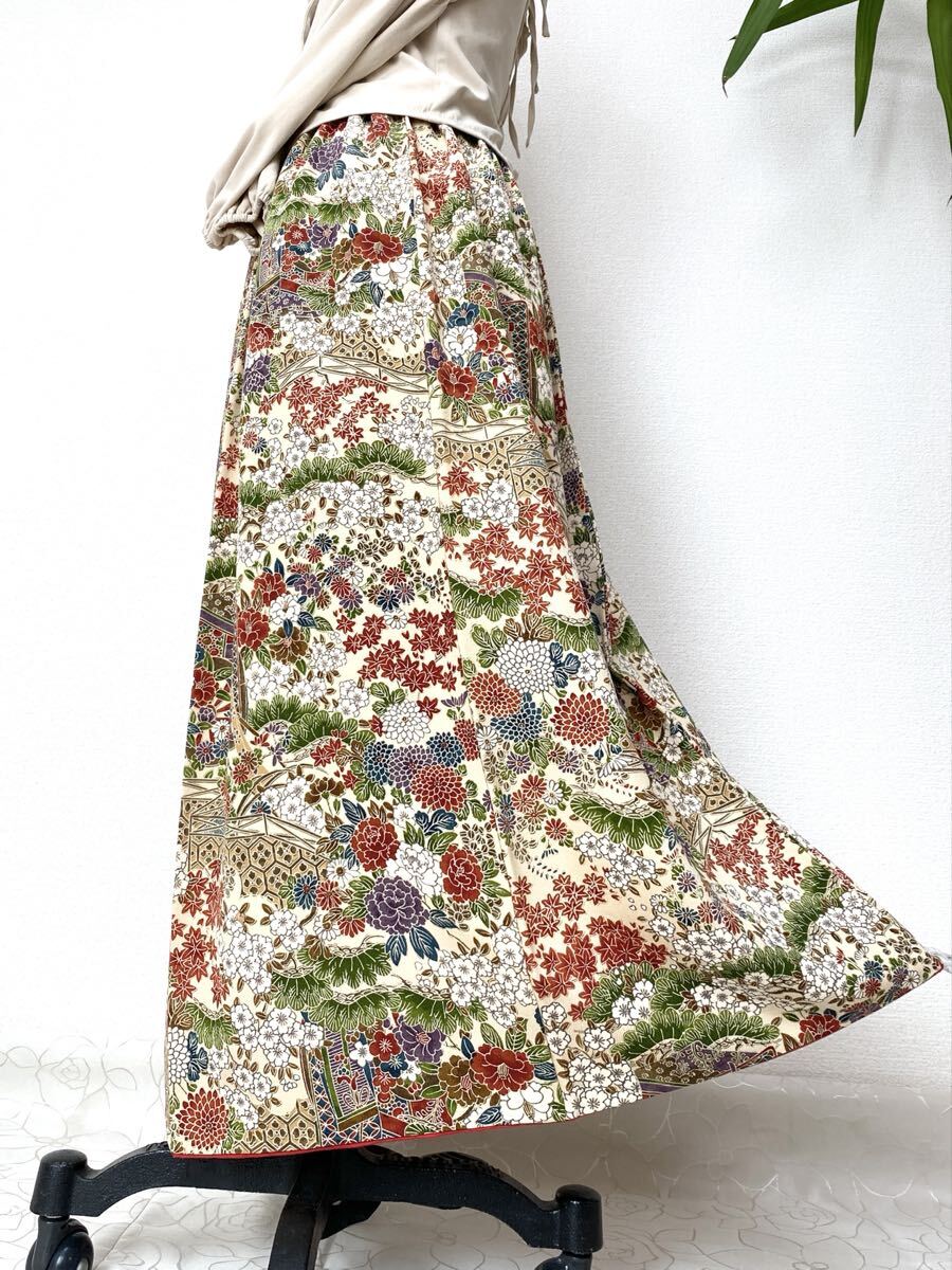着物をリメイクして作製したウエストゴムロングドレススカートフリーサイズです