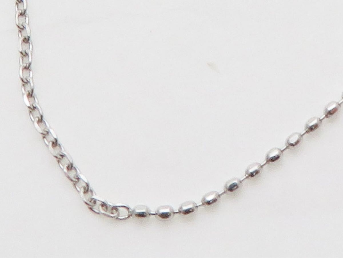 片側は丸みのある優しい印象のボールチェーン、もう片側はすっきりとしたアズキチェーンになっており、一本で異なる表情を楽しめる個性的なデザインです。