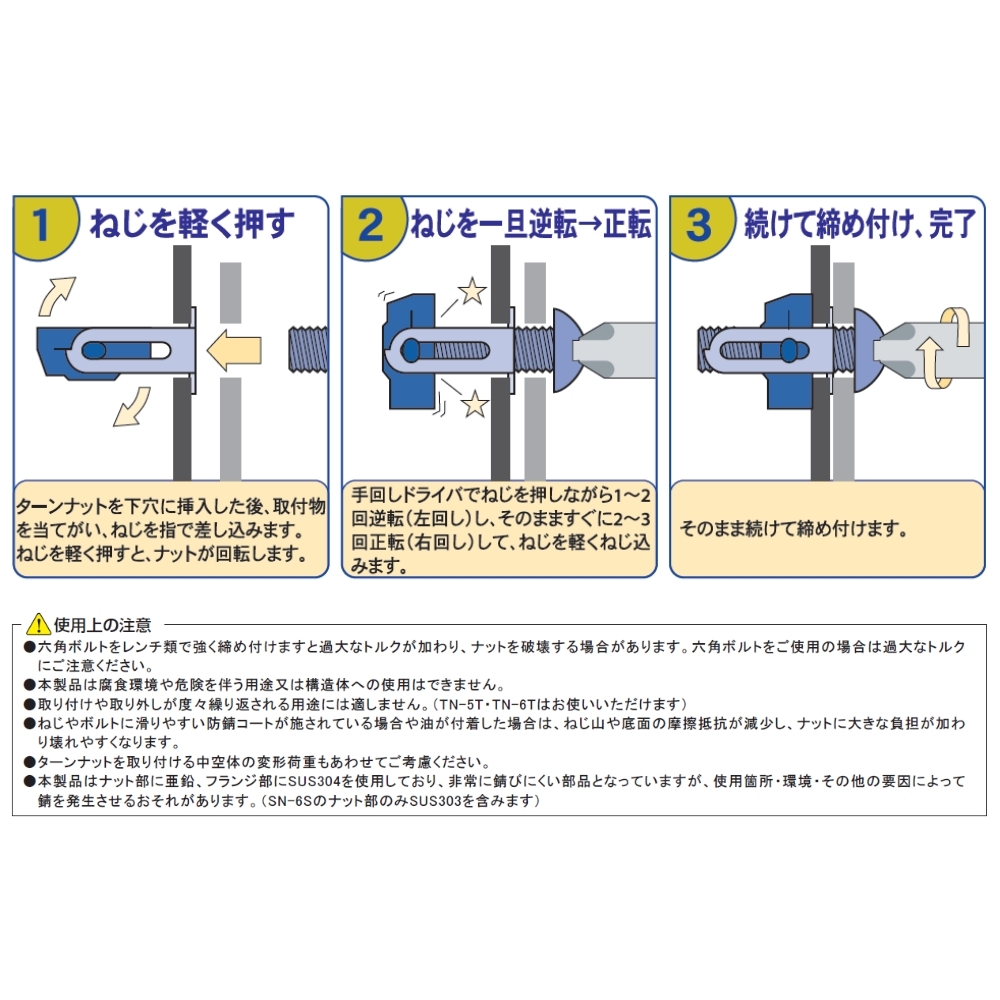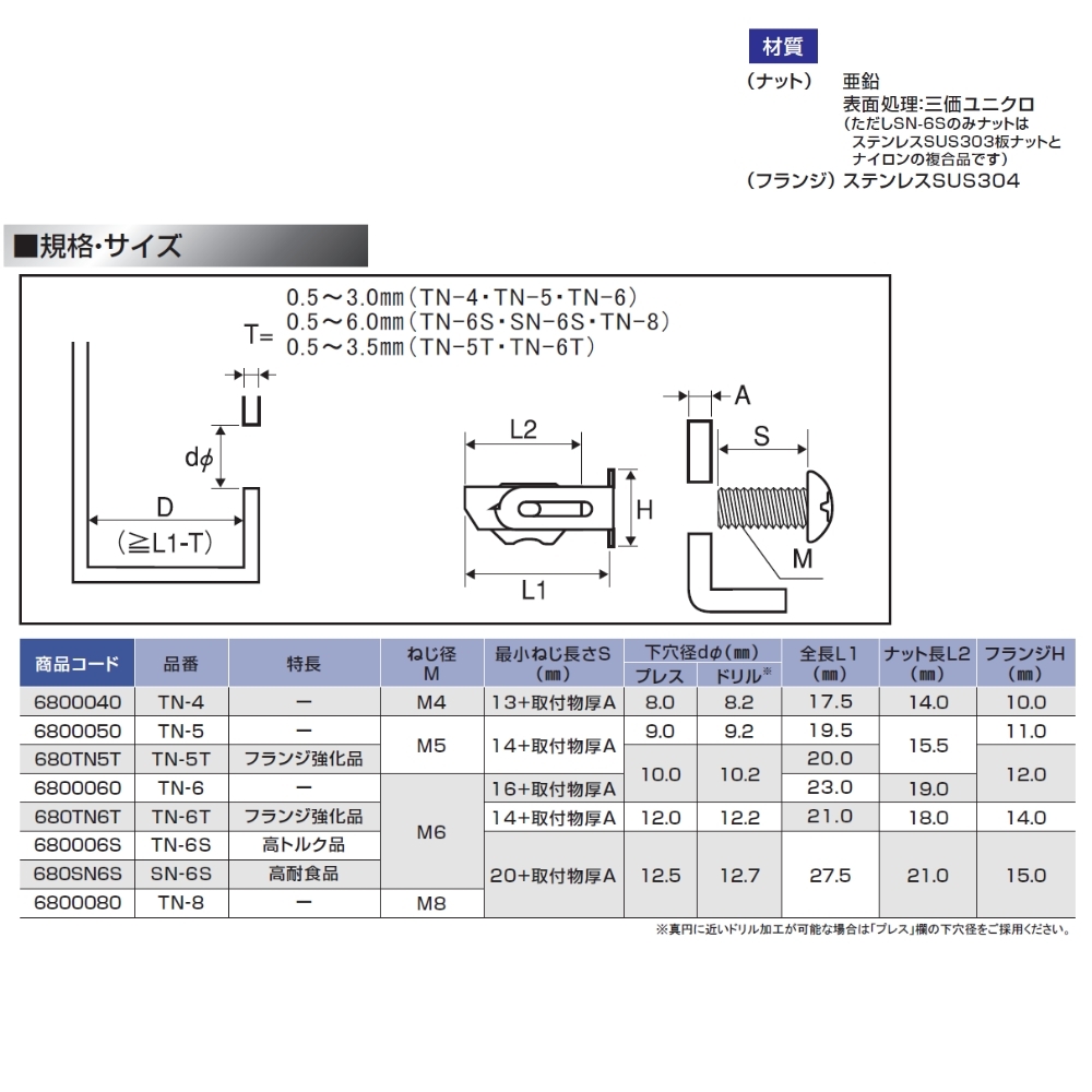 サビに配慮した材質:ナット部=亜鉛(三価ユニクロ)、フランジ部=SUS304(※SN-6Sのナット部はSUS303+ナイロン複合)。
