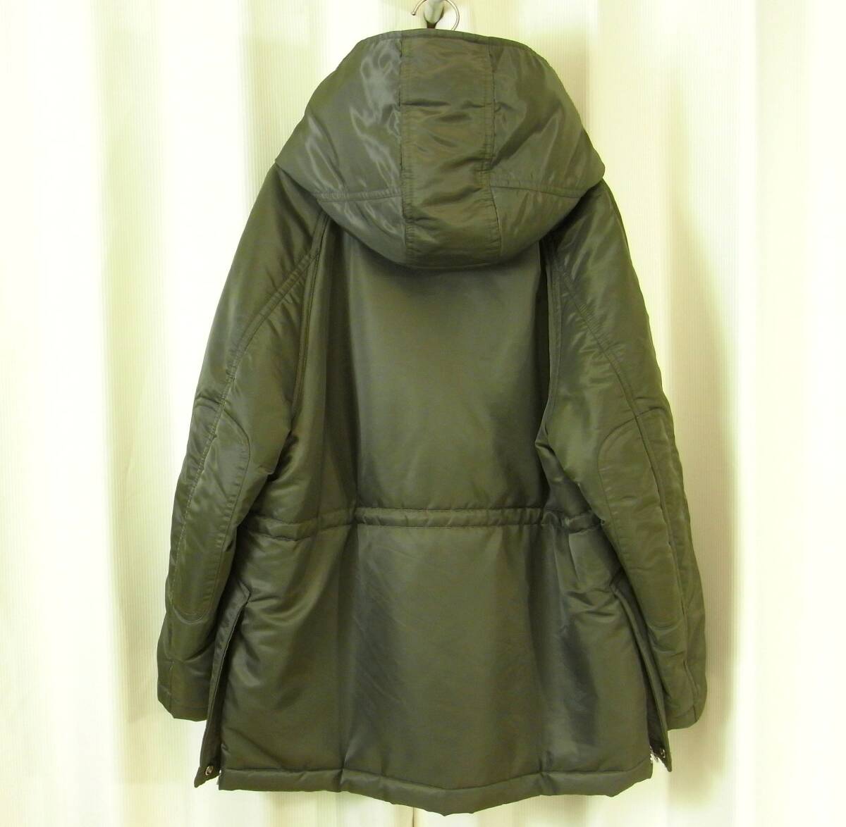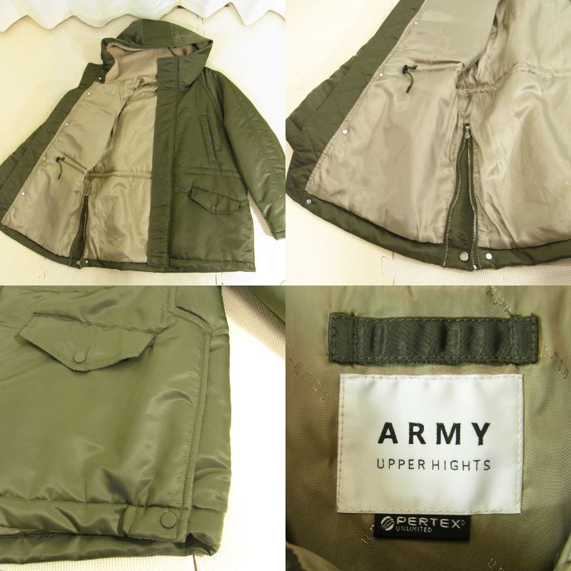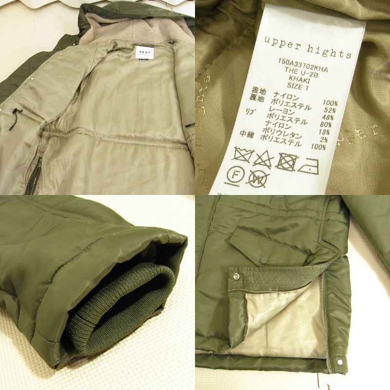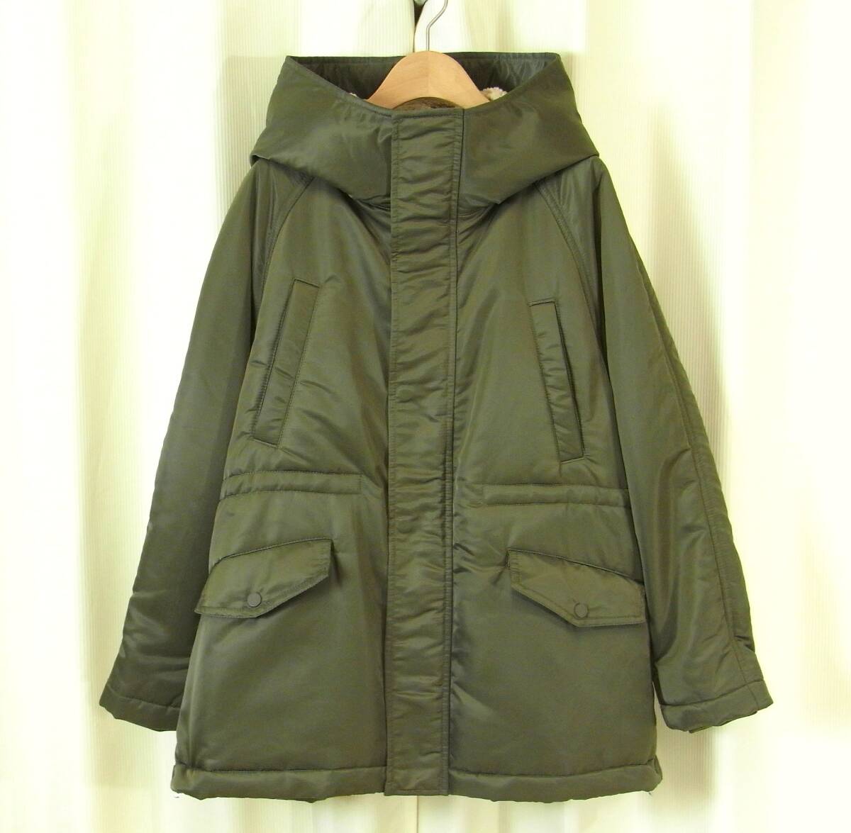 upper hights アッパーハイツ モッズコート 中綿入りナイロンジャンパー カーキ サイズ1 シンプルな形のモッズコートです。 合わせやすいカーキのお色です。 丈夫なナイロン素材で、暖かな中綿入りになります。 両サイドのすそにスリットが入っており、チャックで開閉できます。 またウエストの絞り具合を内側のヒモで調整できます。 袖は中にリブがあり、より暖かく着ていただけると思います。 寒い時期にいかがでしょうか。 丈:約76センチ 身幅:約68センチ(脇の下) 表地 ナイロン100% 裏地 ポリエステル52% レーヨン48% リブ ポリエステル80% ナイロン18% ポリウレタン2% 中綿 ポリエステル100% | ||