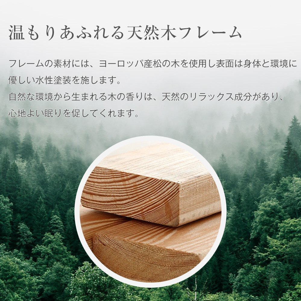 温もりあふれる天然木フレーム フレームの素材には、ヨーロッパ産松の木を使用し表面は身体と環境に優しい水性塗装を施します。
