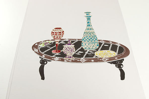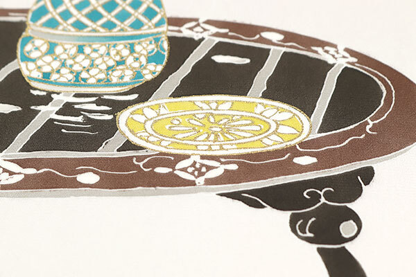 お太鼓や胴部分には、薩摩切子の施されたテーブルや食器の模様が染められております。